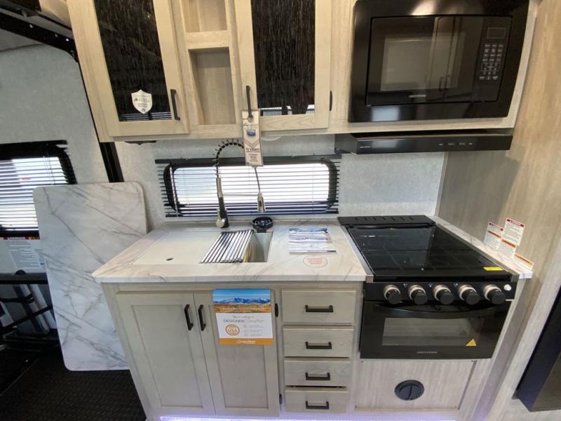 Each Alta travel trailer or toy hauler by EAST TO WEST is constructed with a 5" vacuum bonded roof, an enclosed and heated underbelly, and diamond plate front rock guard for added protection. Outside, you'll find marine-grade exterior speakers, a universal docking station, and back-up camera prep that can be added to make maneuvering in and out of campgrounds easier than ever. Inside, there are 4k interior LED lights, solid pressed membrane countertops, black roller shades, and many more interior comforts you are sure to love.