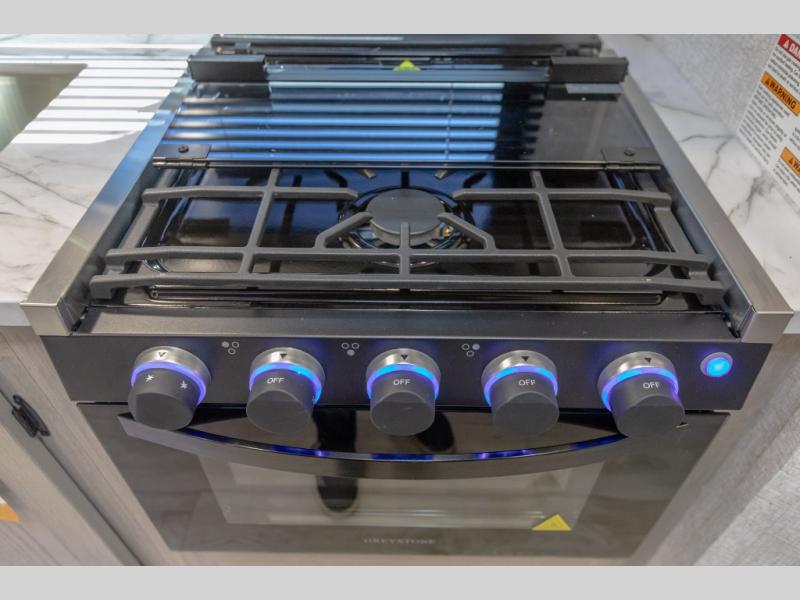 Each Alta travel trailer or toy hauler by EAST TO WEST is constructed with a 5" vacuum bonded roof, an enclosed and heated underbelly, and diamond plate front rock guard for added protection. Outside, you'll find marine-grade exterior speakers, a universal docking station, and back-up camera prep that can be added to make maneuvering in and out of campgrounds easier than ever. Inside, there are 4k interior LED lights, solid pressed membrane countertops, black roller shades, and many more interior comforts you are sure to love.