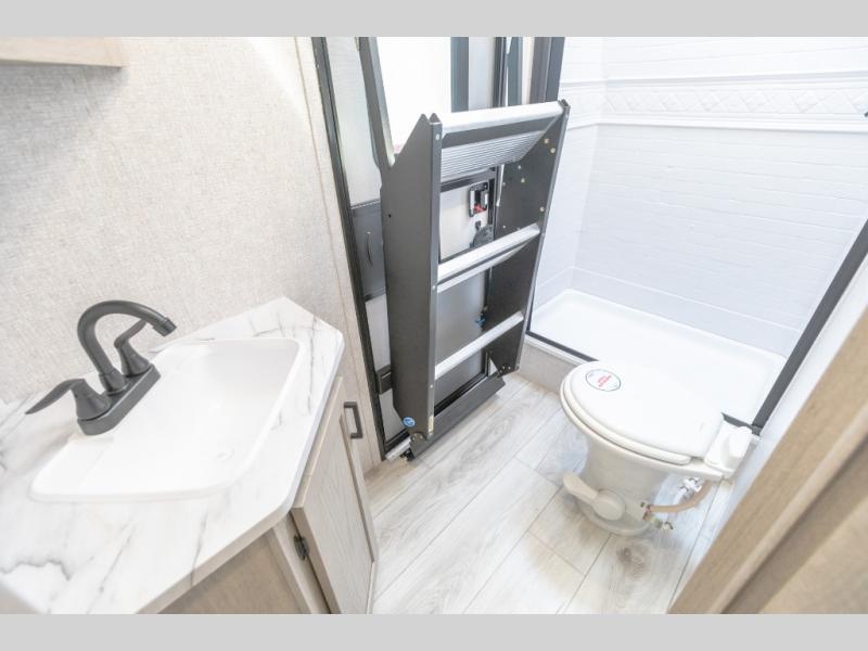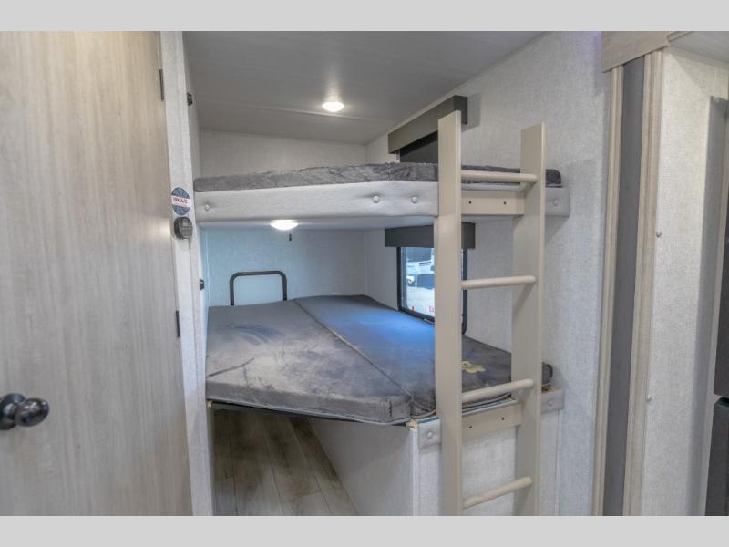 You can comfortably sleep four to six in this travel trailer thanks to the rear double bunk beds and a king bed. There is also additional storage where you will find plenty of space as well as in the overhead cabinets and dual wardrobes and night stands. The combined living area and kitchen includes a large slide for more space, and a booth dinette with an optional free-standing dinette. Great accessibility thanks to the two entry doors. In the exterior, there is also a 21´ awning and a Kayak door, especially for the adventurous ones! finally after a long day take a comfortable and relaxing shower in our full rear bathroom.