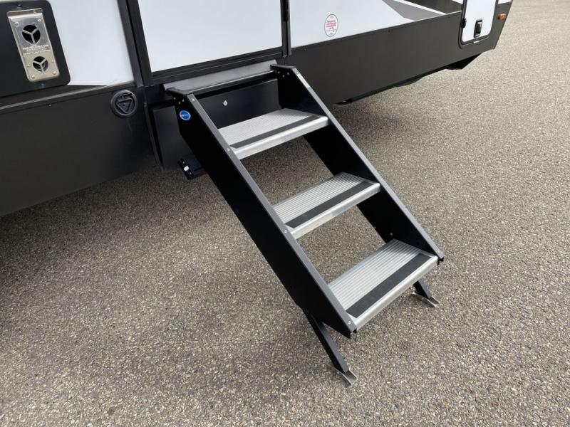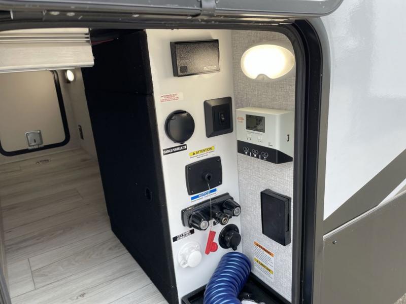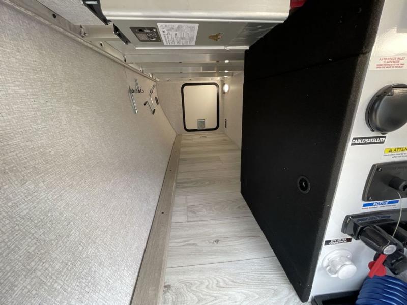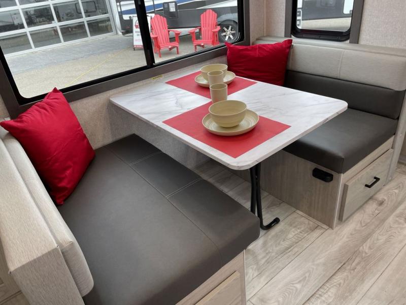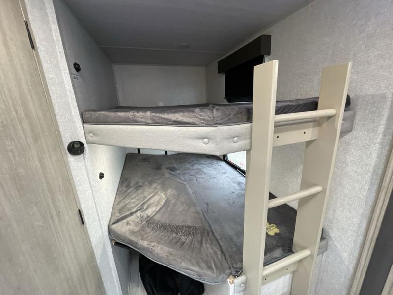 You can comfortably sleep four to six in this travel trailer thanks to the rear double bunk beds and a king bed. There is also additional storage where you will find plenty of space as well as in the overhead cabinets and dual wardrobes and night stands. The combined living area and kitchen includes a large slide for more space, and a booth dinette with an optional free-standing dinette. Great accessibility thanks to the two entry doors. In the exterior, there is also a 21´ awning and a Kayak door, especially for the adventurous ones! finally after a long day take a comfortable and relaxing shower in our full rear bathroom.