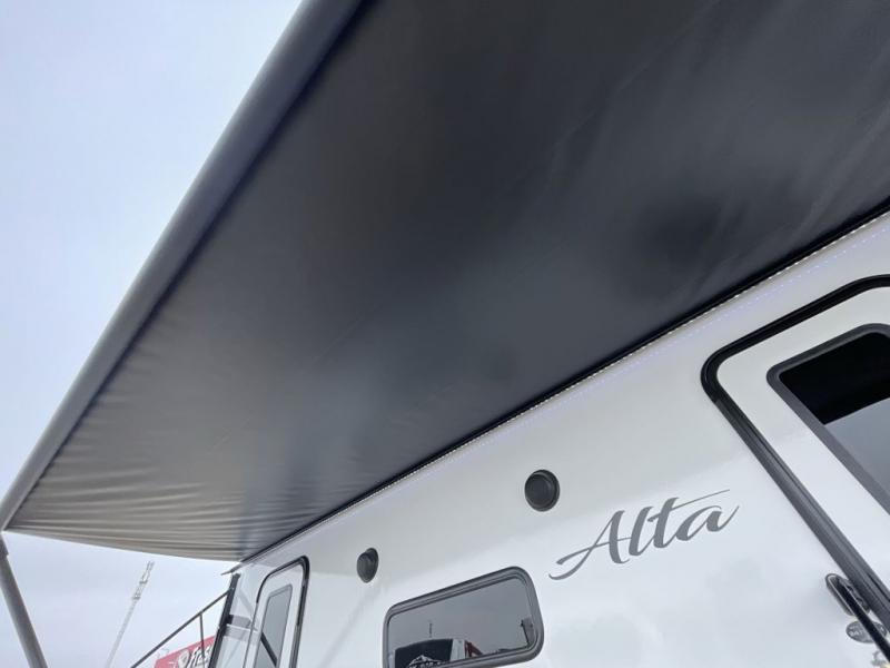 Each Alta travel trailer or toy hauler by EAST TO WEST is constructed with a 5" vacuum bonded roof, an enclosed and heated underbelly, and diamond plate front rock guard for added protection. Outside, you'll find marine-grade exterior speakers, a universal docking station, and back-up camera prep that can be added to make maneuvering in and out of campgrounds easier than ever. Inside, there are 4k interior LED lights, solid pressed membrane countertops, black roller shades, and many more interior comforts you are sure to love.