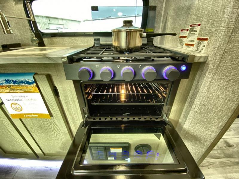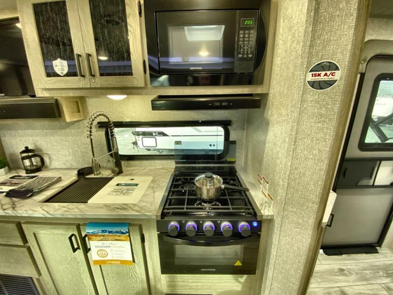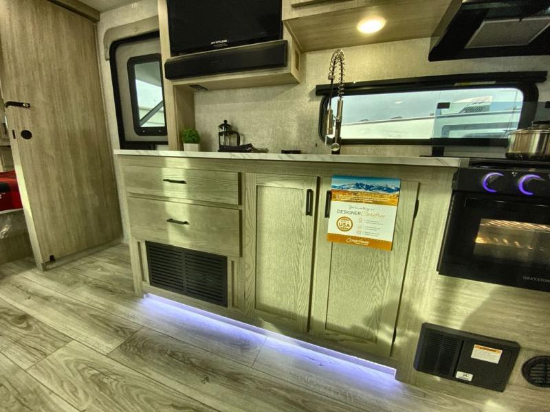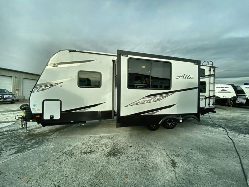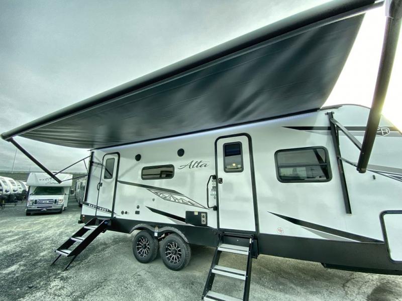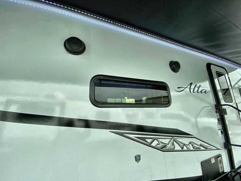 Each Alta travel trailer or toy hauler by EAST TO WEST is constructed with a 5" vacuum bonded roof, an enclosed and heated underbelly, and diamond plate front rock guard for added protection. Outside, you'll find marine-grade exterior speakers, a universal docking station, and back-up camera prep that can be added to make maneuvering in and out of campgrounds easier than ever. Inside, there are 4k interior LED lights, solid pressed membrane countertops, black roller shades, and many more interior comforts you are sure to love.