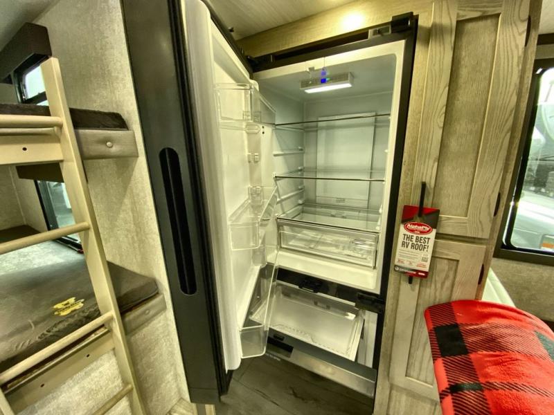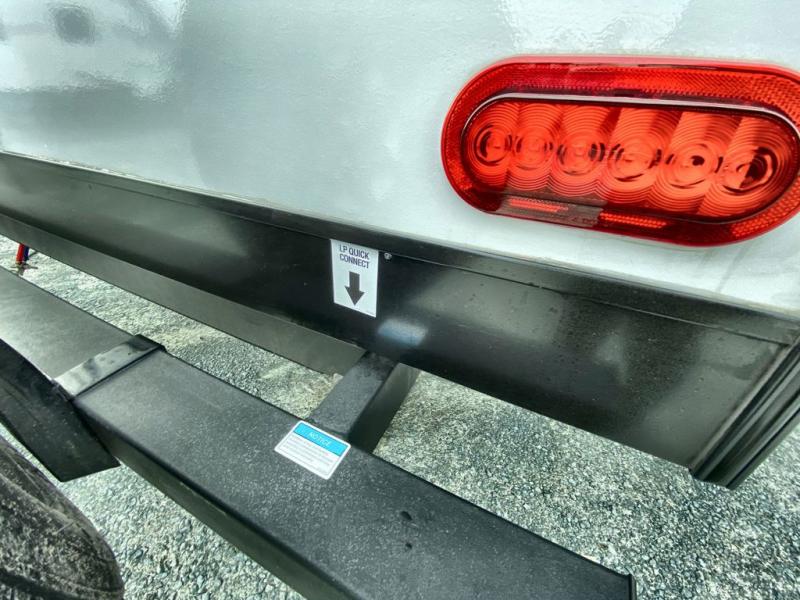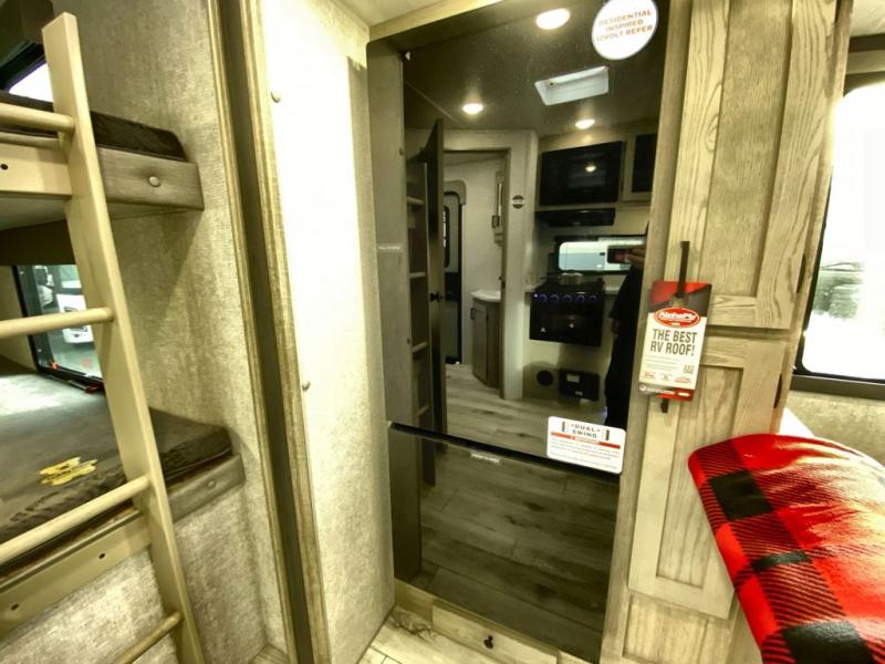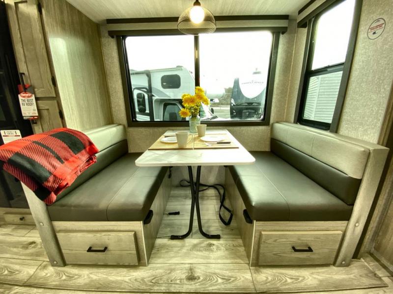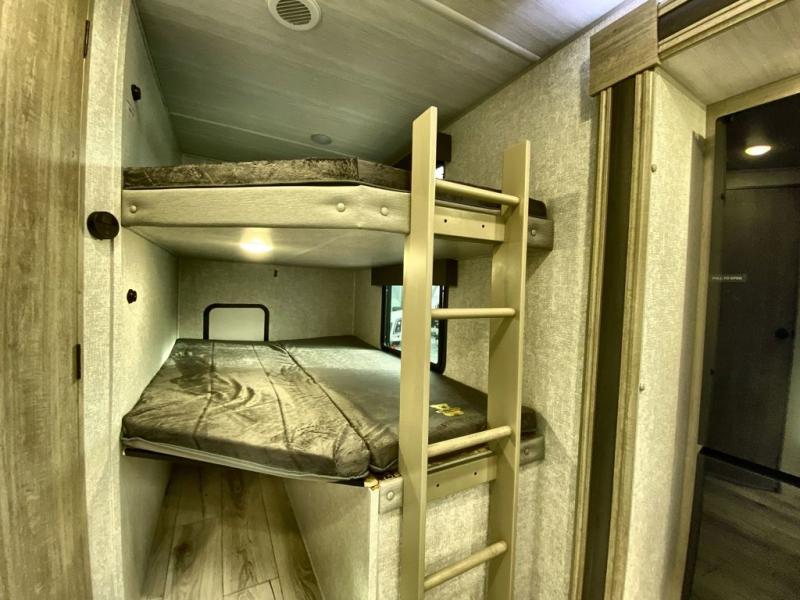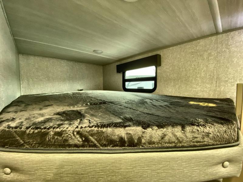 You can comfortably sleep four to six in this travel trailer thanks to the rear double bunk beds and a king bed. There is also additional storage where you will find plenty of space as well as in the overhead cabinets and dual wardrobes and night stands. The combined living area and kitchen includes a large slide for more space, and a booth dinette with an optional free-standing dinette. Great accessibility thanks to the two entry doors. In the exterior, there is also a 21´ awning and a Kayak door, especially for the adventurous ones! finally after a long day take a comfortable and relaxing shower in our full rear bathroom.