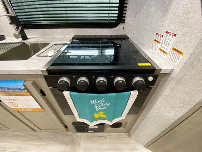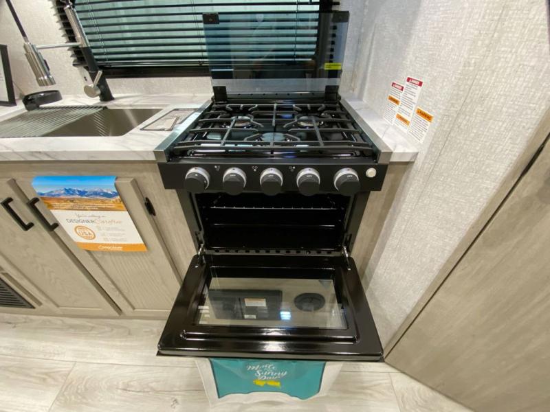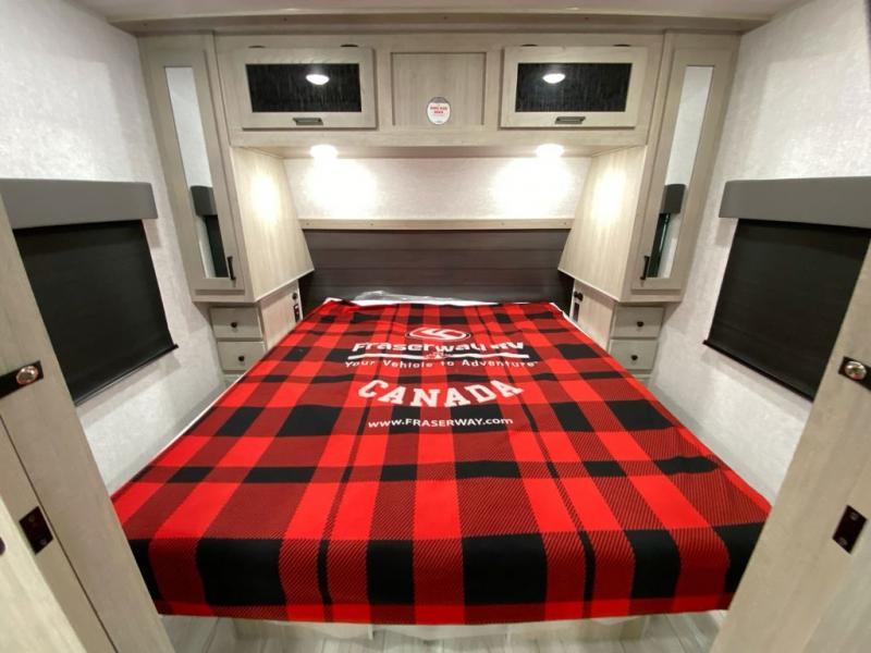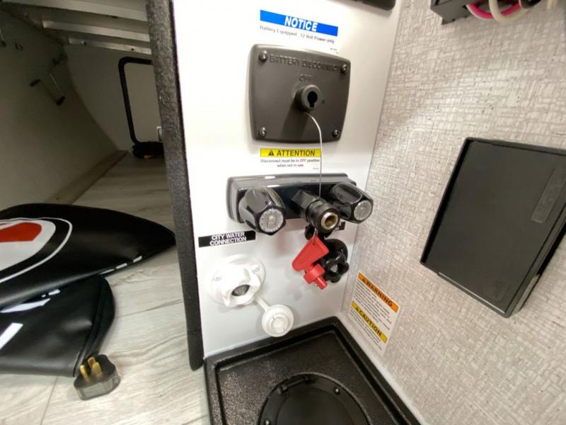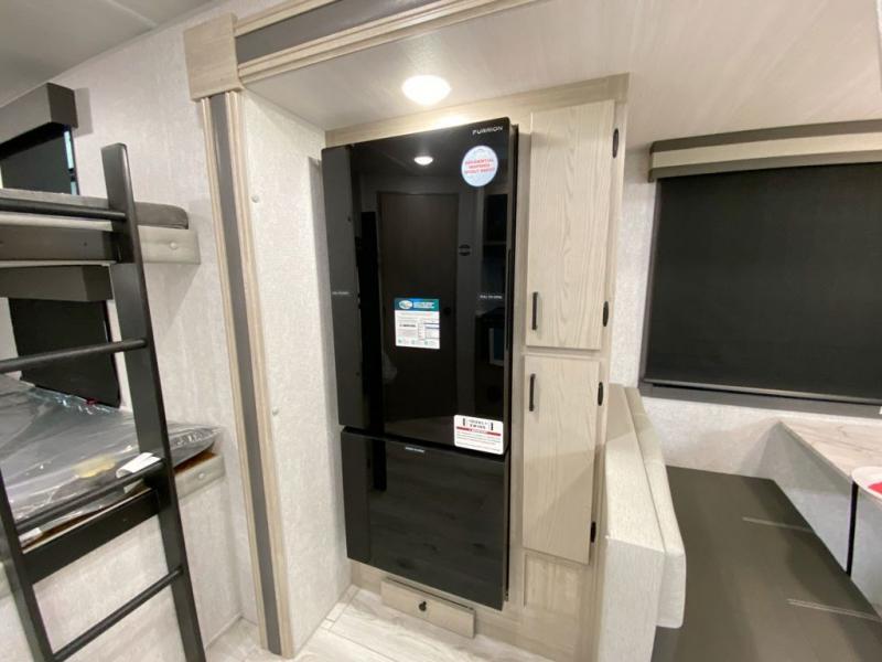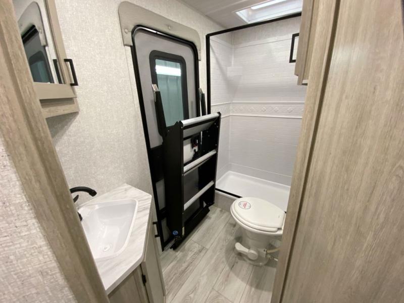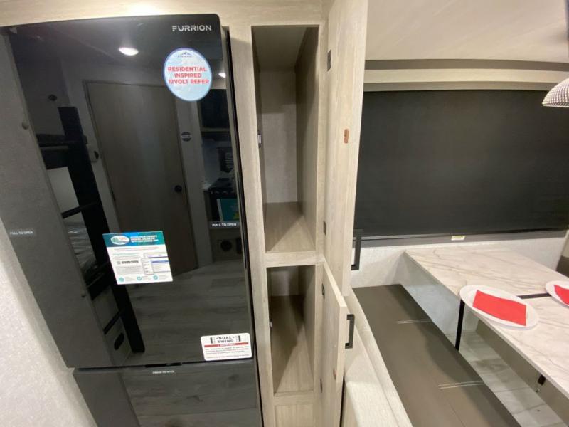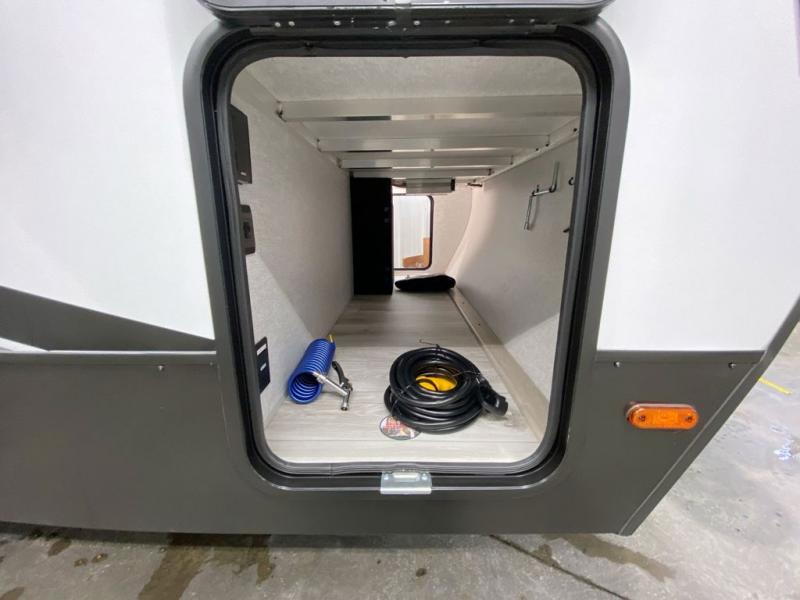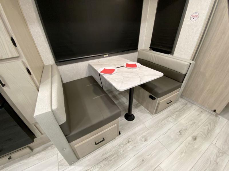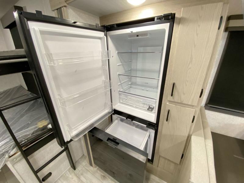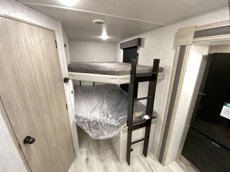You can comfortably sleep four to six in this travel trailer thanks to the rear double bunk beds and a king bed. There is also additional storage where you will find plenty of space as well as in the overhead cabinets and dual wardrobes and night stands. The combined living area and kitchen includes a large slide for more space, and a booth dinette with an optional free-standing dinette. Great accessibility thanks to the two entry doors. In the exterior, there is also a 21´ awning and a Kayak door, especially for the adventurous ones! finally after a long day take a comfortable and relaxing shower in our full rear bathroom.