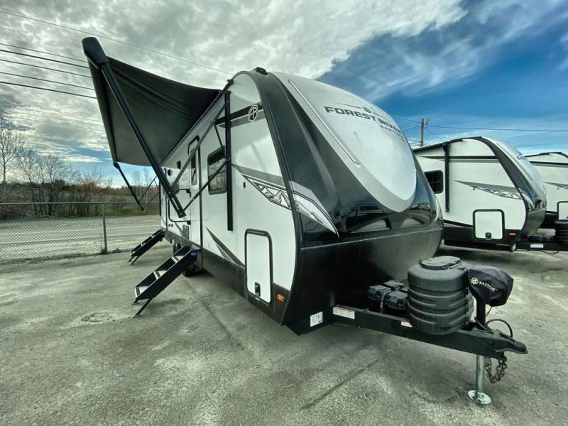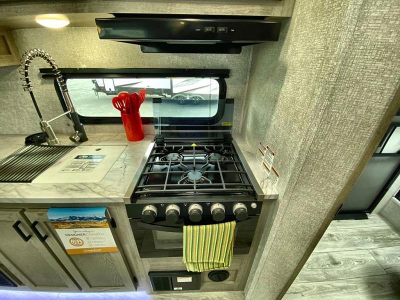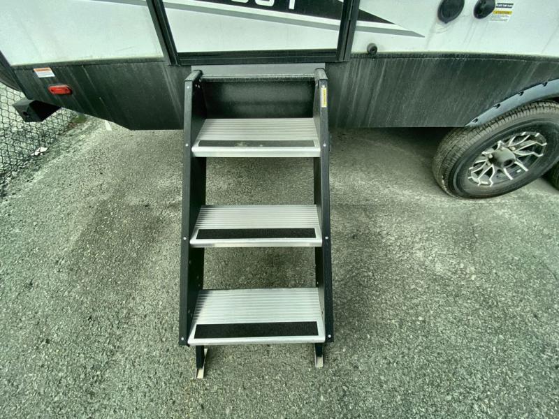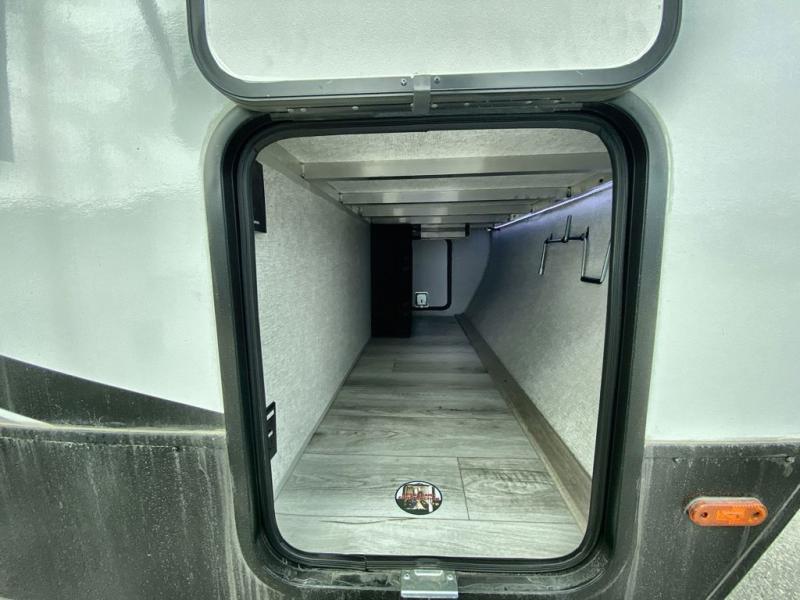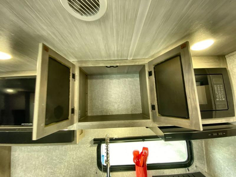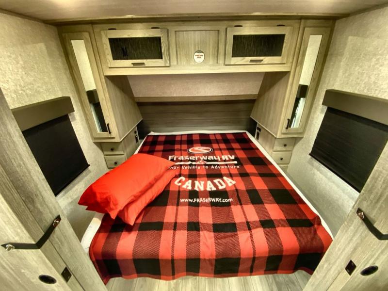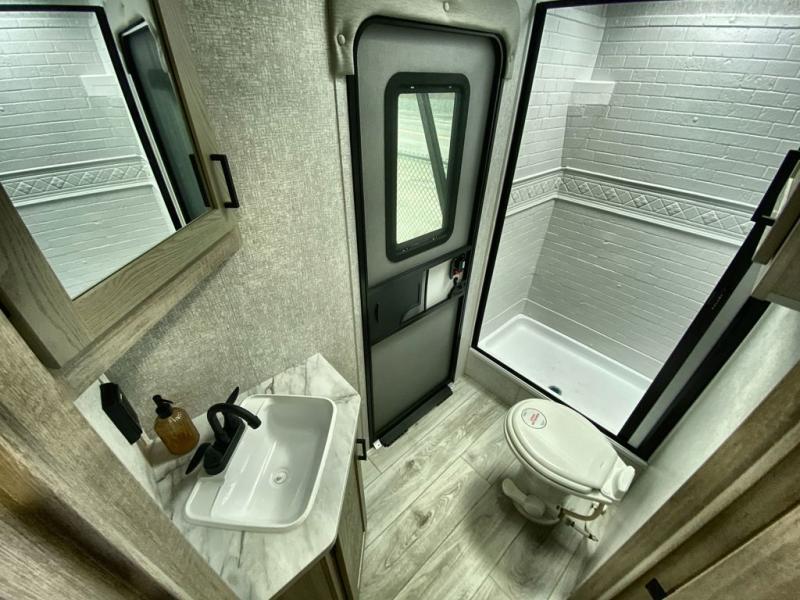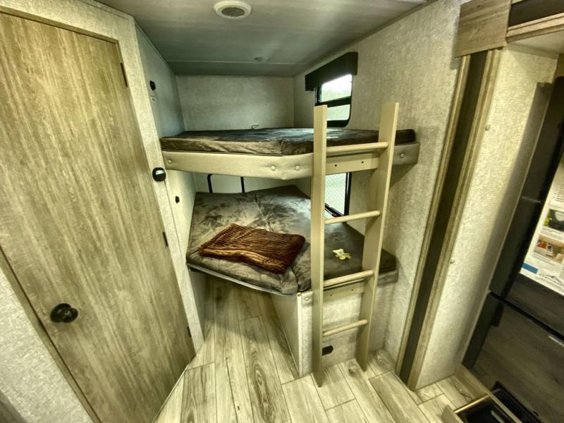 You can comfortably sleep four to six in this travel trailer thanks to the rear double bunk beds and a king bed. There is also additional storage where you will find plenty of space as well as in the overhead cabinets and dual wardrobes and night stands. The combined living area and kitchen includes a large slide for more space, and a booth dinette with an optional free-standing dinette. Great accessibility thanks to the two entry doors. In the exterior, there is also a 21´ awning and a Kayak door, especially for the adventurous ones! finally after a long day take a comfortable and relaxing shower in our full rear bathroom.