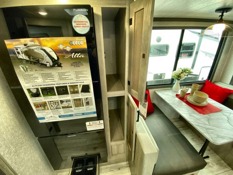 Each Alta travel trailer or toy hauler by EAST TO WEST is constructed with a 5" vacuum bonded roof, an enclosed and heated underbelly, and diamond plate front rock guard for added protection. Outside, you'll find marine-grade exterior speakers, a universal docking station, and back-up camera prep that can be added to make maneuvering in and out of campgrounds easier than ever. Inside, there are 4k interior LED lights, solid pressed membrane countertops, black roller shades, and many more interior comforts you are sure to love.