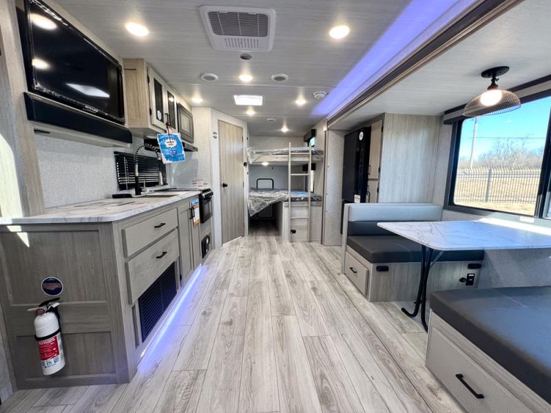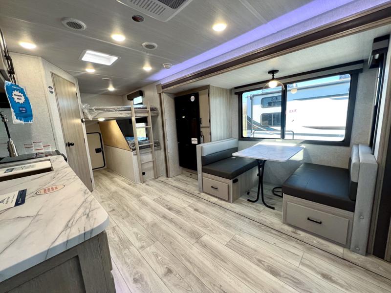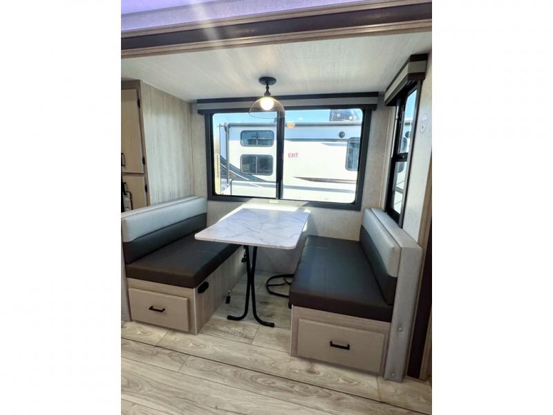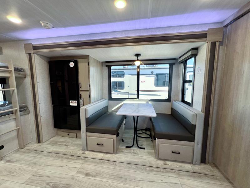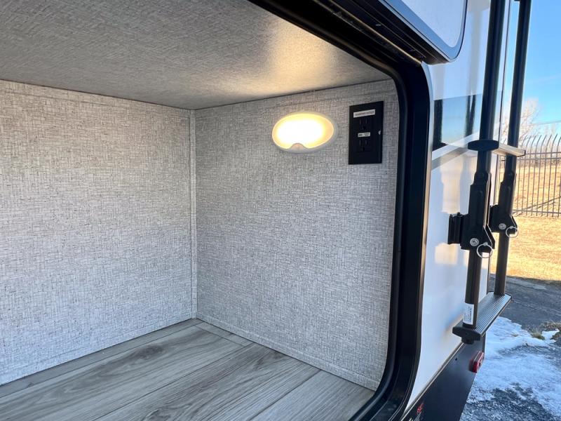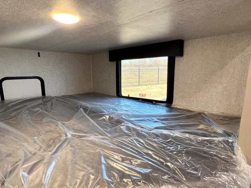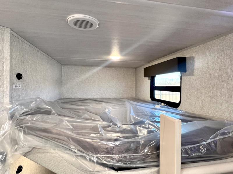 You can comfortably sleep four to six in this travel trailer thanks to the rear double bunk beds and a king bed. There is also additional storage where you will find plenty of space as well as in the overhead cabinets and dual wardrobes and night stands. The combined living area and kitchen includes a large slide for more space, and a booth dinette with an optional free-standing dinette. Great accessibility thanks to the two entry doors. In the exterior, there is also a 21´ awning and a Kayak door, especially for the adventurous ones! finally after a long day take a comfortable and relaxing shower in our full rear bathroom.