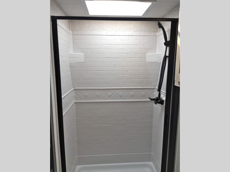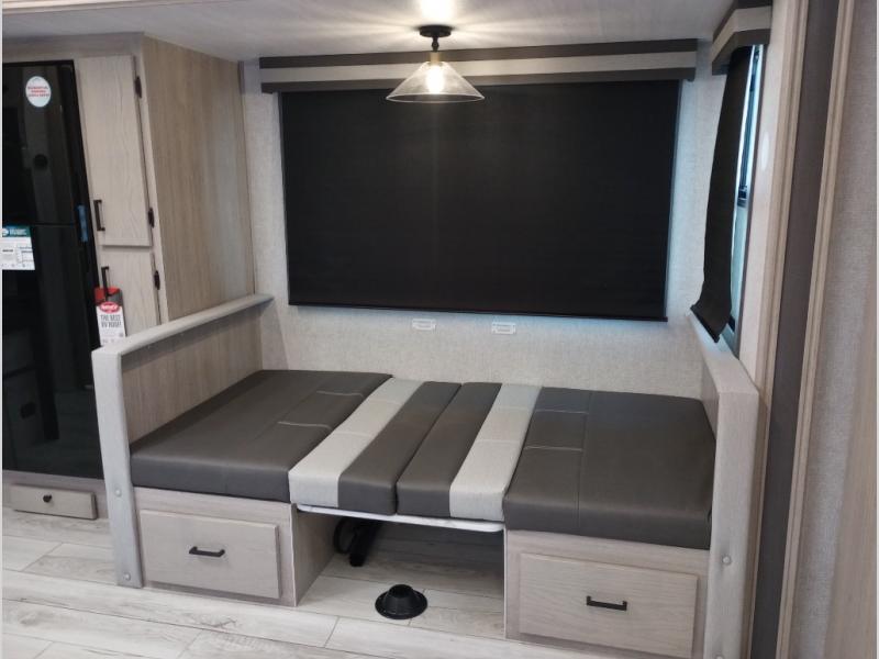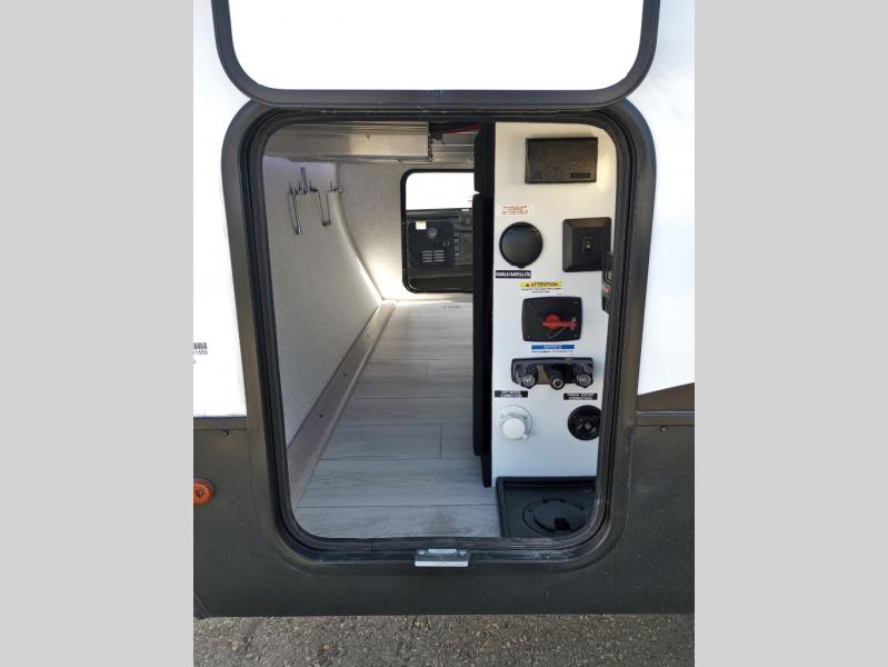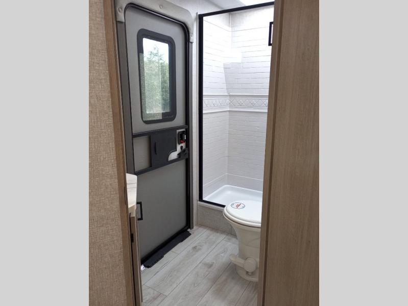 You can comfortably sleep four to six in this travel trailer thanks to the rear double bunk beds and a king bed. There is also additional storage where you will find plenty of space as well as in the overhead cabinets and dual wardrobes and night stands. The combined living area and kitchen includes a large slide for more space, and a booth dinette with an optional free-standing dinette. Great accessibility thanks to the two entry doors. In the exterior, there is also a 21´ awning and a Kayak door, especially for the adventurous ones! finally after a long day take a comfortable and relaxing shower in our full rear bathroom.