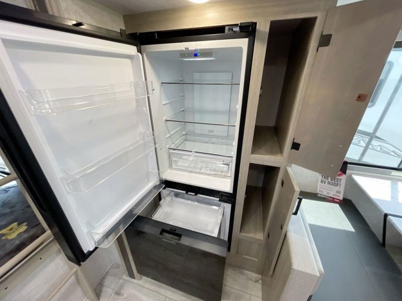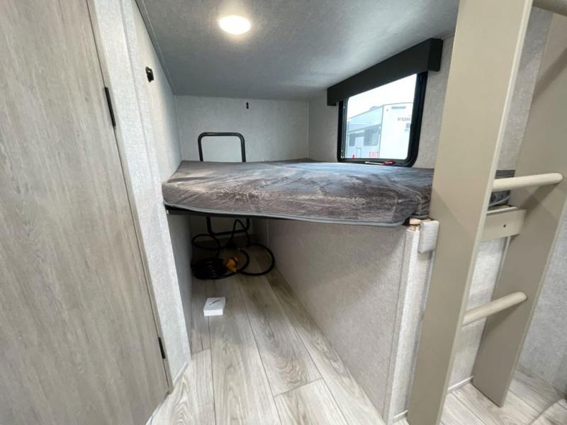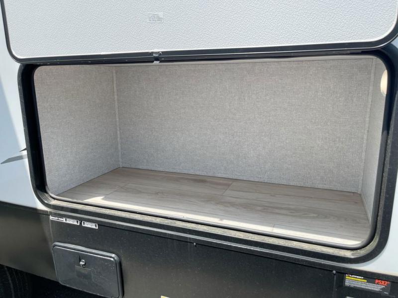 You can comfortably sleep four to six in this travel trailer thanks to the rear double bunk beds and a king bed. There is also additional storage where you will find plenty of space as well as in the overhead cabinets and dual wardrobes and night stands. The combined living area and kitchen includes a large slide for more space, and a booth dinette with an optional free-standing dinette. Great accessibility thanks to the two entry doors. In the exterior, there is also a 21´ awning and a Kayak door, especially for the adventurous ones! finally after a long day take a comfortable and relaxing shower in our full rear bathroom.