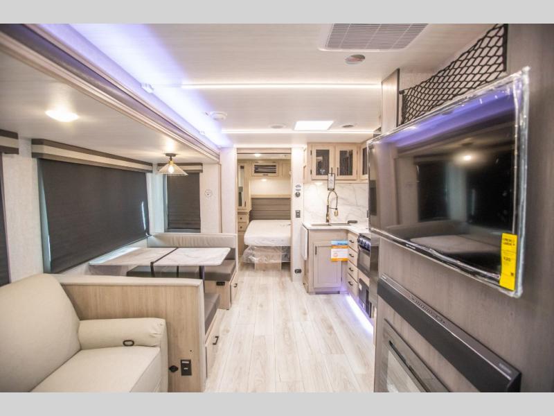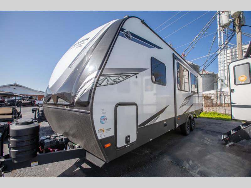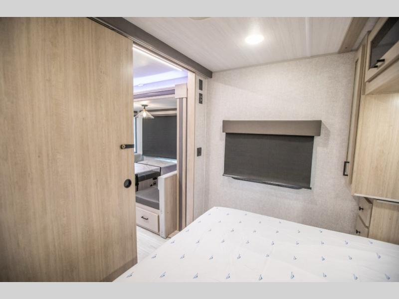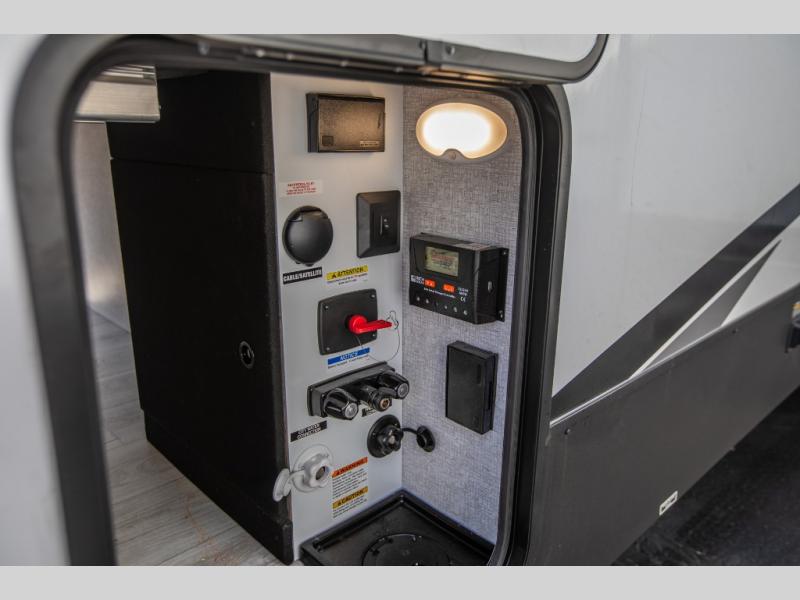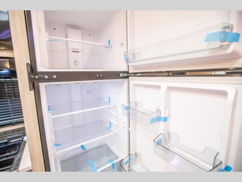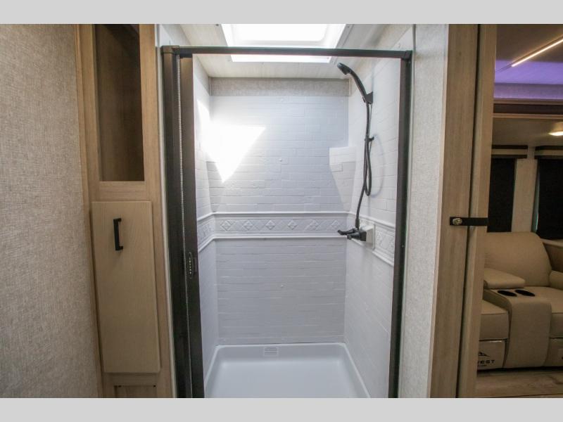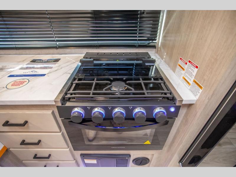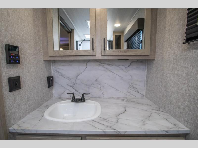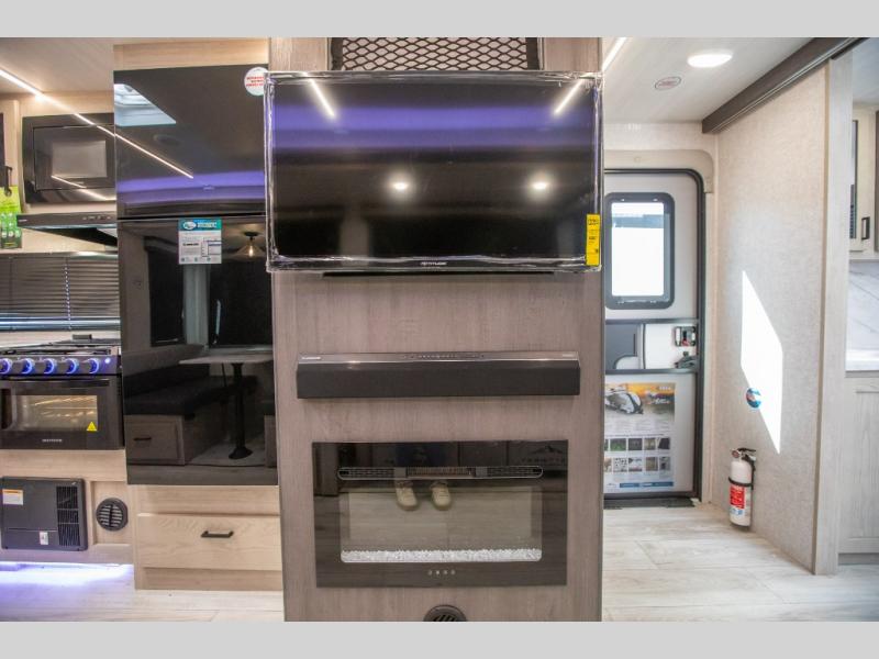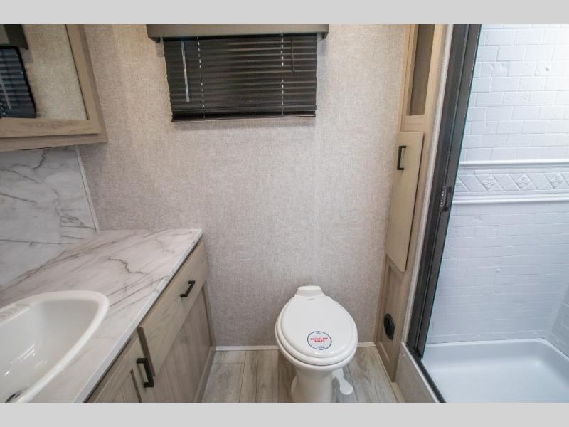 Wow! Check out the spacious full rear bath in this travel trailer for five! You'll appreciate a linen closet here and a shower skylight to let natural light in. Your crew can get comfortable on the tri-fold sofa that sits directly across from the fireplace for a more cozy feel. There is also a booth dinette here with storage space underneath for board games. Head to the kitchen to prepare dinner on the three burner cooktop, and use the countertop extension to cut fresh fruits and vegetables. A front private bedroom with a king bed and dual wardrobes will have you feeling right at home. Start camping today!