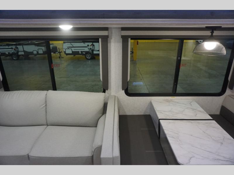 Each Alta travel trailer or toy hauler by EAST TO WEST is constructed with a 5" vacuum bonded roof, an enclosed and heated underbelly, and diamond plate front rock guard for added protection. Outside, you'll find marine-grade exterior speakers, a universal docking station, and back-up camera prep that can be added to make maneuvering in and out of campgrounds easier than ever. Inside, there are 4k interior LED lights, solid pressed membrane countertops, black roller shades, and many more interior comforts you are sure to love.