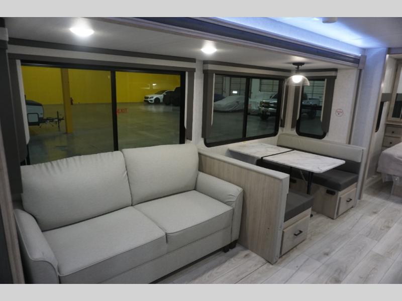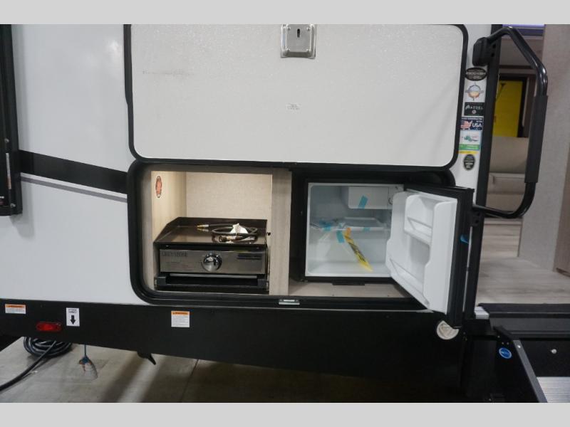 This is the ultimate family-friendly travel trailer thanks to the double-size bunks with bike storage in the back. A king bed in the front bedroom will make you feel right at home, plus there are dual wardrobes and dual nightstands for your things. The large slide out in the main living area won't leave you feeling confined, and the tri-fold sofa and booth dinette will provide comfortable seating space. The chef of your group can start lunch on the outside kitchen while the kids grab their scooters from the pass-through storage. And don't forget there is a universal docking station to quickly access your utilities when needed.