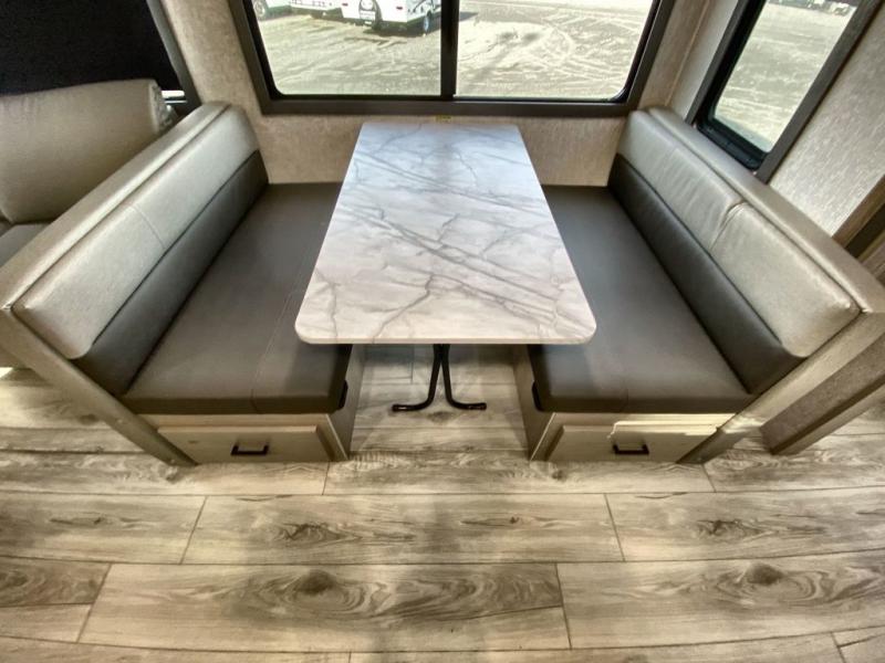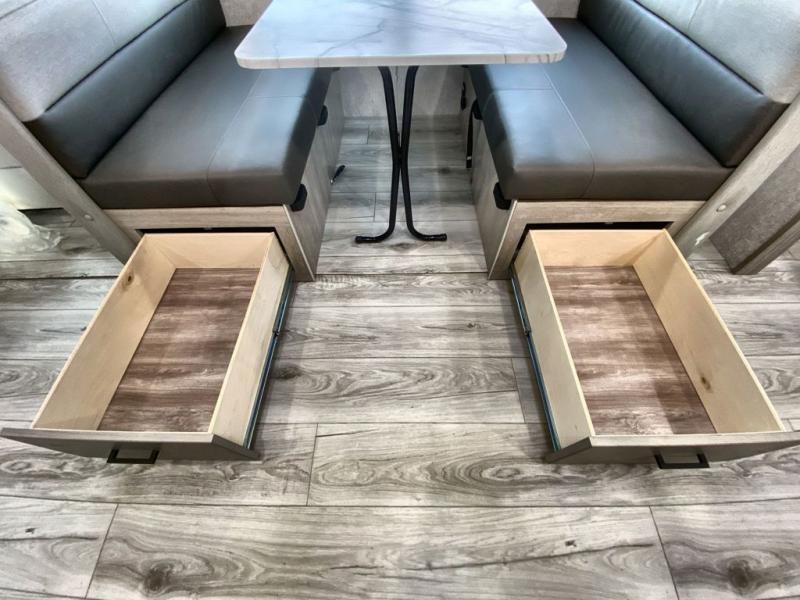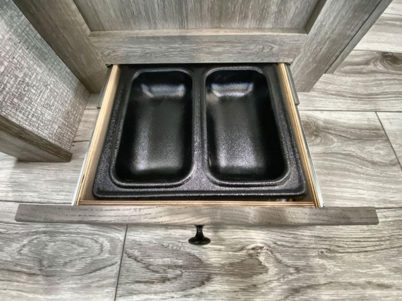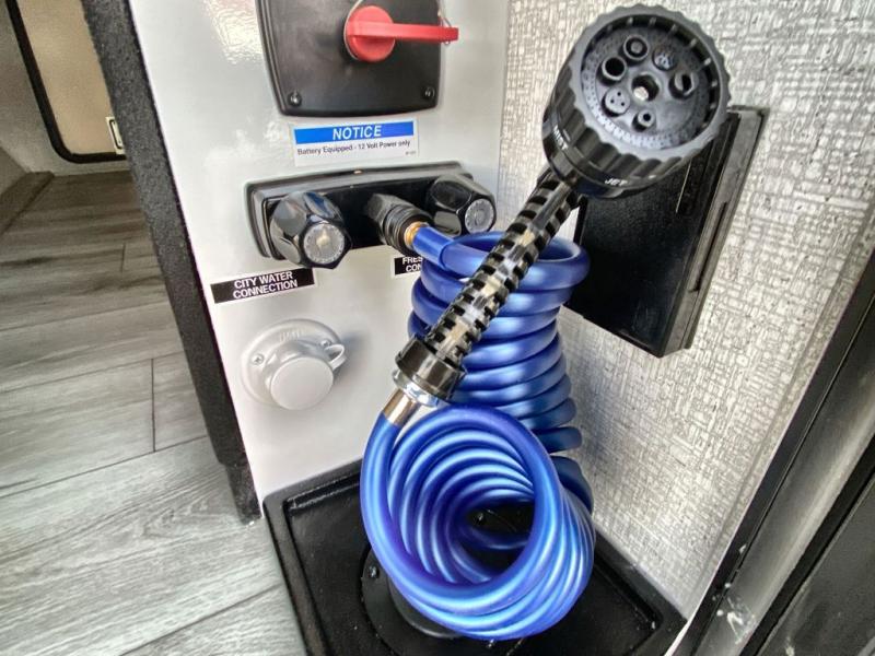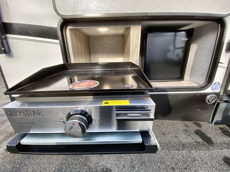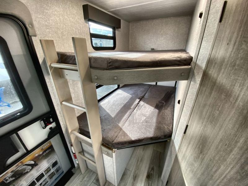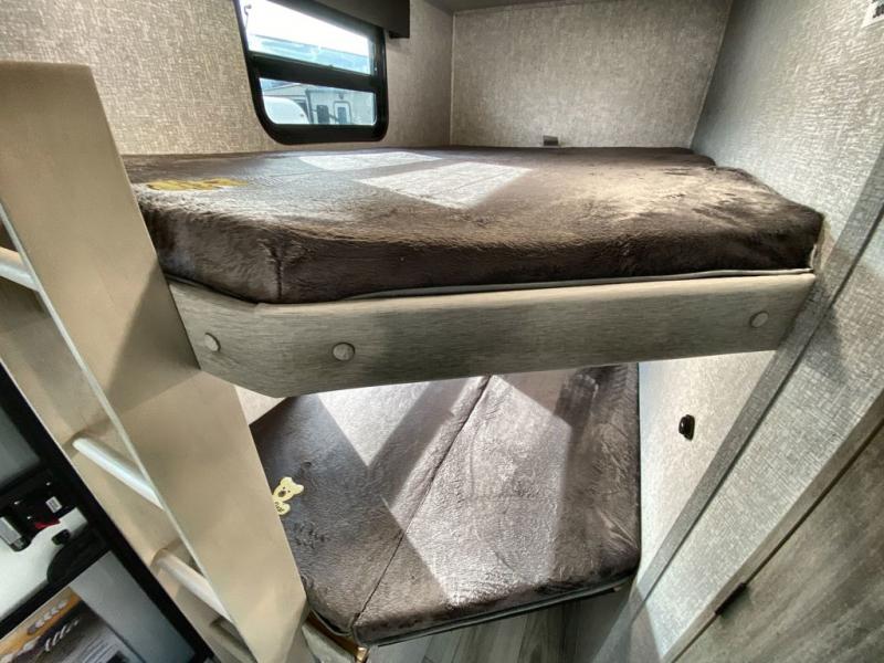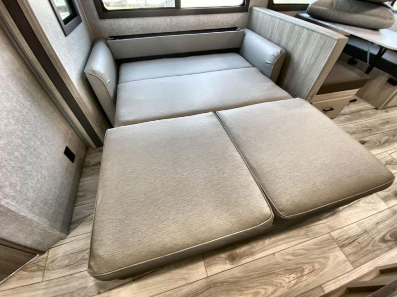This is the ultimate family-friendly travel trailer thanks to the double-size bunks with bike storage in the back. A king bed in the front bedroom will make you feel right at home, plus there are dual wardrobes and dual nightstands for your things. The large slide out in the main living area won't leave you feeling confined, and the tri-fold sofa and booth dinette will provide comfortable seating space. The chef of your group can start lunch on the outside kitchen while the kids grab their scooters from the pass-through storage. And don't forget there is a universal docking station to quickly access your utilities when needed.