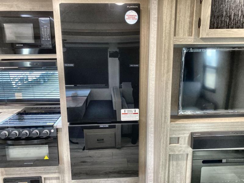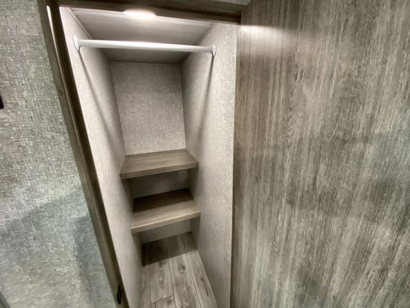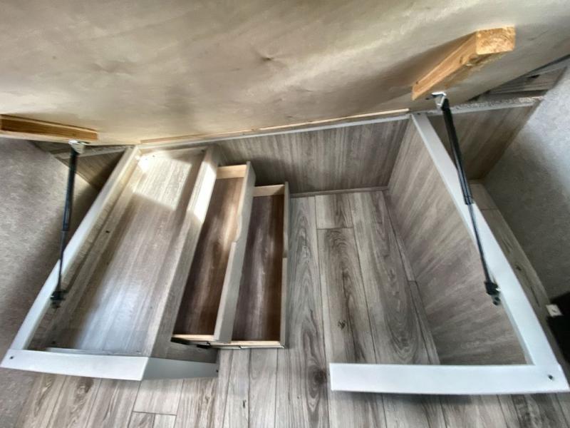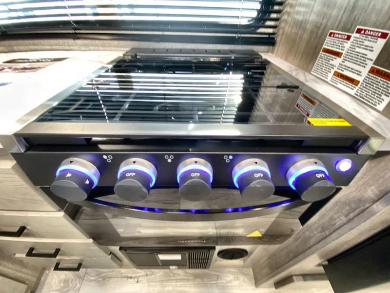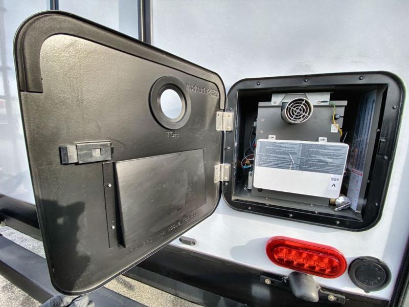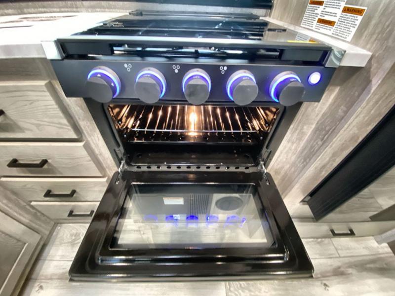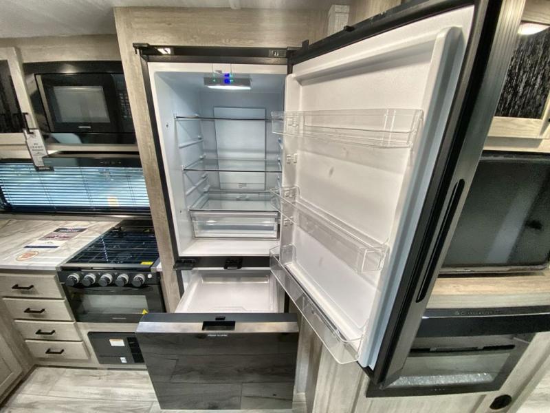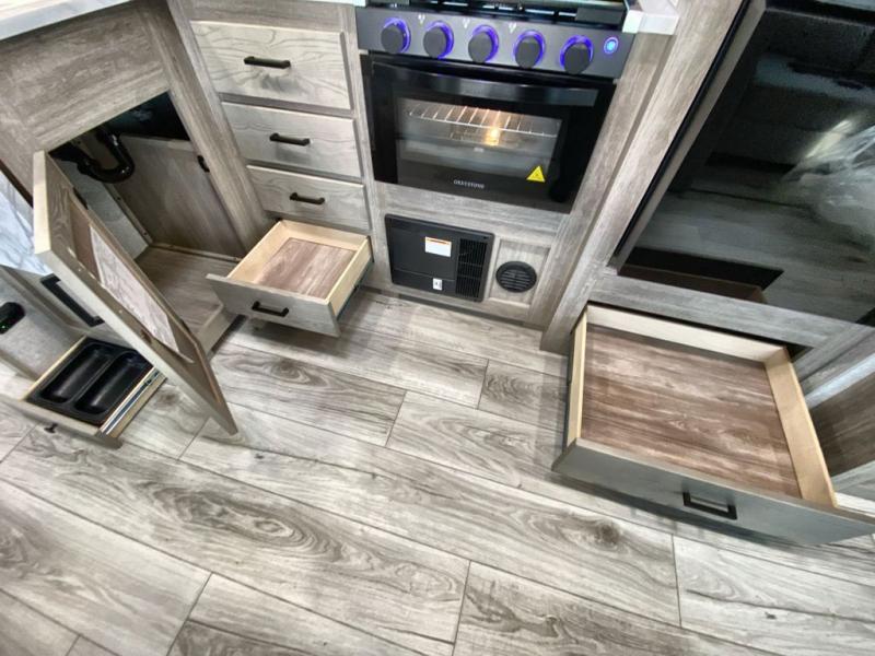This is the ultimate family-friendly travel trailer thanks to the double-size bunks with bike storage in the back. A king bed in the front bedroom will make you feel right at home, plus there are dual wardrobes and dual nightstands for your things. The large slide out in the main living area won't leave you feeling confined, and the tri-fold sofa and booth dinette will provide comfortable seating space. The chef of your group can start lunch on the outside kitchen while the kids grab their scooters from the pass-through storage. And don't forget there is a universal docking station to quickly access your utilities when needed.