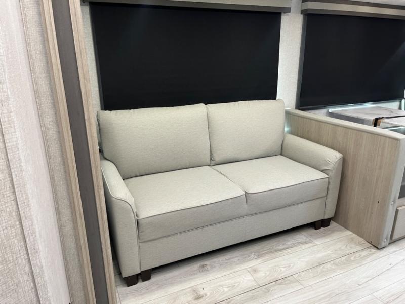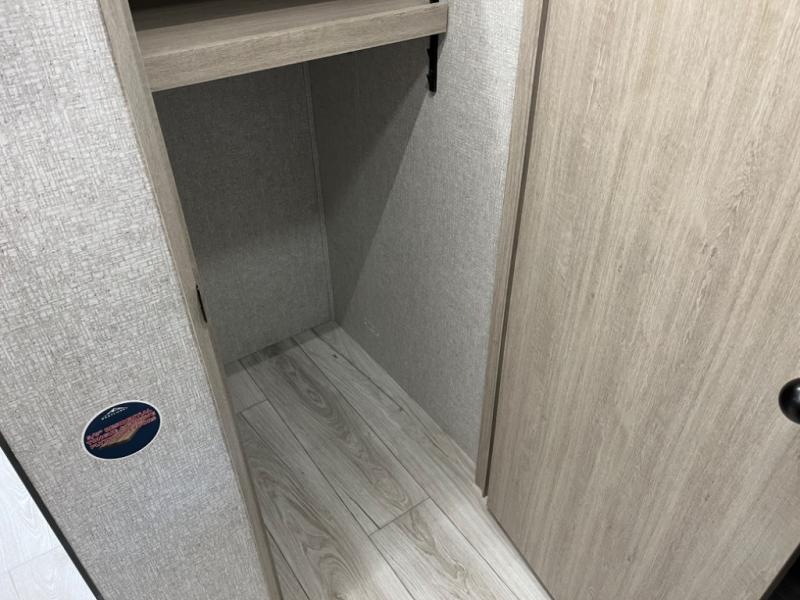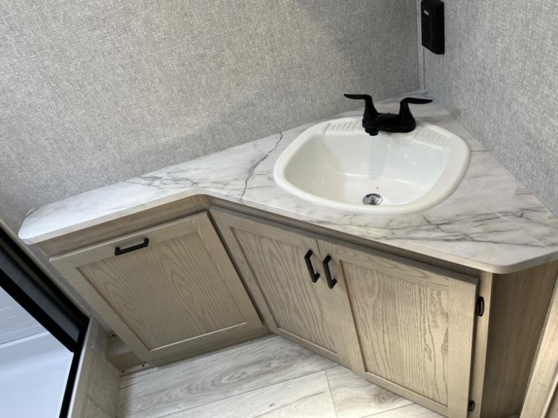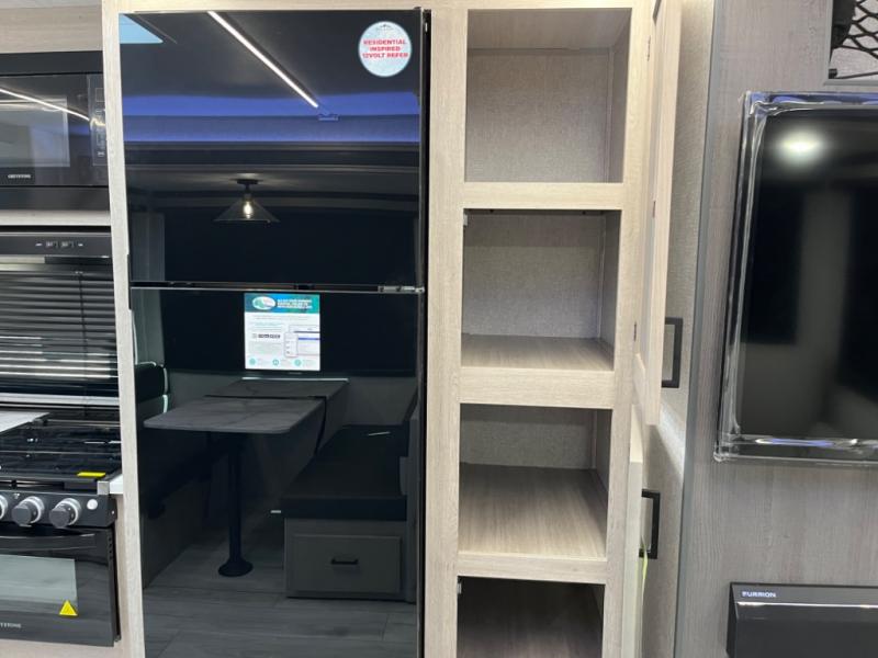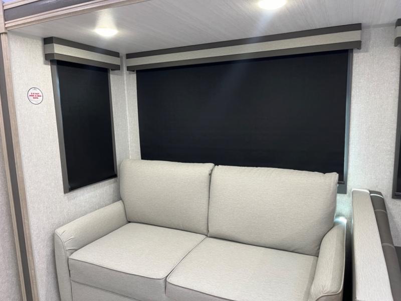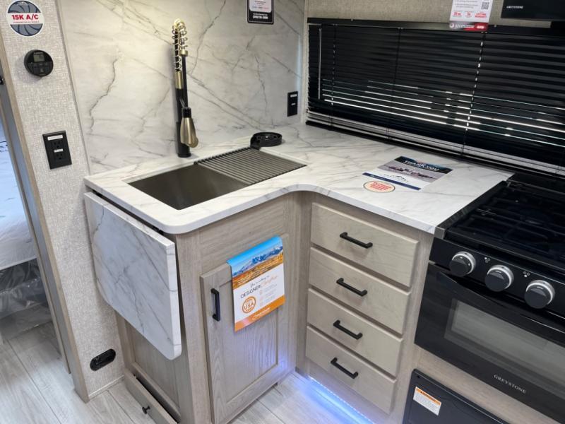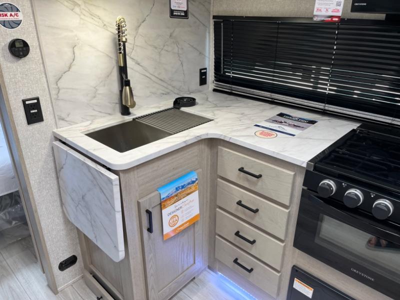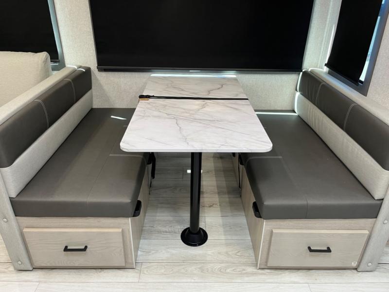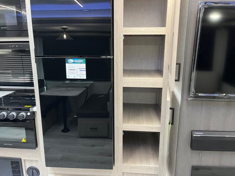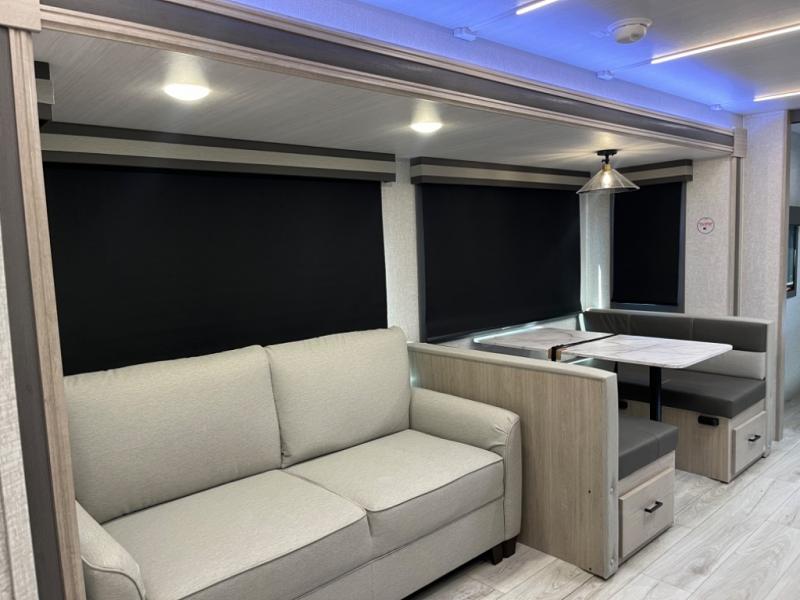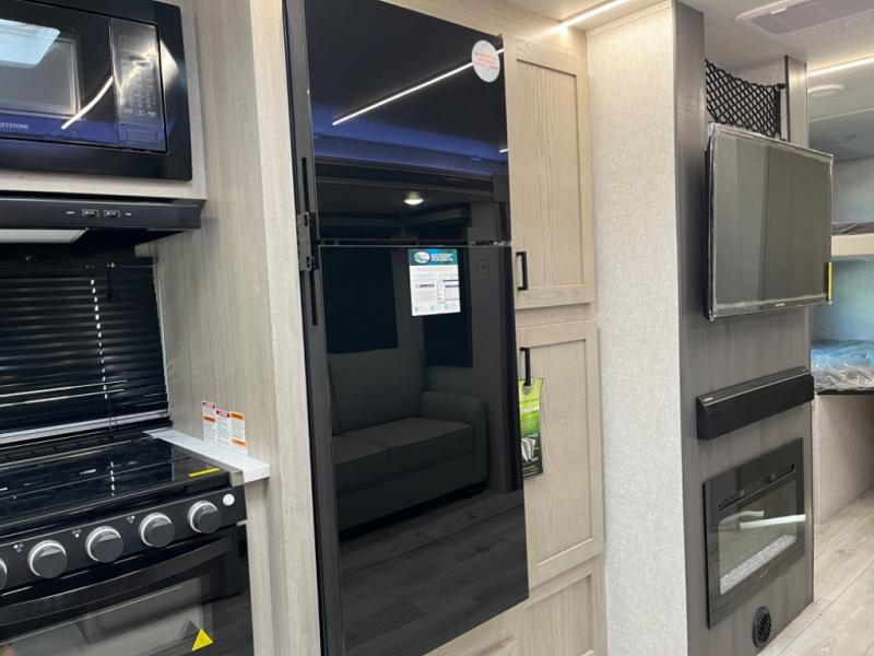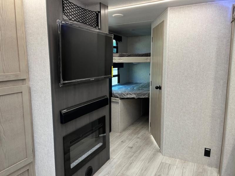 This is the ultimate family-friendly travel trailer thanks to the double-size bunks with bike storage in the back. A king bed in the front bedroom will make you feel right at home, plus there are dual wardrobes and dual nightstands for your things. The large slide out in the main living area won't leave you feeling confined, and the tri-fold sofa and booth dinette will provide comfortable seating space. The chef of your group can start lunch on the outside kitchen while the kids grab their scooters from the pass-through storage. And don't forget there is a universal docking station to quickly access your utilities when needed.