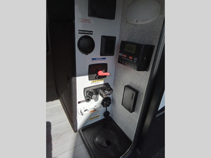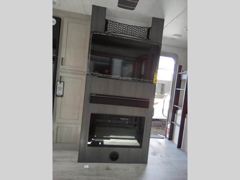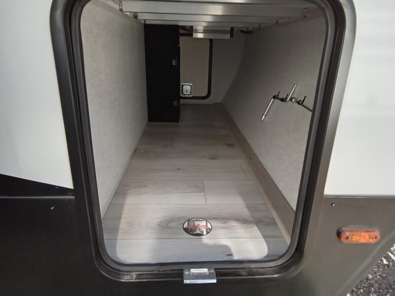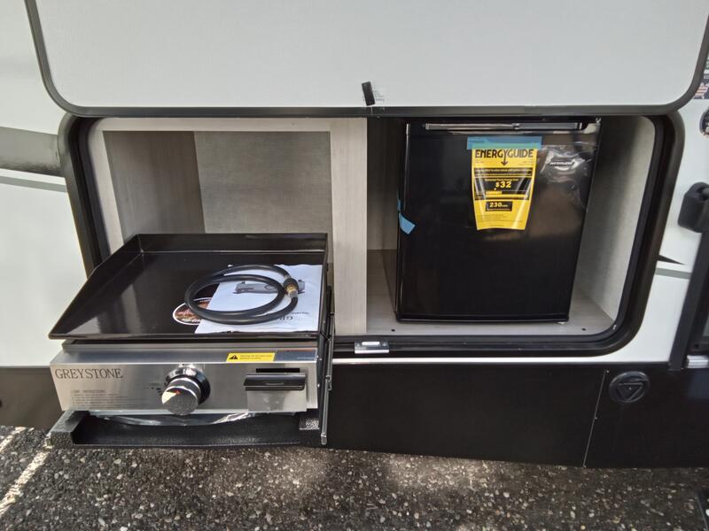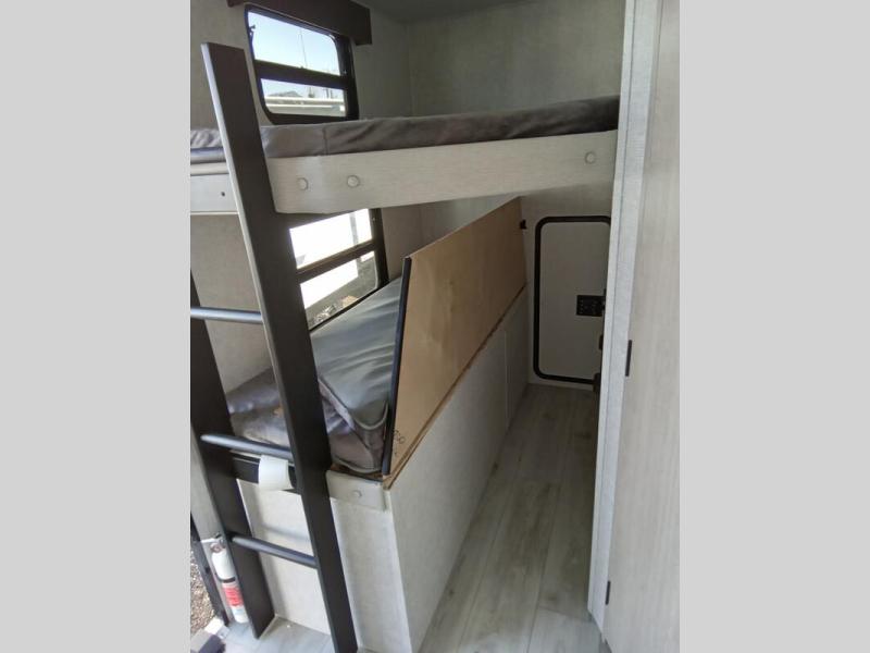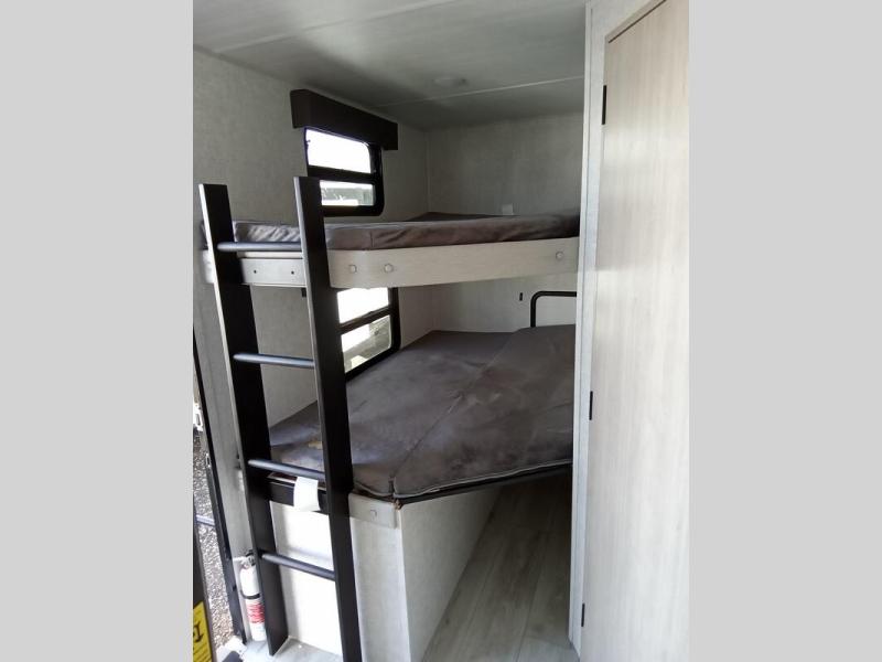 This is the ultimate family-friendly travel trailer thanks to the double-size bunks with bike storage in the back. A king bed in the front bedroom will make you feel right at home, plus there are dual wardrobes and dual nightstands for your things. The large slide out in the main living area won't leave you feeling confined, and the tri-fold sofa and booth dinette will provide comfortable seating space. The chef of your group can start lunch on the outside kitchen while the kids grab their scooters from the pass-through storage. And don't forget there is a universal docking station to quickly access your utilities when needed.