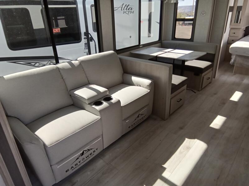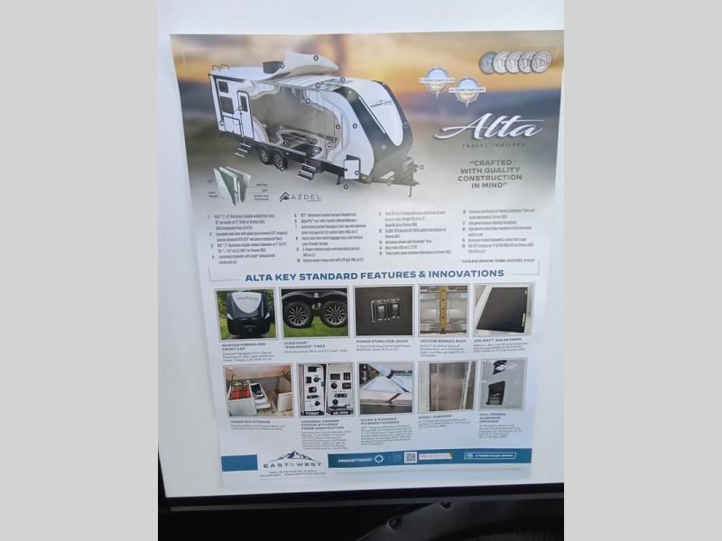 Each Alta travel trailer or toy hauler by EAST TO WEST is constructed with a 5" vacuum bonded roof, an enclosed and heated underbelly, and diamond plate front rock guard for added protection. Outside, you'll find marine-grade exterior speakers, a universal docking station, and back-up camera prep that can be added to make maneuvering in and out of campgrounds easier than ever. Inside, there are 4k interior LED lights, solid pressed membrane countertops, black roller shades, and many more interior comforts you are sure to love.