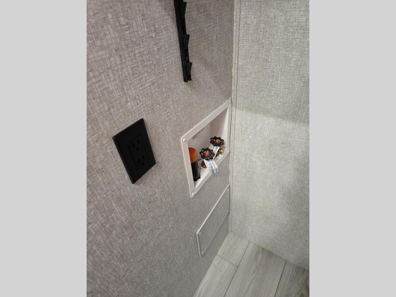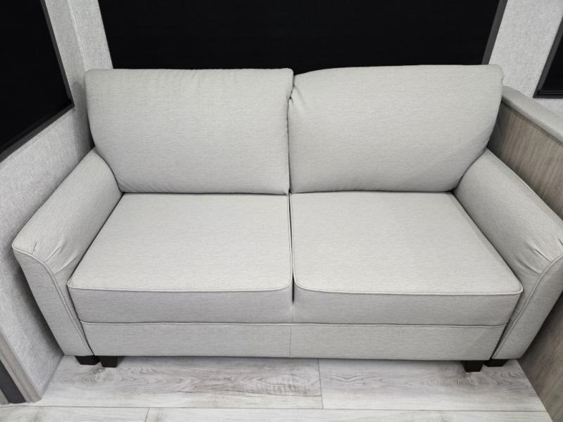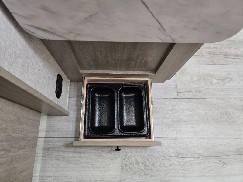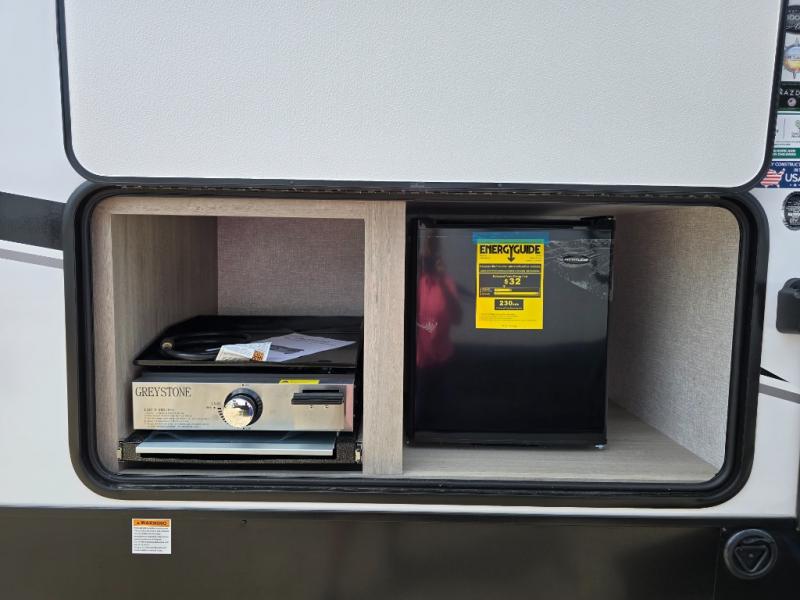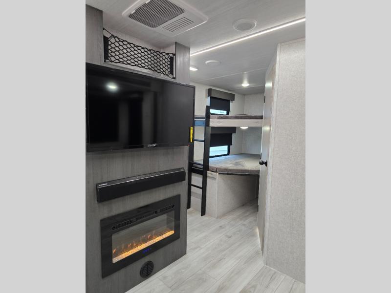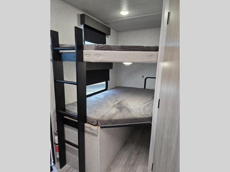 This is the ultimate family-friendly travel trailer thanks to the double-size bunks with bike storage in the back. A king bed in the front bedroom will make you feel right at home, plus there are dual wardrobes and dual nightstands for your things. The large slide out in the main living area won't leave you feeling confined, and the tri-fold sofa and booth dinette will provide comfortable seating space. The chef of your group can start lunch on the outside kitchen while the kids grab their scooters from the pass-through storage. And don't forget there is a universal docking station to quickly access your utilities when needed.