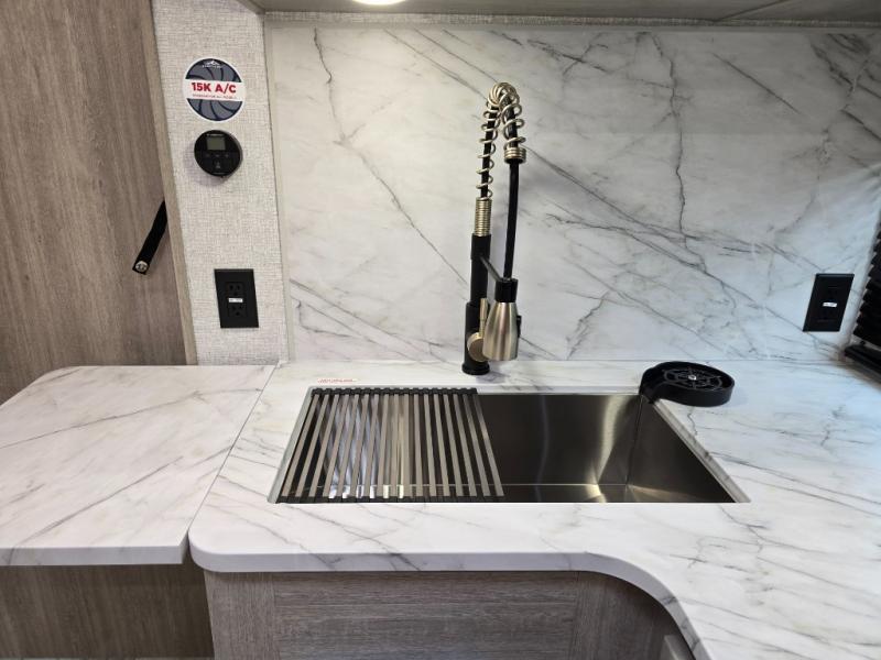 Each Alta travel trailer or toy hauler by EAST TO WEST is constructed with a 5" vacuum bonded roof, an enclosed and heated underbelly, and diamond plate front rock guard for added protection. Outside, you'll find marine-grade exterior speakers, a universal docking station, and back-up camera prep that can be added to make maneuvering in and out of campgrounds easier than ever. Inside, there are 4k interior LED lights, solid pressed membrane countertops, black roller shades, and many more interior comforts you are sure to love.