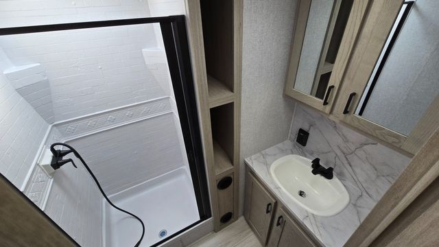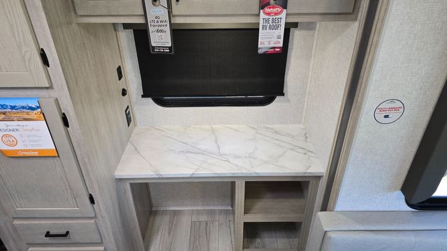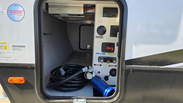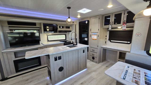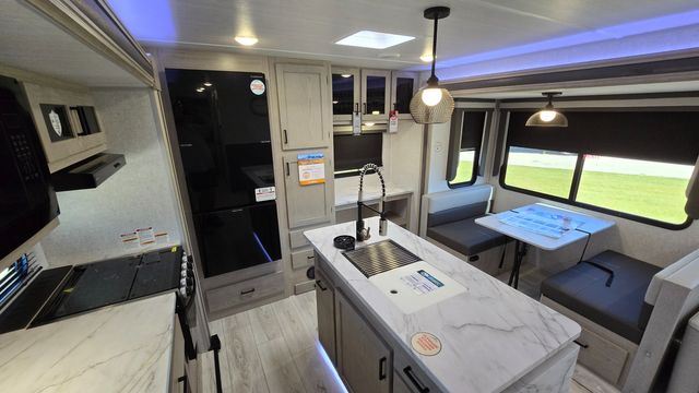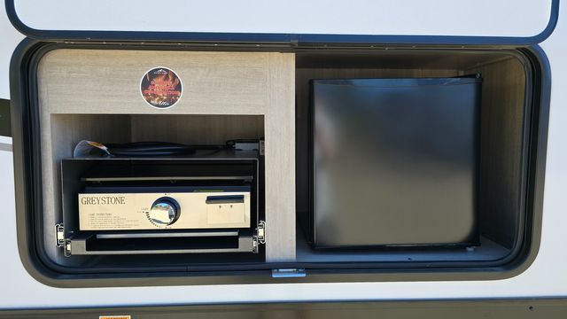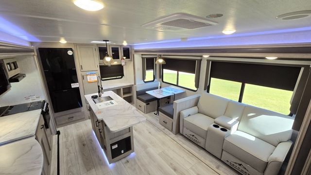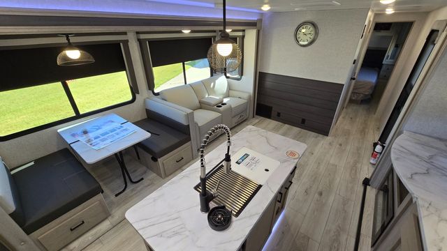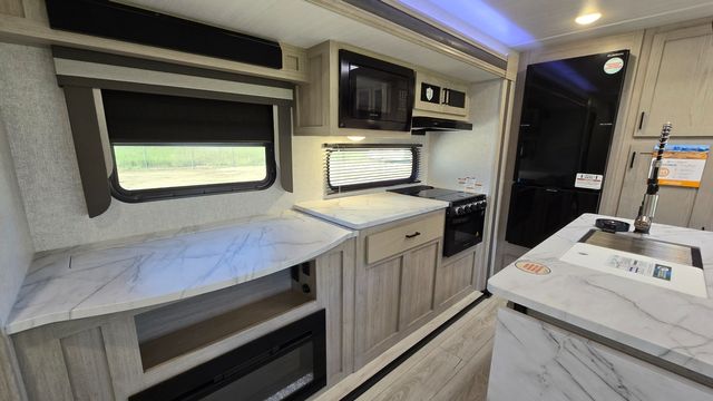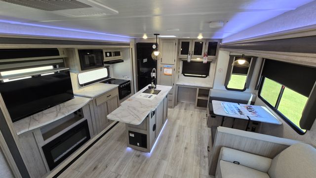 How does a king bed, a kitchen island, and an outdoor kitchen sound? You'll get all that and more in this spacious travel trailer. The dual opposing slides opens up the whole trailer, and the desk in the back will allow you to work while you're away from home. A three burner cooktop and microwave oven comes standard indoors, along with plenty of counter space and a pantry for snacks. Head outdoors to find the outside kitchen under the 21' power awning with LED lights, and when you're ready for bed the king bed will be waiting for you!