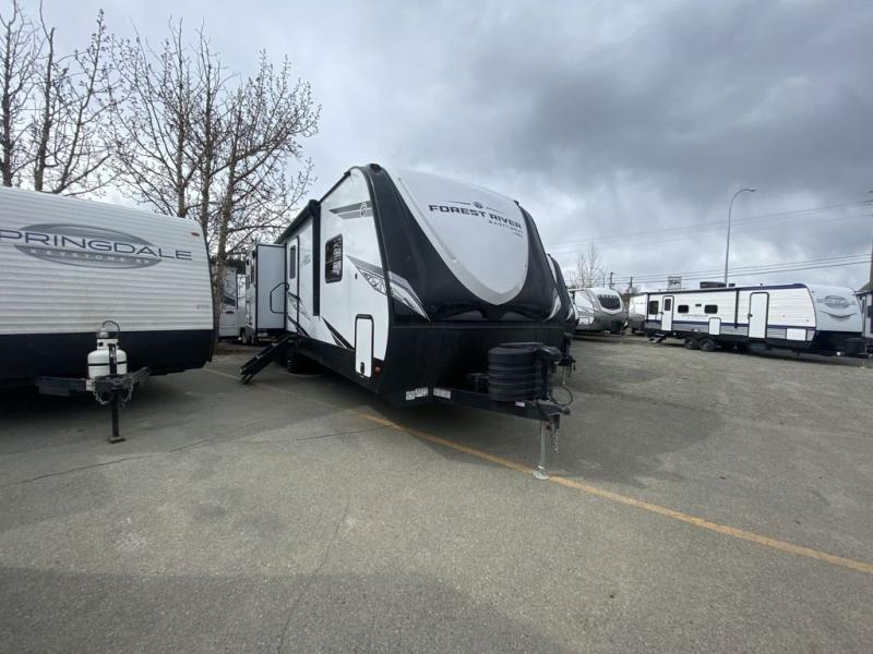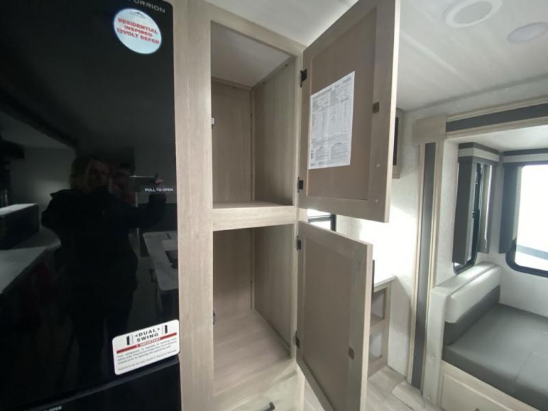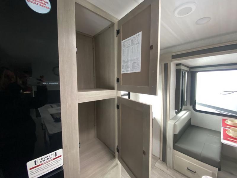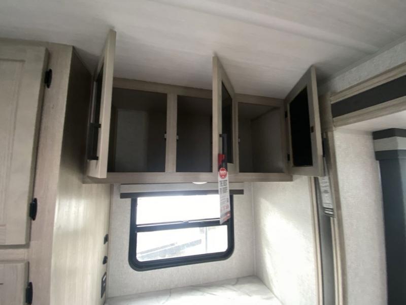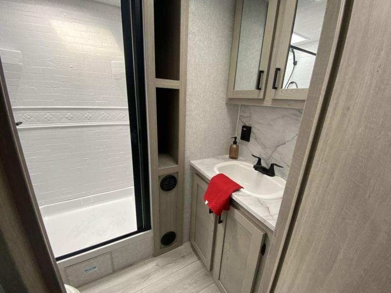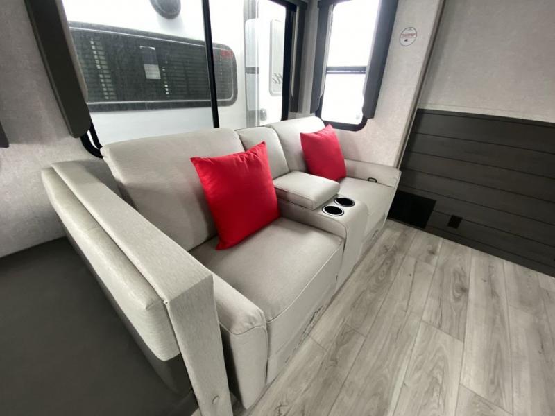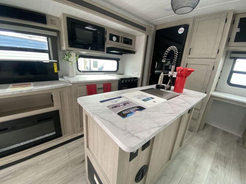 How does a king bed, a kitchen island, and an outdoor kitchen sound? You'll get all that and more in this spacious travel trailer. The dual opposing slides opens up the whole trailer, and the desk in the back will allow you to work while you're away from home. A three burner cooktop and microwave oven comes standard indoors, along with plenty of counter space and a pantry for snacks. Head outdoors to find the outside kitchen under the 21' power awning with LED lights, and when you're ready for bed the king bed will be waiting for you!