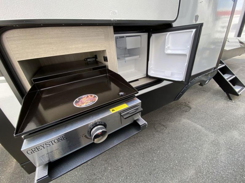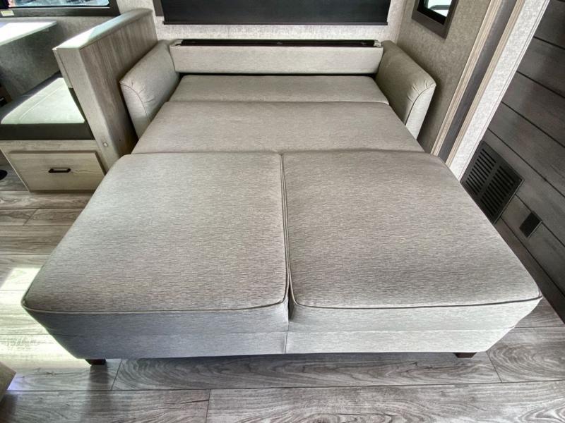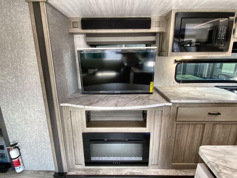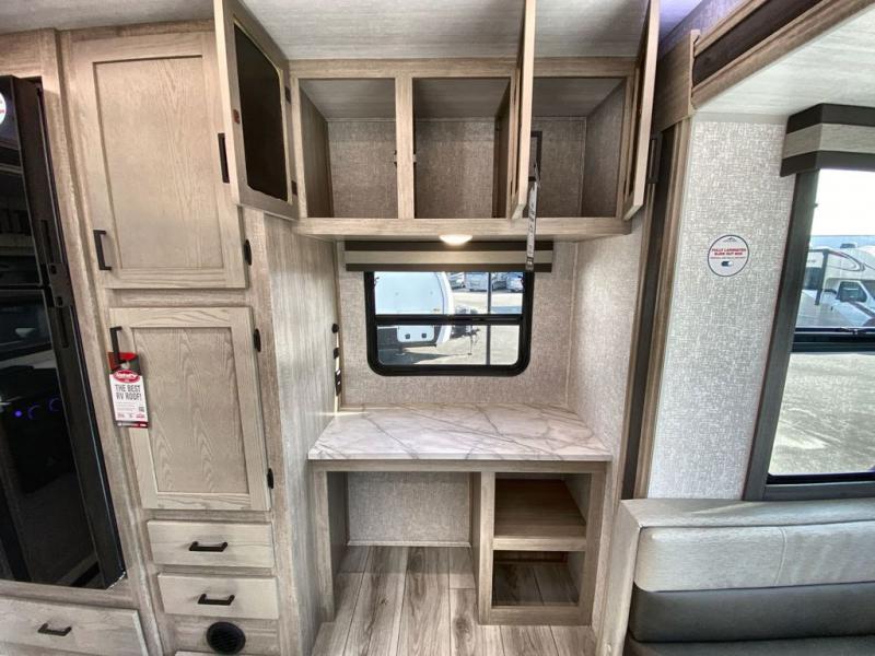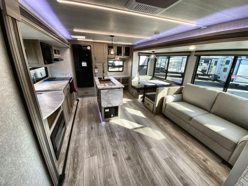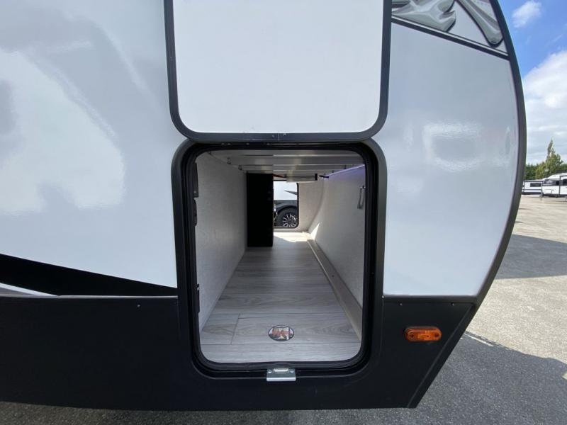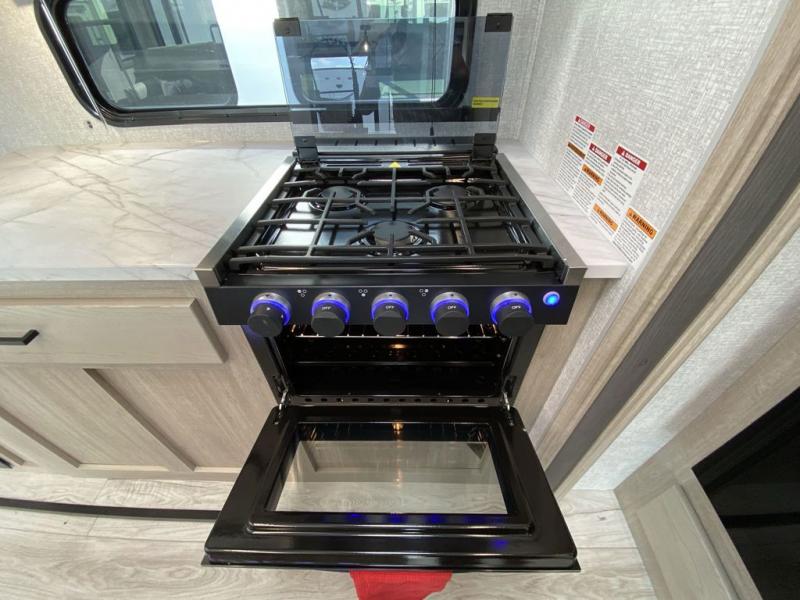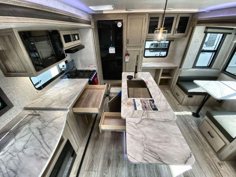 How does a king bed, a kitchen island, and an outdoor kitchen sound? You'll get all that and more in this spacious travel trailer. The dual opposing slides opens up the whole trailer, and the desk in the back will allow you to work while you're away from home. A three burner cooktop and microwave oven comes standard indoors, along with plenty of counter space and a pantry for snacks. Head outdoors to find the outside kitchen under the 21' power awning with LED lights, and when you're ready for bed the king bed will be waiting for you!