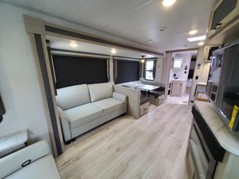 You'll feel right at home in this rear living travel trailer that includes theater seats and a front master bedroom with a king bed. The walk-through bath includes a medicine cabinet and a shower skylight to let natural light in, and the bedroom includes its own exterior entry door for convenience. When you're not relaxing outdoors under the 21' power awning with LED lights, you can play a game at the booth dinette or relax on the tri-fold sofa. This model also includes a pass-through storage for your larger camp gear and a universal docking station for easy access to your hookups.