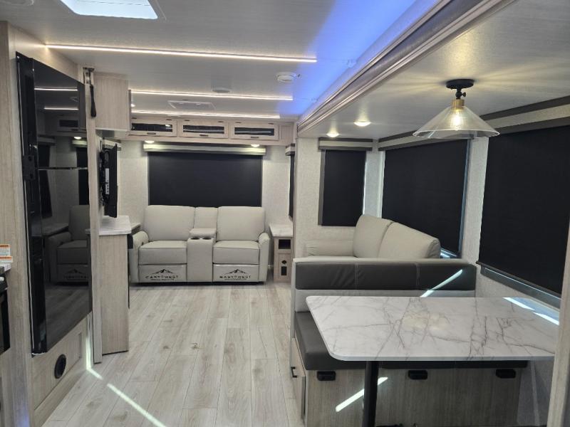 Each Alta travel trailer or toy hauler by EAST TO WEST is constructed with a 5" vacuum bonded roof, an enclosed and heated underbelly, and diamond plate front rock guard for added protection. Outside, you'll find marine-grade exterior speakers, a universal docking station, and back-up camera prep that can be added to make maneuvering in and out of campgrounds easier than ever. Inside, there are 4k interior LED lights, solid pressed membrane countertops, black roller shades, and many more interior comforts you are sure to love.