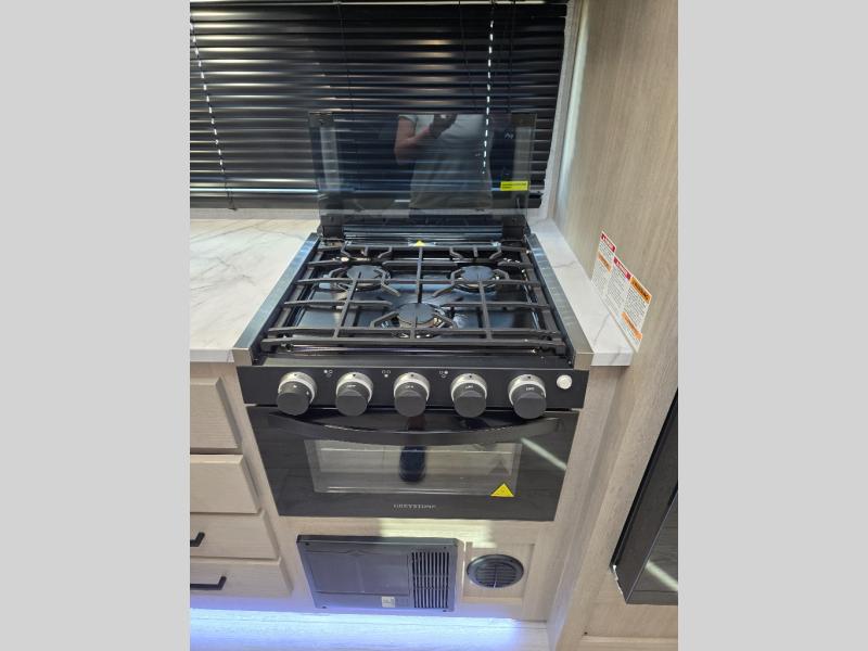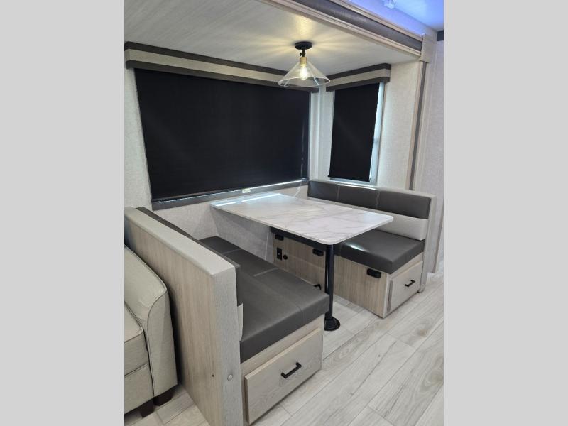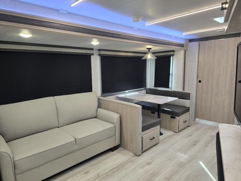 You'll feel right at home in this rear living travel trailer that includes theater seats and a front master bedroom with a king bed. The walk-through bath includes a medicine cabinet and a shower skylight to let natural light in, and the bedroom includes its own exterior entry door for convenience. When you're not relaxing outdoors under the 21' power awning with LED lights, you can play a game at the booth dinette or relax on the tri-fold sofa. This model also includes a pass-through storage for your larger camp gear and a universal docking station for easy access to your hookups.
