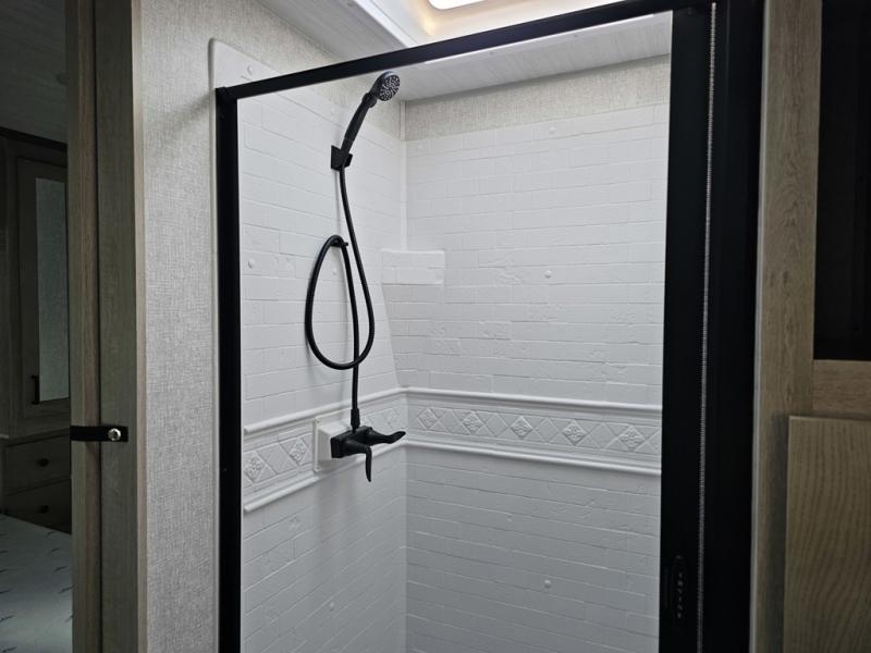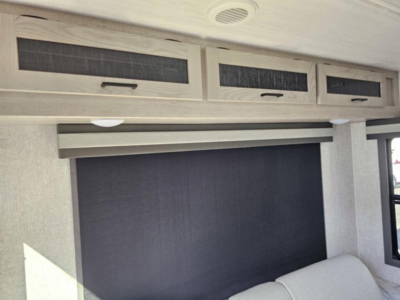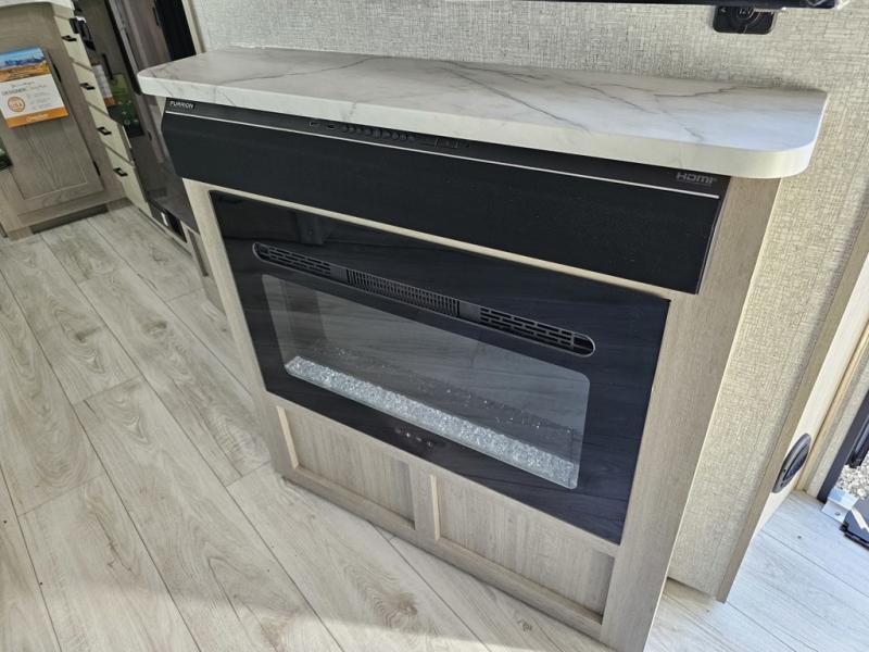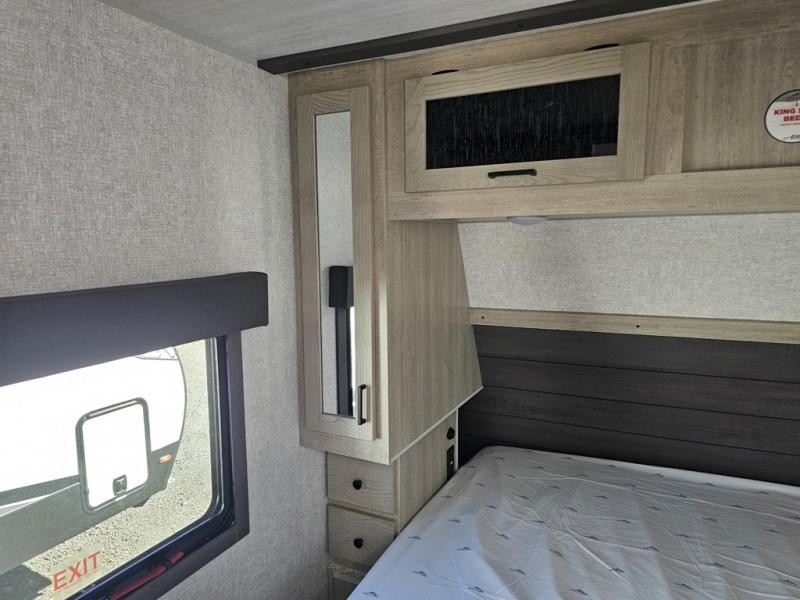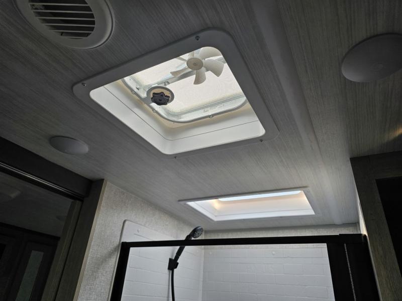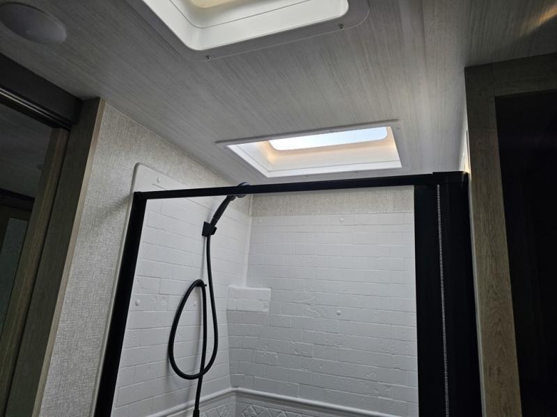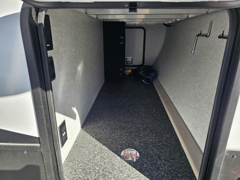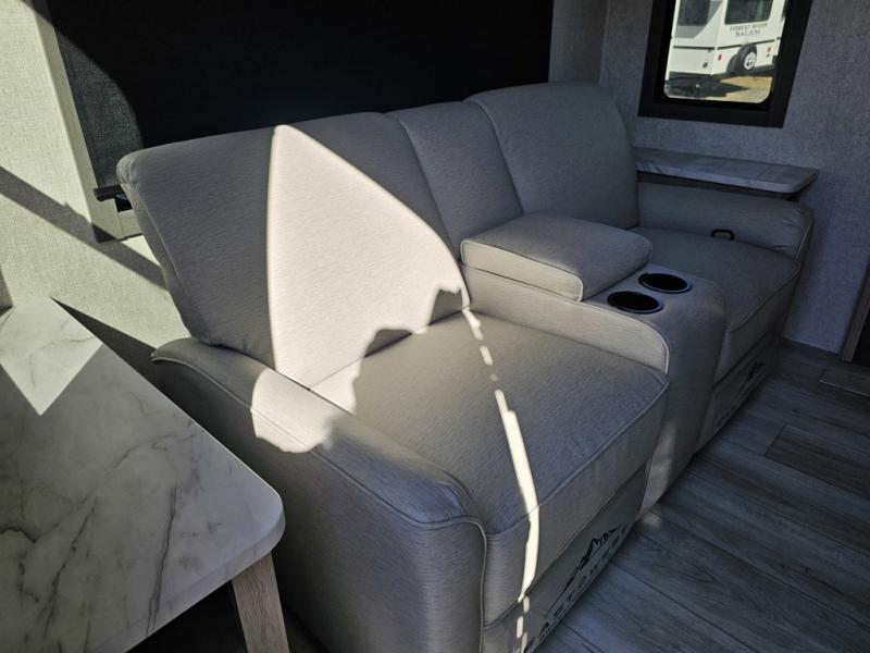 You'll feel right at home in this rear living travel trailer that includes theater seats and a front master bedroom with a king bed. The walk-through bath includes a medicine cabinet and a shower skylight to let natural light in, and the bedroom includes its own exterior entry door for convenience. When you're not relaxing outdoors under the 21' power awning with LED lights, you can play a game at the booth dinette or relax on the tri-fold sofa. This model also includes a pass-through storage for your larger camp gear and a universal docking station for easy access to your hookups.