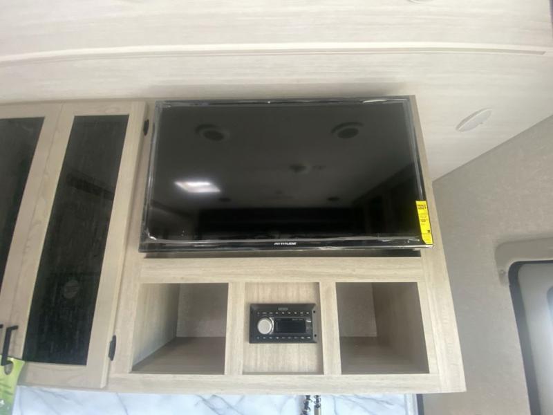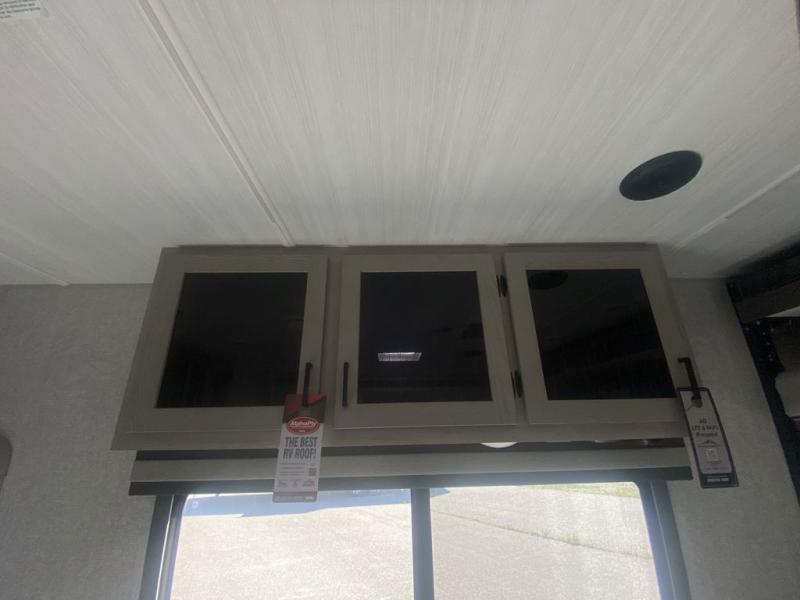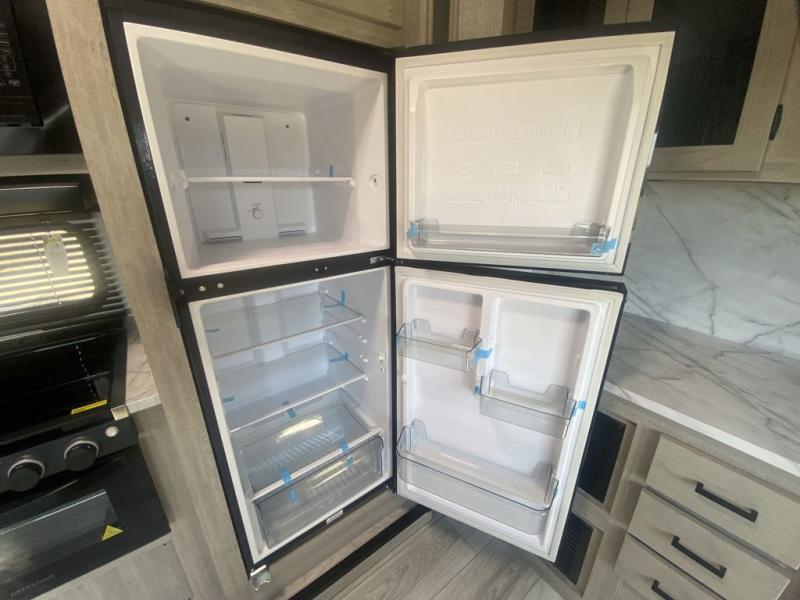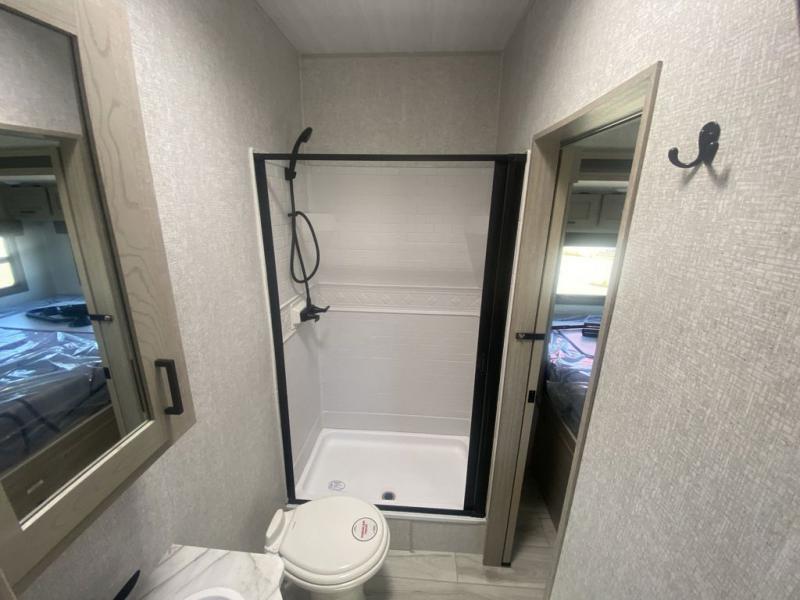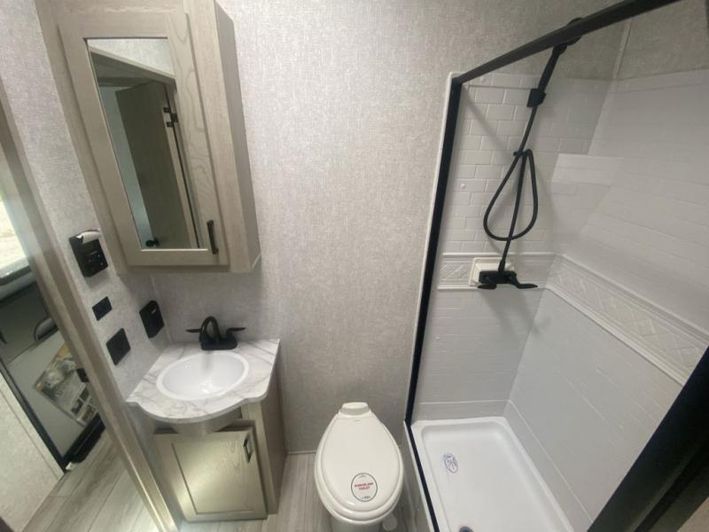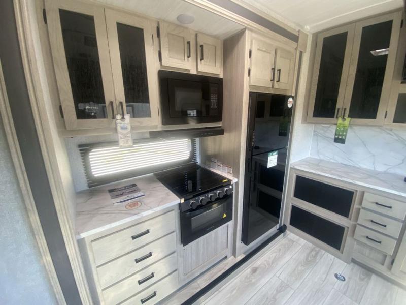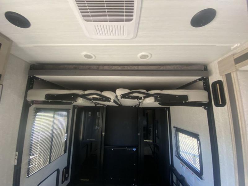 Take your favorite toys and favorite people to your favorite camping spots in this toy hauler! It offers a 14' garage so there is plenty of room for all your toys with a 97" x 92" ramp door with patio kit for easy loading and unloading. A Happi-jack with bunk above opposing sofas with a table in between means you will get lots of flexible use out of the space. The kitchen comes with a 10.7 cu. ft. 12V black glass refrigerator and three-burner range, and you can relax in one of the two recliners after dinner. At night retire to the front bedroom with its king bed slide, wardrobe, dresser, and dual entry bath with shower and skylight. This model also comes with the mandatory West Coach Power Package with a 400 watt solar panel, a 30 Amp controller and a second battery to keep you going!