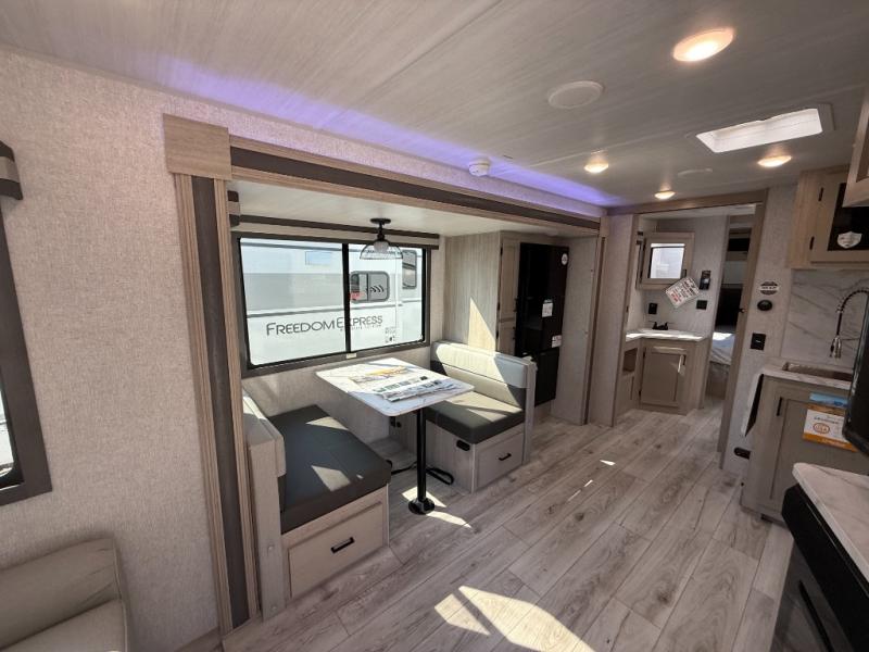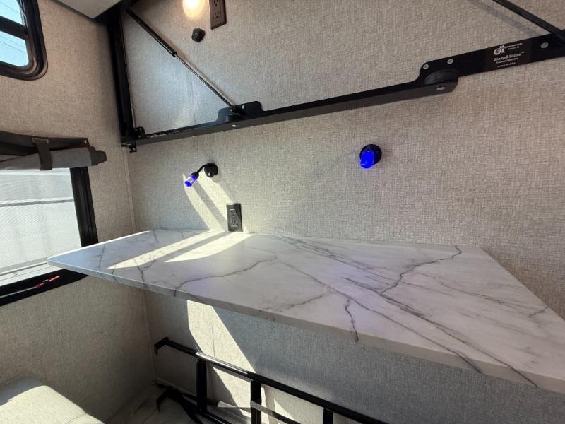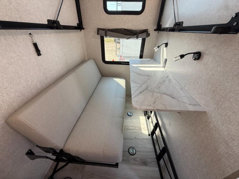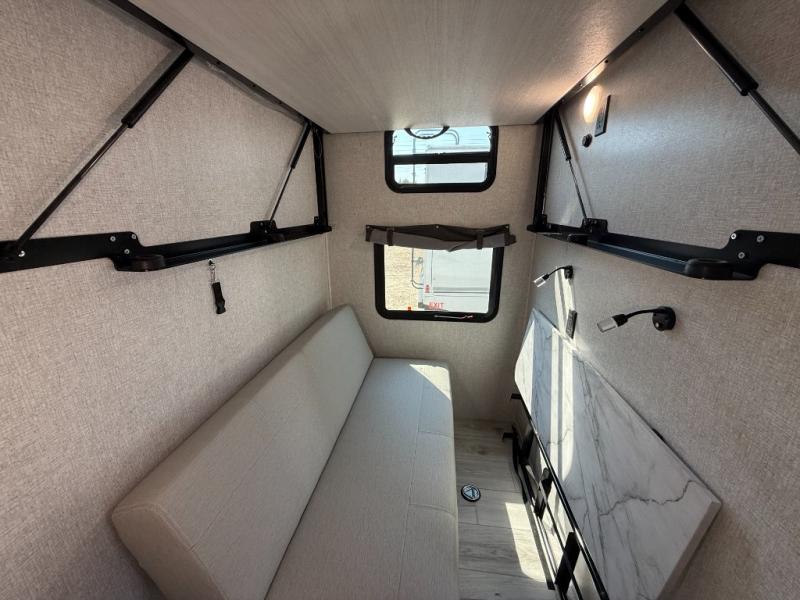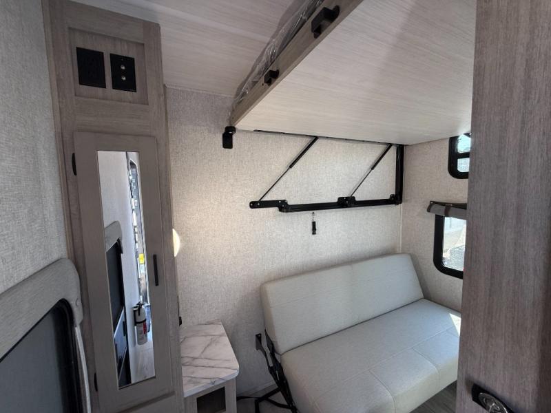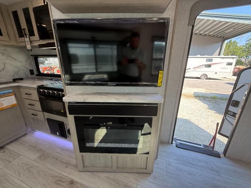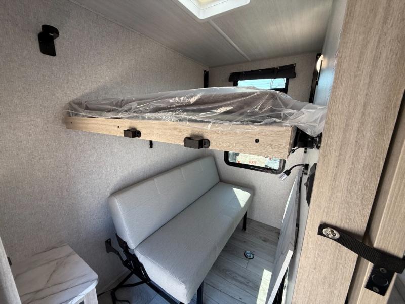 You can comfortably sleep seven to eight in this travel trailer thanks to the rear private bunkhouse with a stowable bunk system. There is also a bike door here so you can easily pack in gear. The combined living area and kitchen includes a large slide for more space, a booth dinette with an optional free-standing dinette, plus a tri-fold sofa with an optional theater seat if you're not needing additional sleeping space. There is also a fireplace with a hidden pantry behind to keep snacks stocked. A walk-thru bath will create a front master bedroom you are sure to enjoy. Here, you'll find a king bed with dual wardrobes and nightstands, overhead cabinetry, and one of the dual entry doors to the unit!