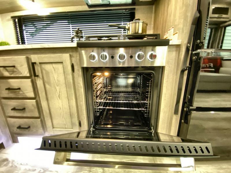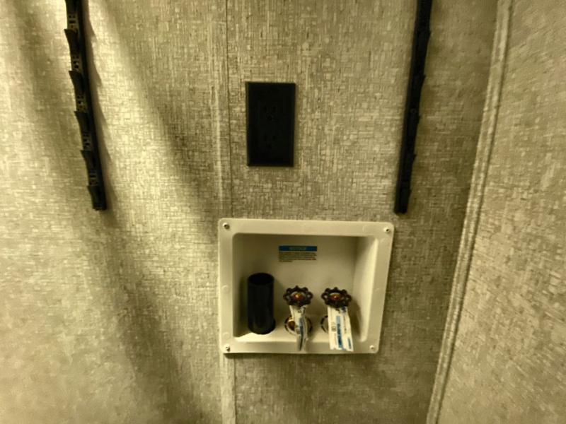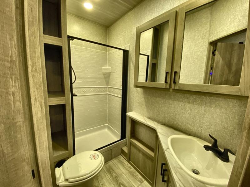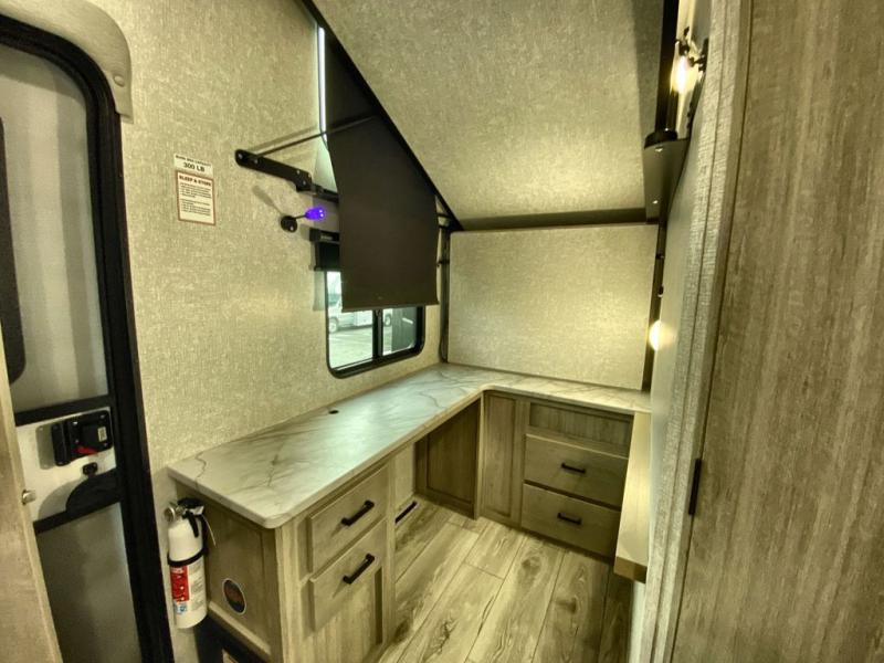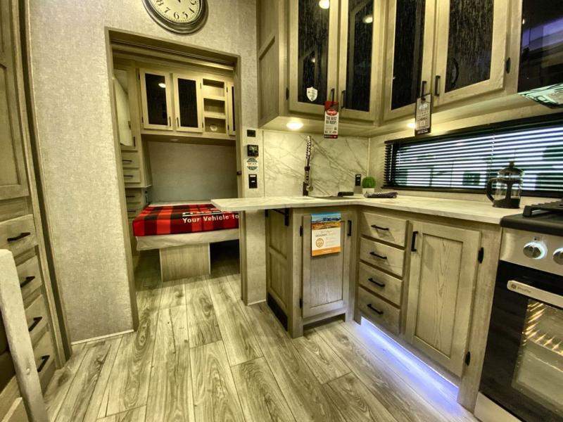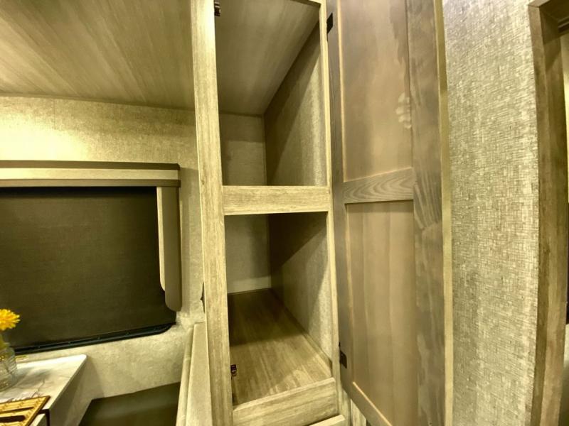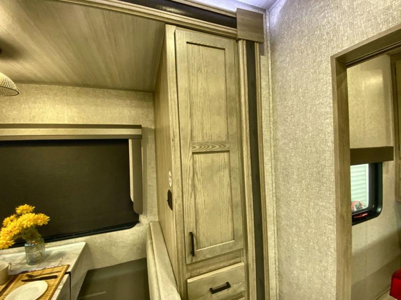Head to the campground in this travel trailer! After you've unloaded the pass-through storage and set up the 21' power awning, start lunch by extending the countertop extension. You can get a good night's rest on the king bed in the front private bedroom and any extra guests can sleep on the stowable bunk system with a ladder above the office area which is also conveniently next to the rear corner bathroom. Across from the bunk system is a large closet with washer and dryer prep if you want the option to make laundry day easier. The free standing dinette has storage underneath and is right next to the pantry for easy snack grabbing. You also have a tri-fold sofa for extra sleeping space or you can switch it out for the optional theater seating.