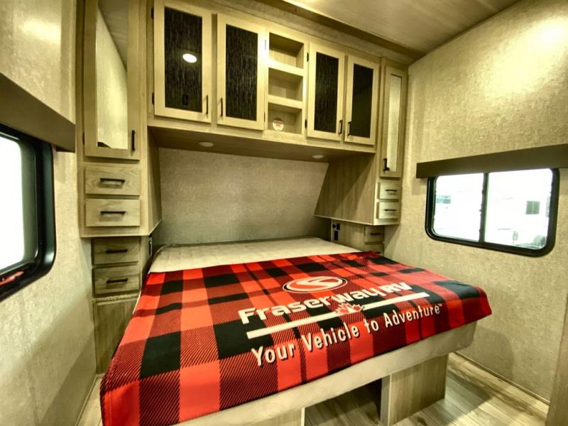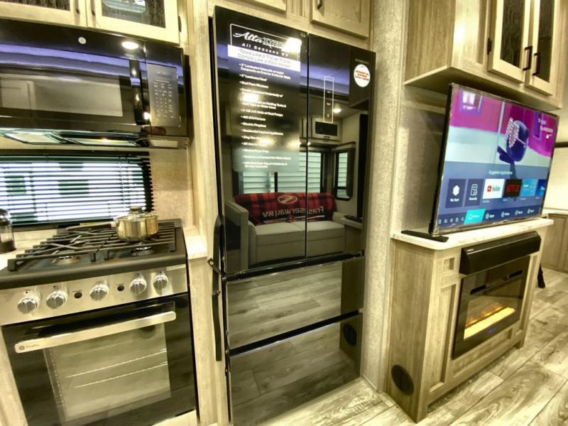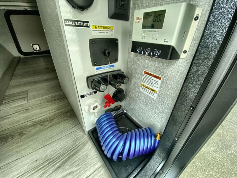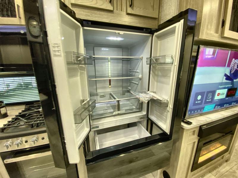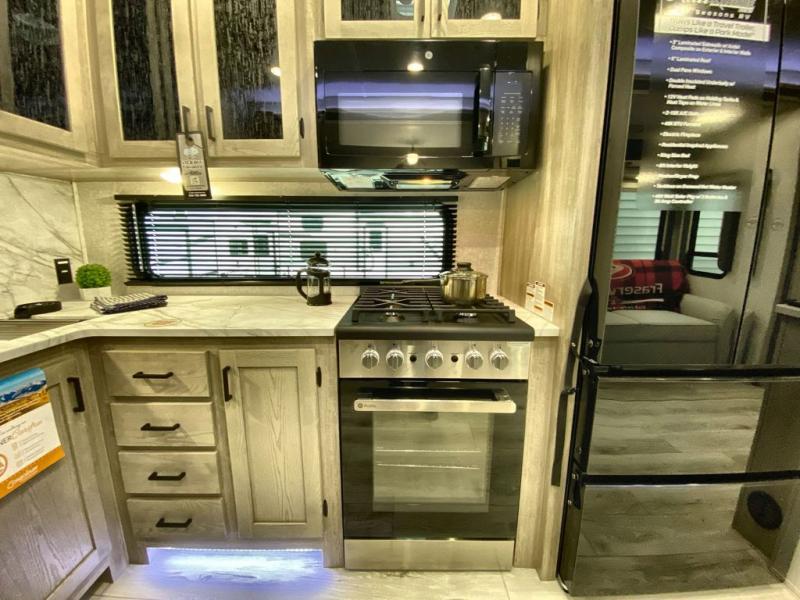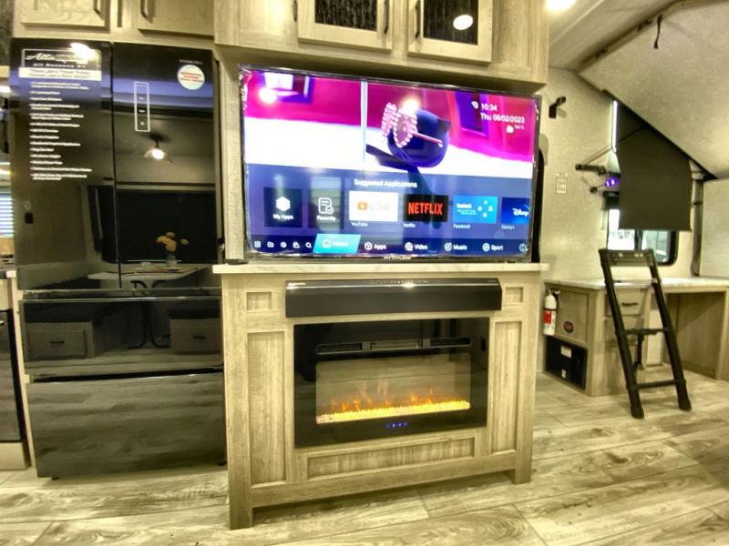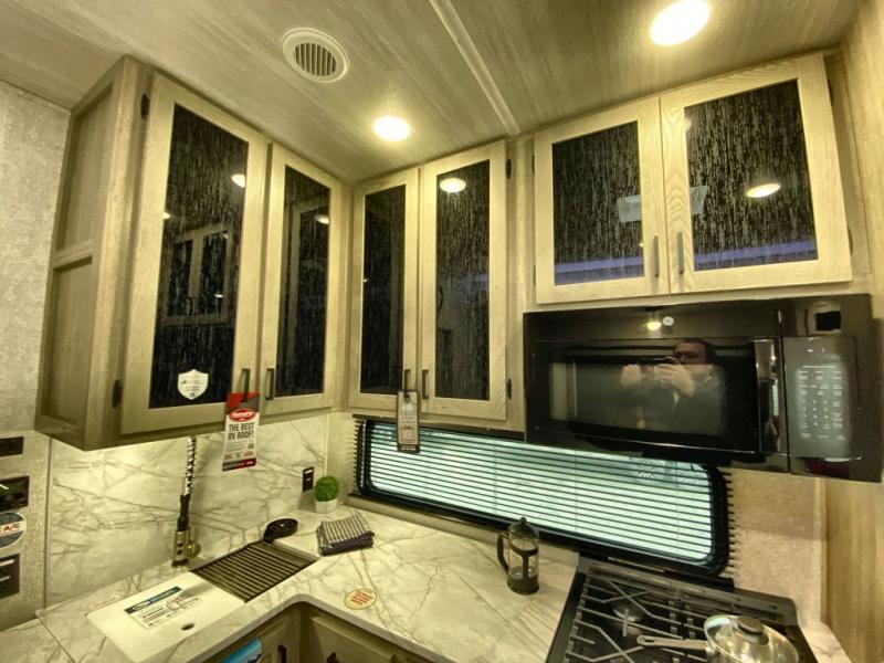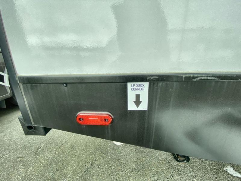 Head to the campground in this travel trailer! After you've unloaded the pass-through storage and set up the 21' power awning, start lunch by extending the countertop extension. You can get a good night's rest on the king bed in the front private bedroom and any extra guests can sleep on the stowable bunk system with a ladder above the office area which is also conveniently next to the rear corner bathroom. Across from the bunk system is a large closet with washer and dryer prep if you want the option to make laundry day easier. The free standing dinette has storage underneath and is right next to the pantry for easy snack grabbing. You also have a tri-fold sofa for extra sleeping space or you can switch it out for the optional theater seating.