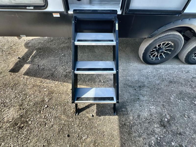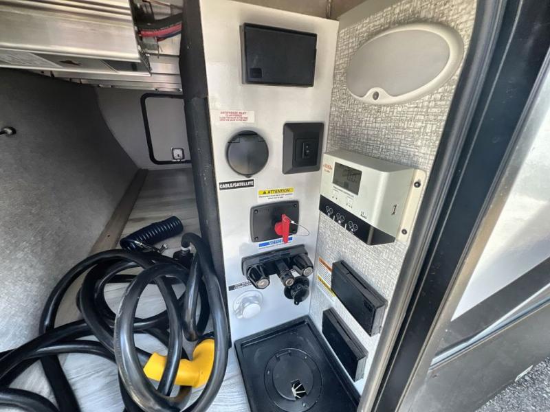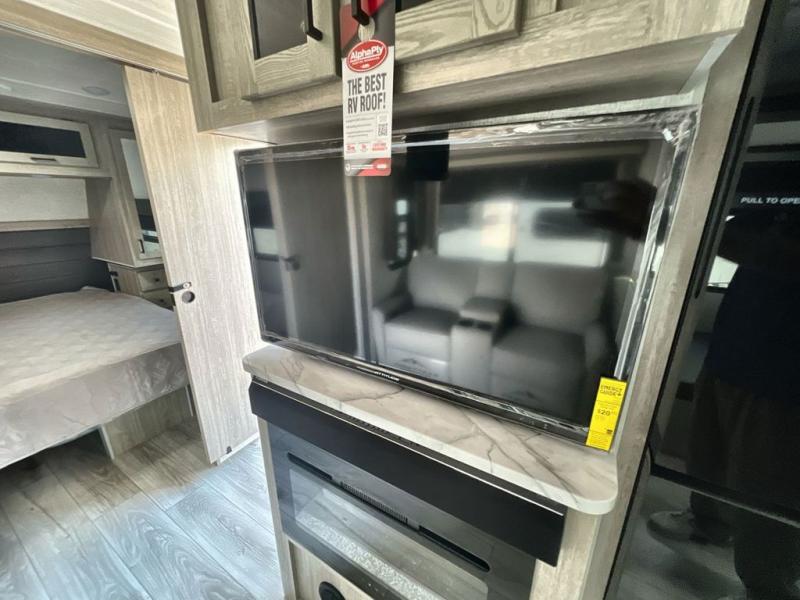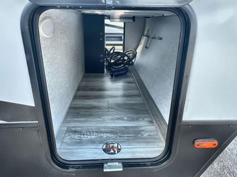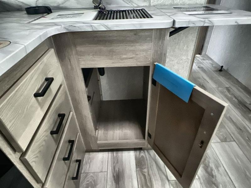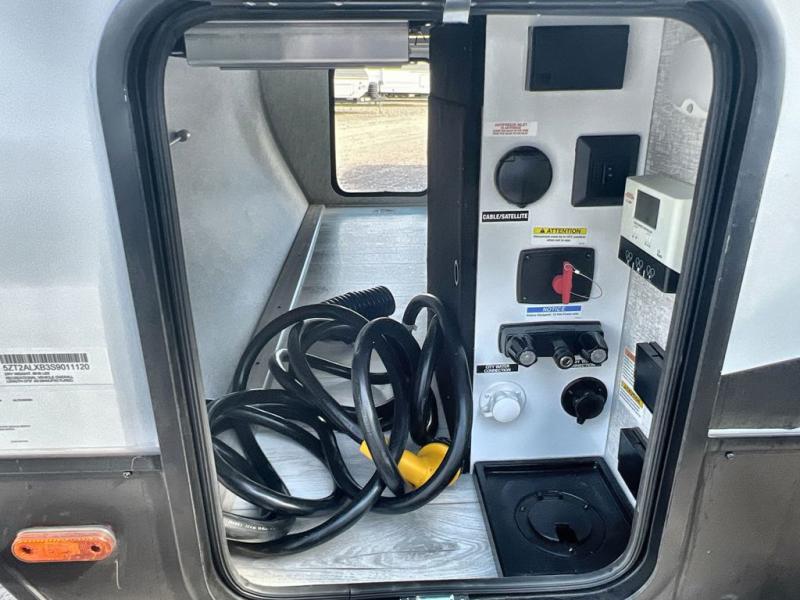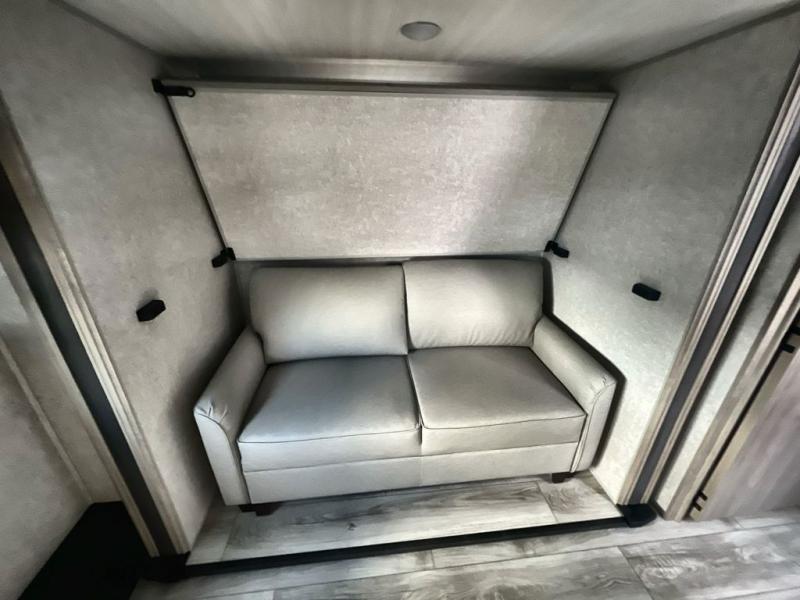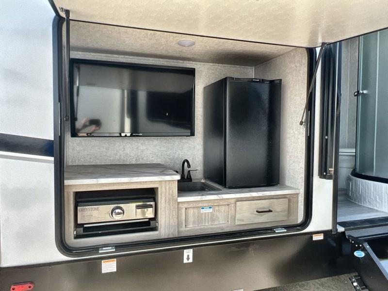 If you're looking for a travel trailer to take tailgating, this Alta model is the one! After you've unloaded the pass-through storage and set up the 21' power awning, start lunch on the outside kitchen! Since there are dual entry doors you can enter in through the main living area, or the full bath for convenience. The little ones are sure to spend most of their time in the rear bunkhouse that includes a flip-up bunk under the sofa, plus a second bunk across the room. The adults can visit at the booth dinette or on the tri-fold sofa, and check out the front private bedroom with sliding doors and a king bed for all-around comfort!
