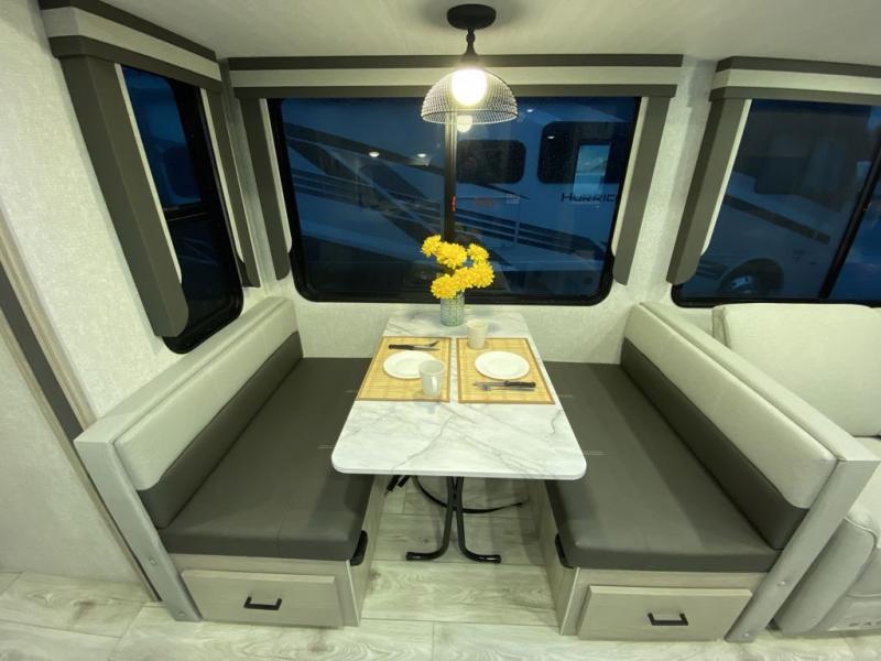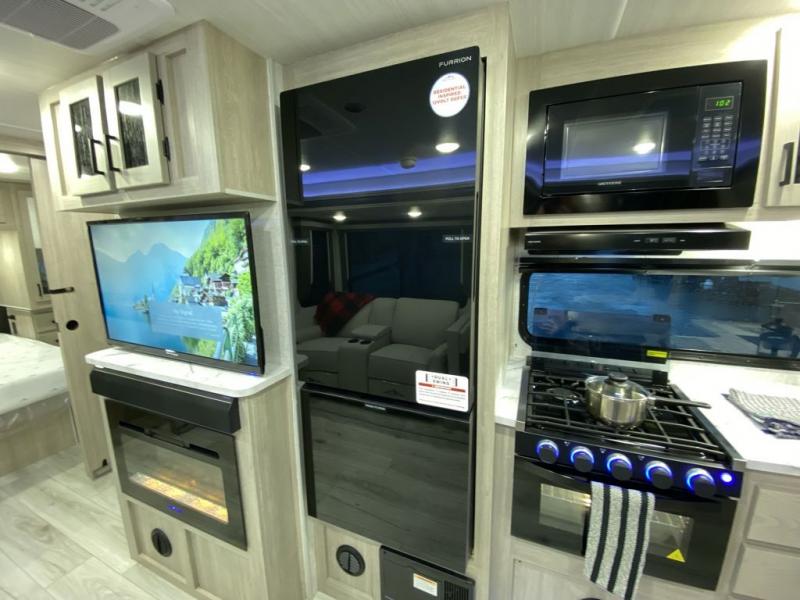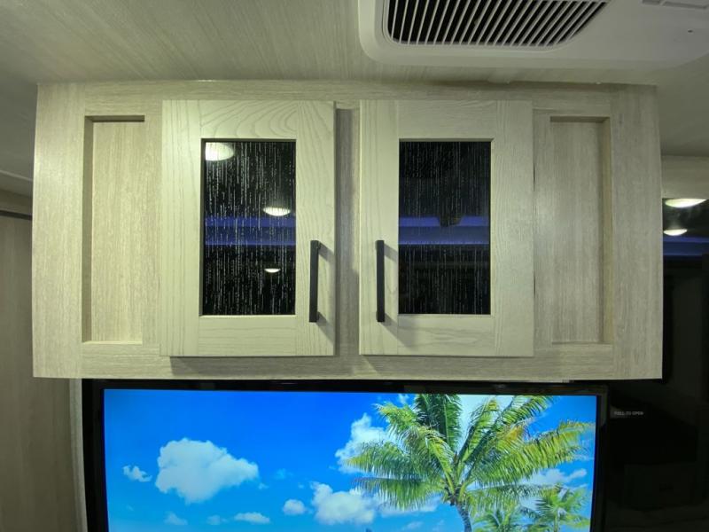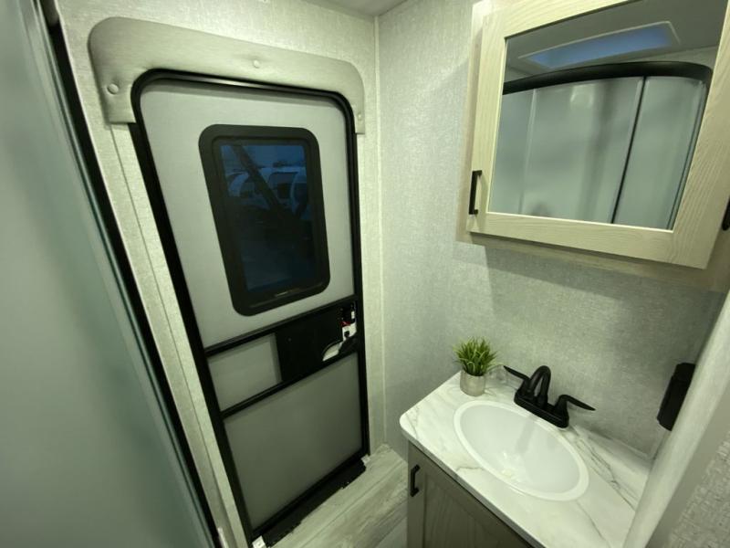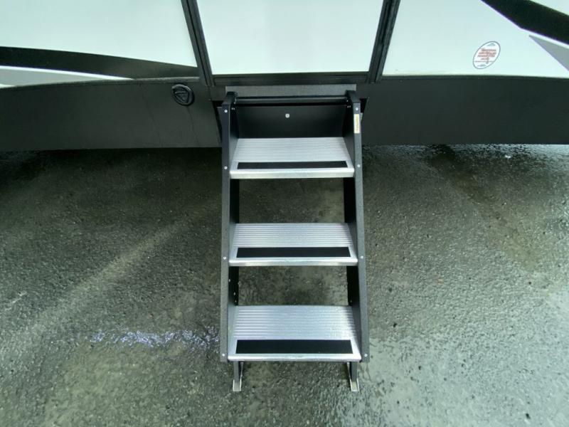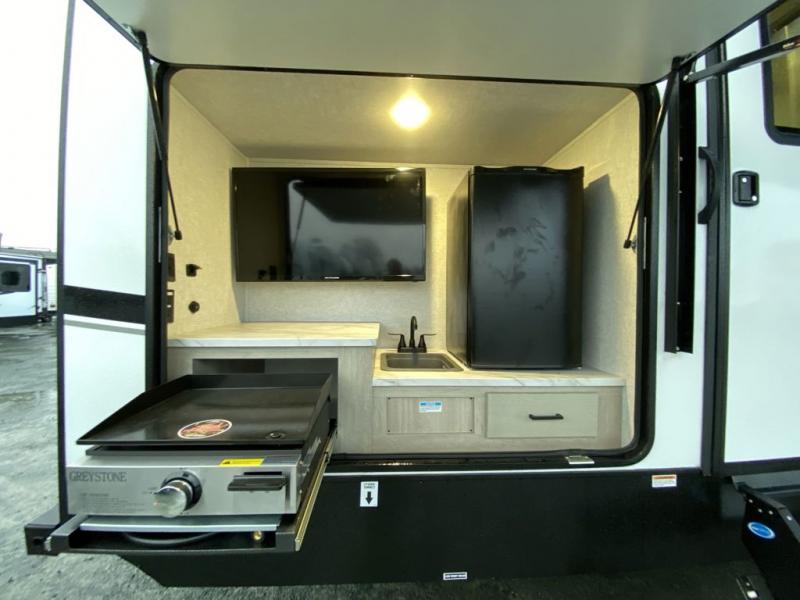 If you're looking for a travel trailer to take tailgating, this Alta model is the one! After you've unloaded the pass-through storage and set up the 21' power awning, start lunch on the outside kitchen! Since there are dual entry doors you can enter in through the main living area, or the full bath for convenience. The little ones are sure to spend most of their time in the rear bunkhouse that includes a flip-up bunk under the sofa, plus a second bunk across the room. The adults can visit at the booth dinette or on the tri-fold sofa, and check out the front private bedroom with sliding doors and a king bed for all-around comfort!