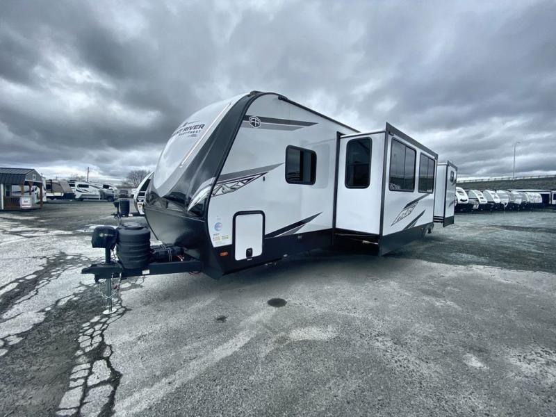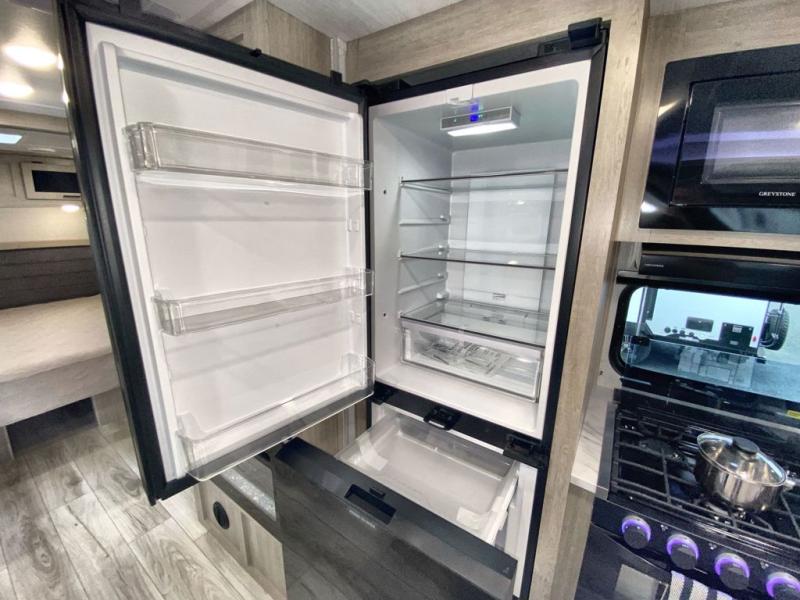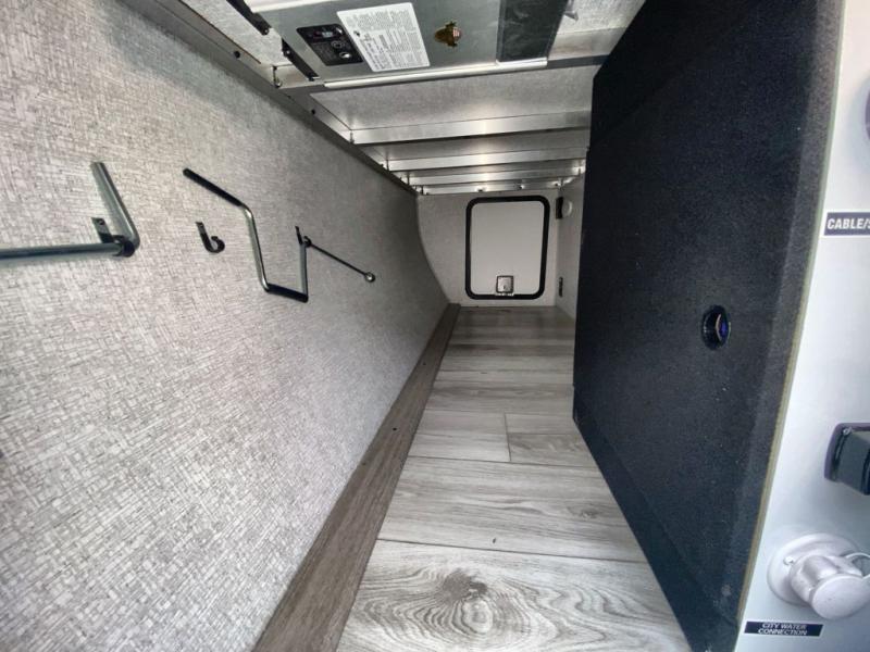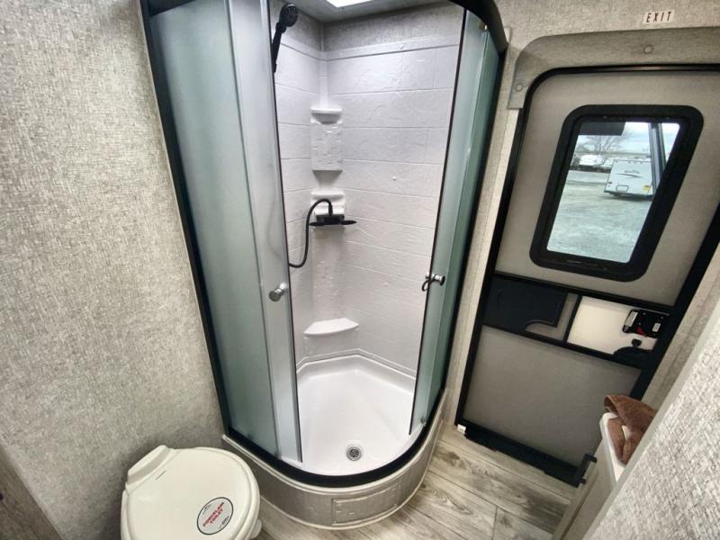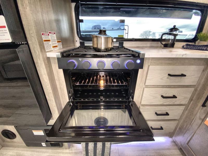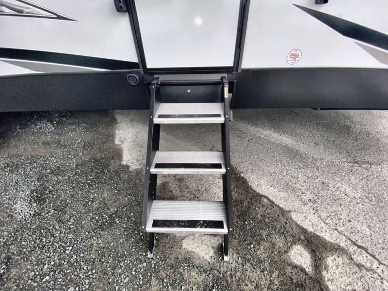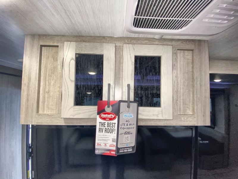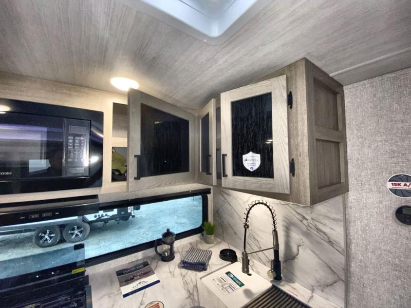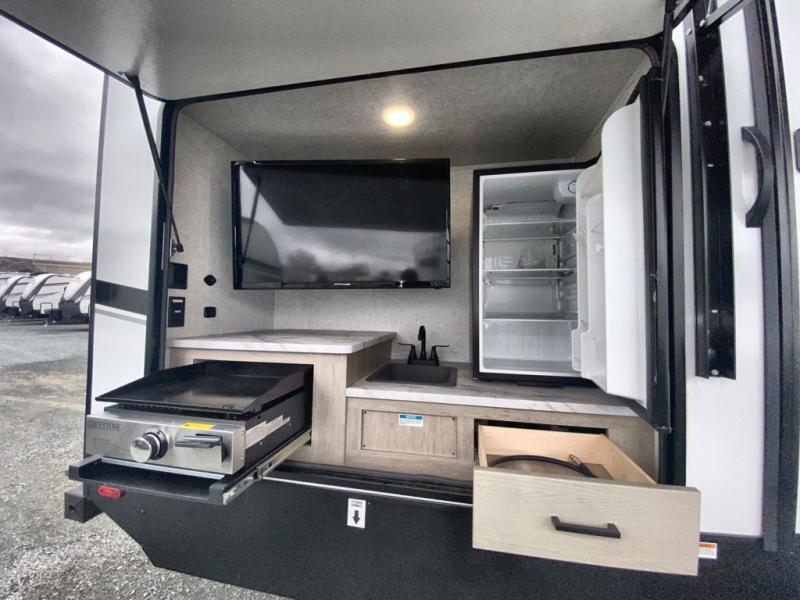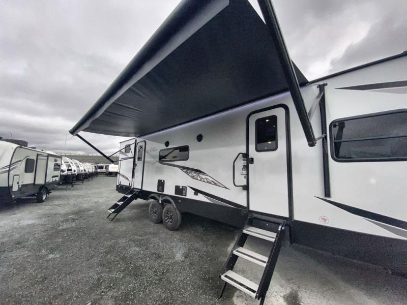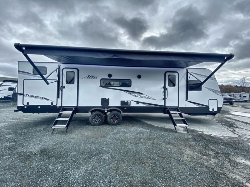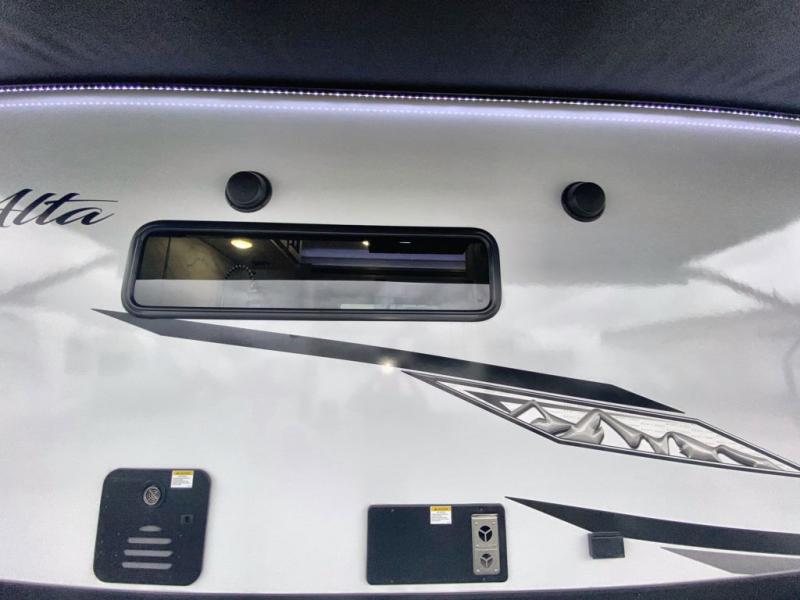 If you're looking for a travel trailer to take tailgating, this Alta model is the one! After you've unloaded the pass-through storage and set up the 21' power awning, start lunch on the outside kitchen! Since there are dual entry doors you can enter in through the main living area, or the full bath for convenience. The little ones are sure to spend most of their time in the rear bunkhouse that includes a flip-up bunk under the sofa, plus a second bunk across the room. The adults can visit at the booth dinette or on the tri-fold sofa, and check out the front private bedroom with sliding doors and a king bed for all-around comfort!