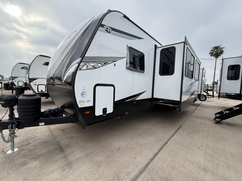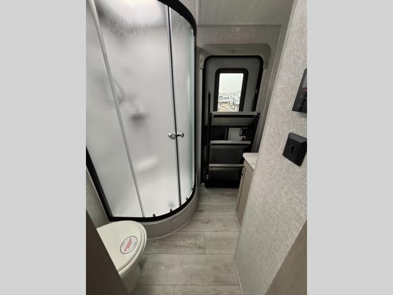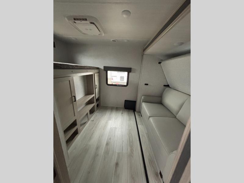 If you're looking for a travel trailer to take tailgating, this Alta model is the one! After you've unloaded the pass-through storage and set up the 21' power awning, start lunch on the outside kitchen! Since there are dual entry doors you can enter in through the main living area, or the full bath for convenience. The little ones are sure to spend most of their time in the rear bunkhouse that includes a flip-up bunk under the sofa, plus a second bunk across the room. The adults can visit at the booth dinette or on the tri-fold sofa, and check out the front private bedroom with sliding doors and a king bed for all-around comfort!