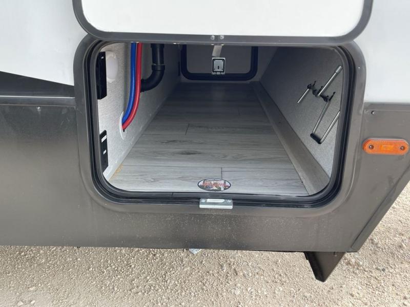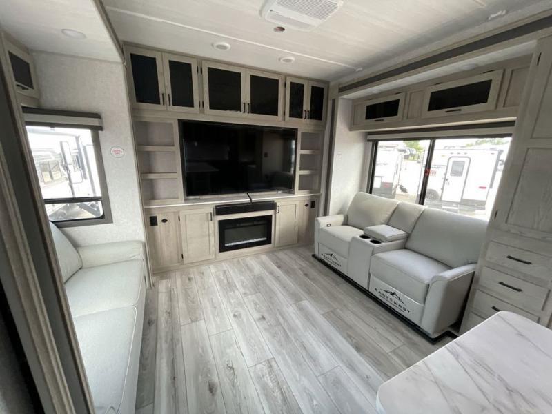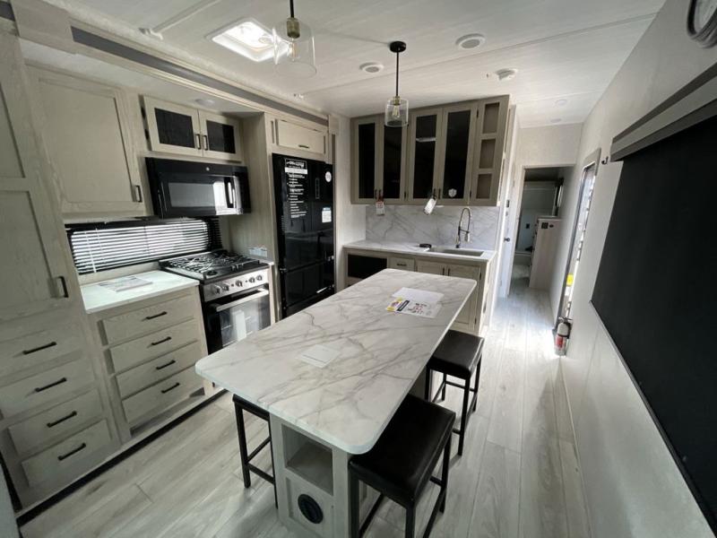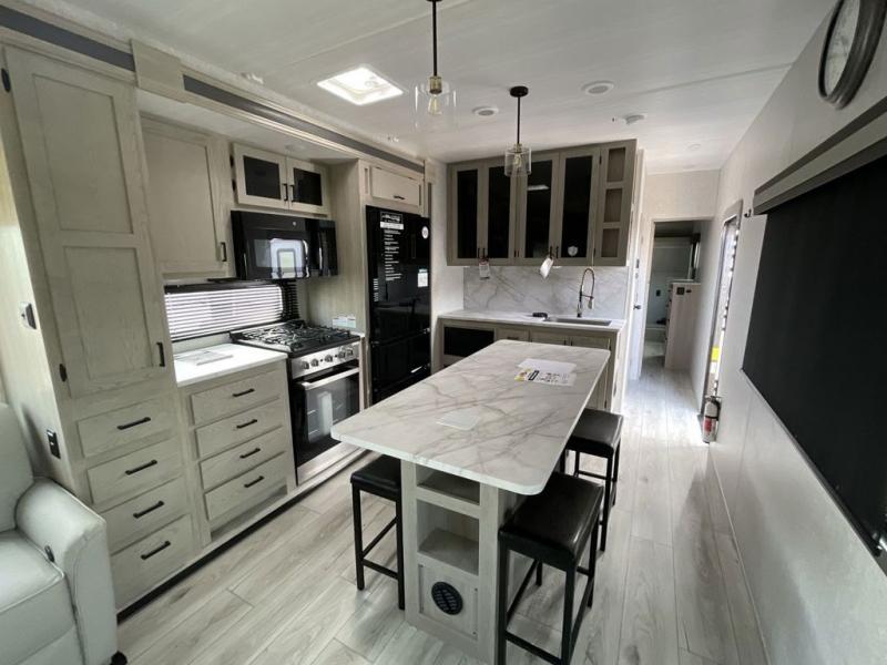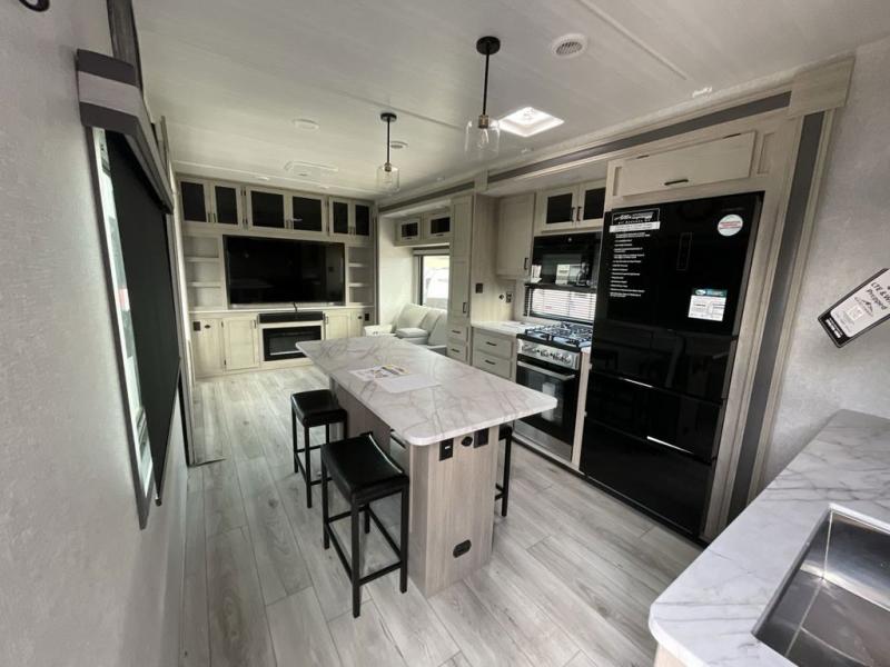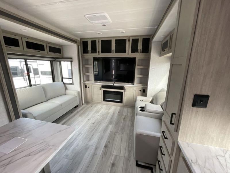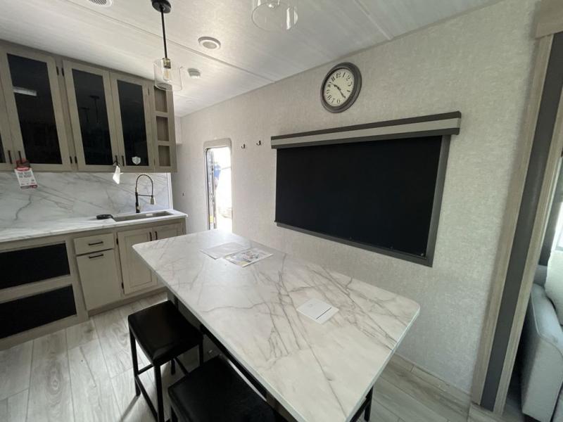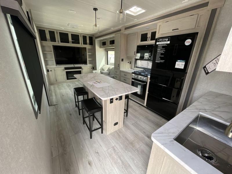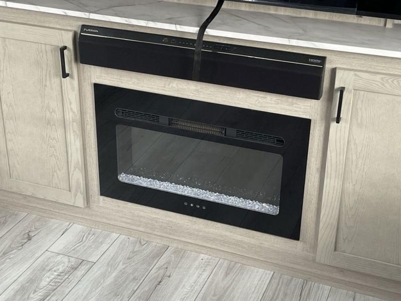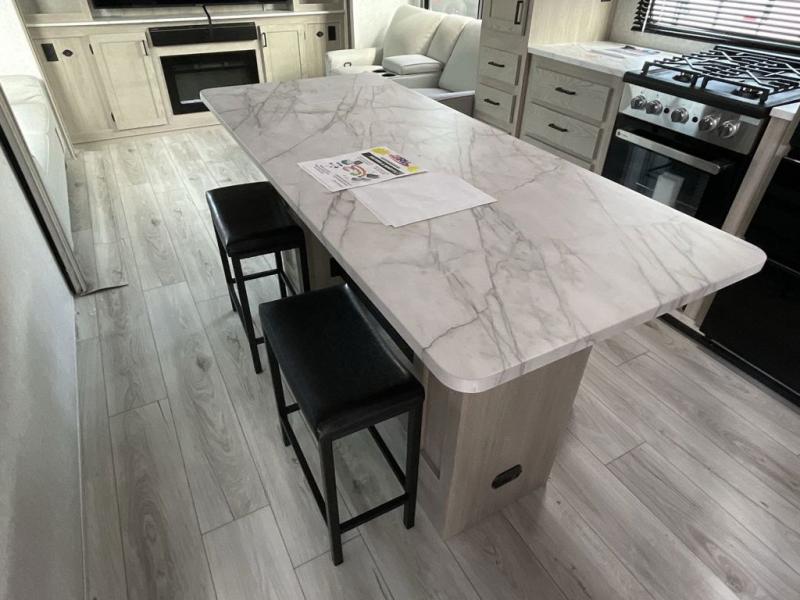 You will feel right at home in this travel trailer! After you've unloaded the pass-through storage and set up the 21' power awning, start preparing lunch will all of the countertop space next to the kitchen sink. You can get a good night's rest on the king bed slide in the front private bedroom and store your clothes in the large front wardrobe. There is even a sliding door washer and dryer prep here if you want the option to add these appliances. The adjustable free standing table offers a comfortable place to enjoy your meals and play card games. Inside the rear living area, you will find opposing slides with a tri-fold sofa and theater seats, as well as a second set of theater seats directly across from the rear entertainment center and fireplace!