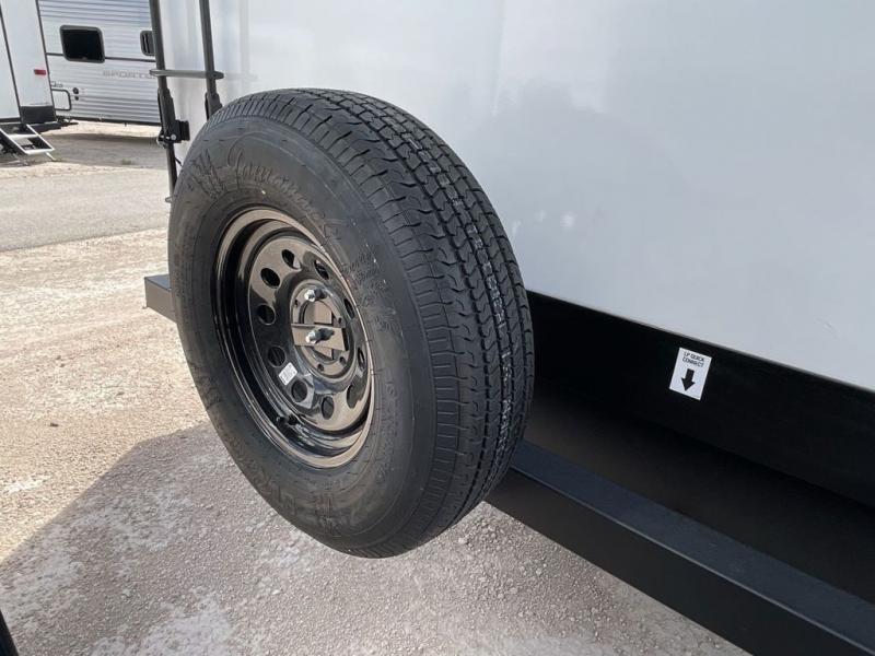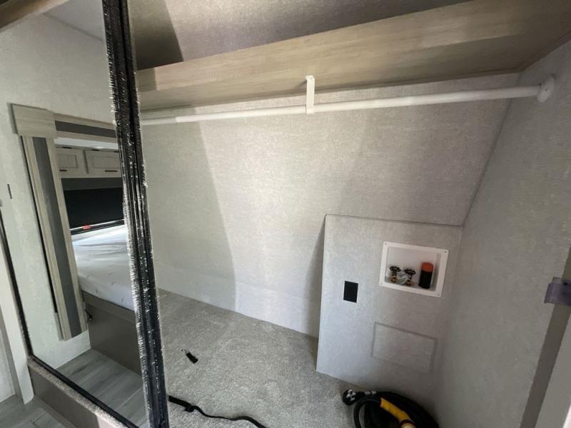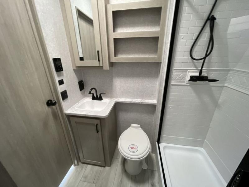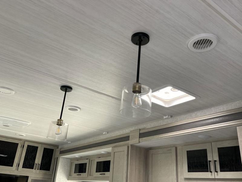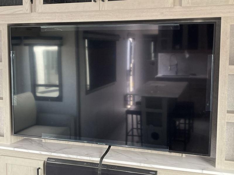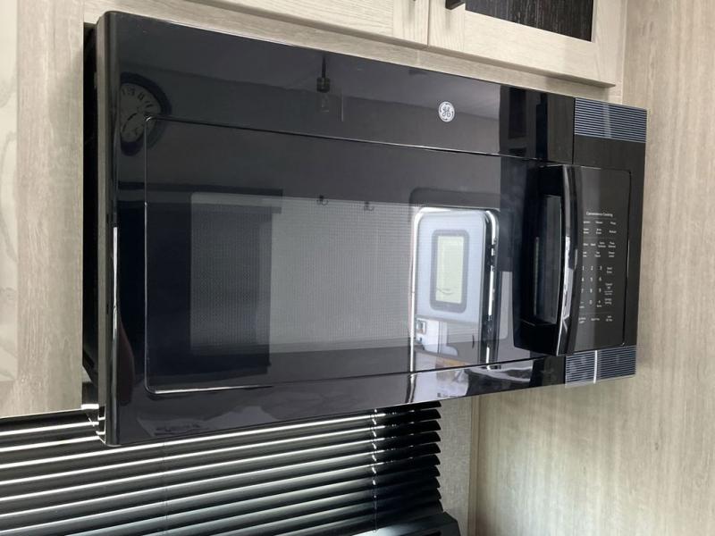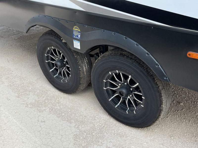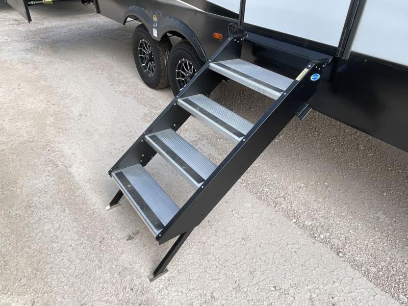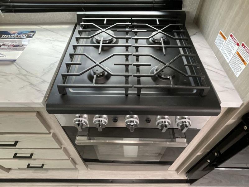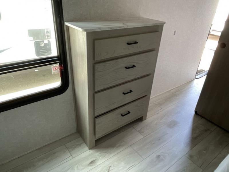You will feel right at home in this travel trailer! After you've unloaded the pass-through storage and set up the 21' power awning, start preparing lunch will all of the countertop space next to the kitchen sink. You can get a good night's rest on the king bed slide in the front private bedroom and store your clothes in the large front wardrobe. There is even a sliding door washer and dryer prep here if you want the option to add these appliances. The adjustable free standing table offers a comfortable place to enjoy your meals and play card games. Inside the rear living area, you will find opposing slides with a tri-fold sofa and theater seats, as well as a second set of theater seats directly across from the rear entertainment center and fireplace!