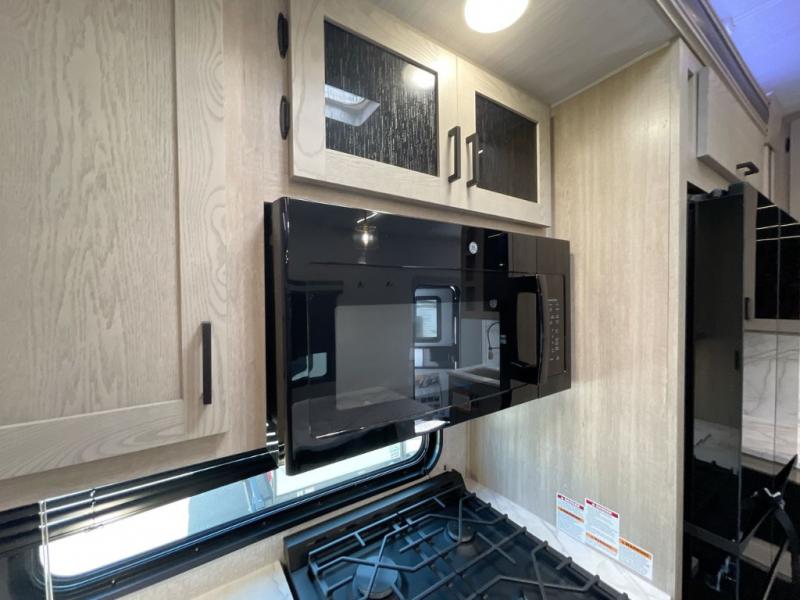 You will feel right at home in this travel trailer! After you've unloaded the pass-through storage and set up the 21' power awning, start preparing lunch will all of the countertop space next to the kitchen sink. You can get a good night's rest on the king bed slide in the front private bedroom and store your clothes in the large front wardrobe. There is even a sliding door washer and dryer prep here if you want the option to add these appliances. The adjustable free standing table offers a comfortable place to enjoy your meals and play card games. Inside the rear living area, you will find opposing slides with a tri-fold sofa and theater seats, as well as a second set of theater seats directly across from the rear entertainment center and fireplace!