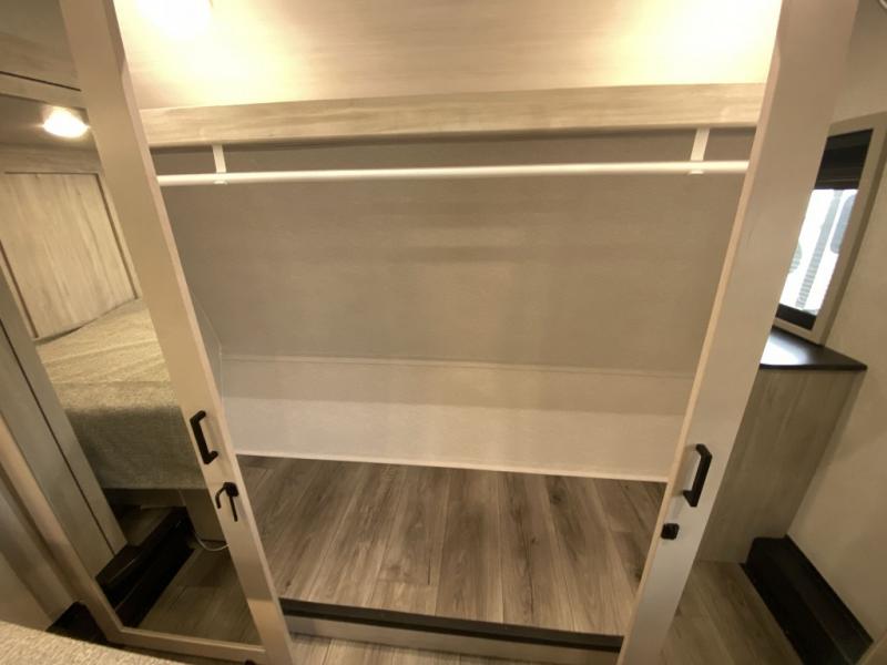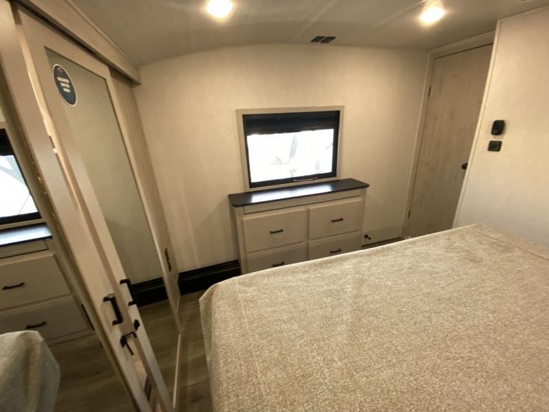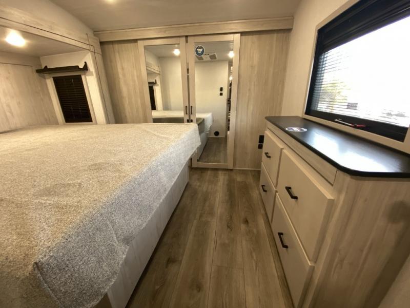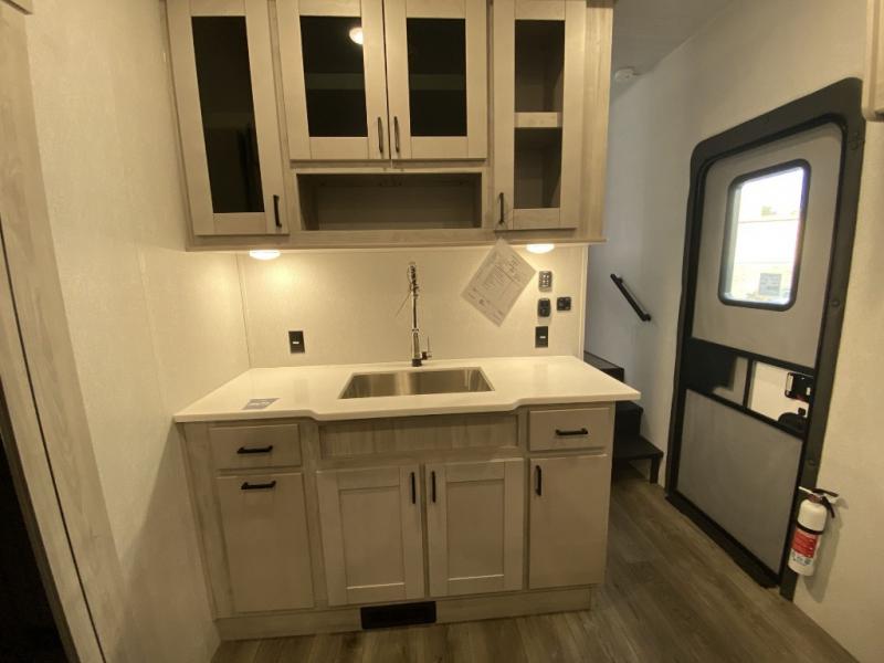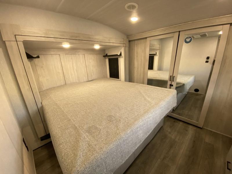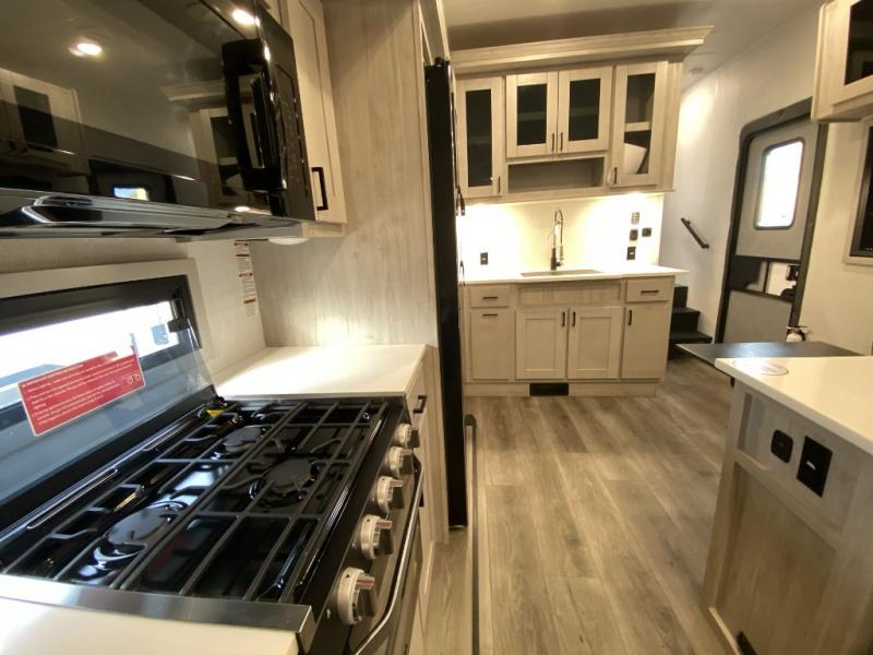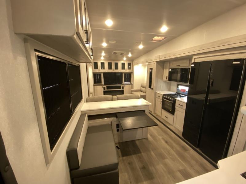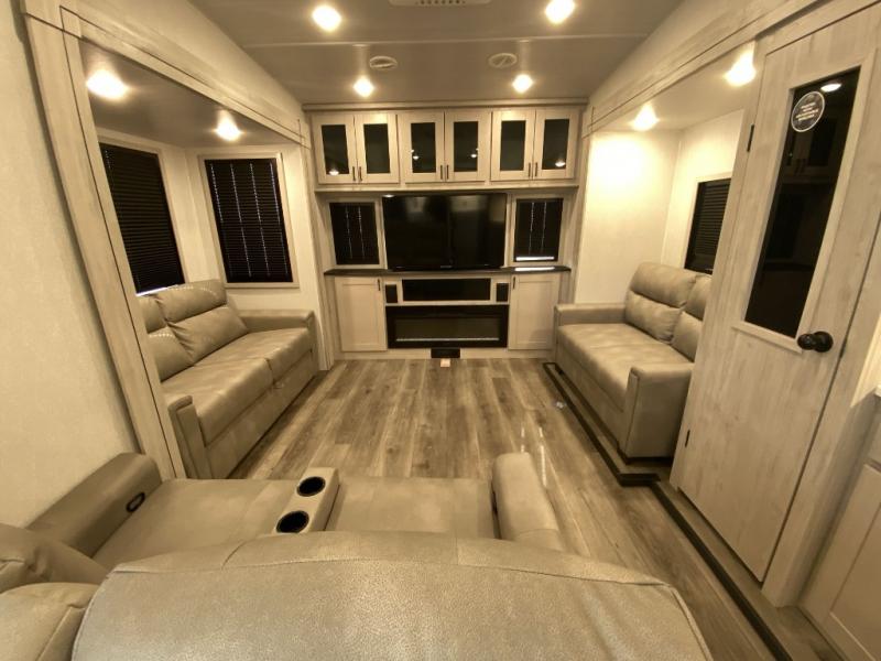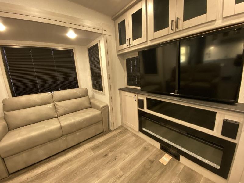 Roughing it in the woods will hardly feel like roughing it in this cozy fifth wheel for six! You'll have a full kitchen to cook in each day that includes a four burner range with a 30" over-the-range microwave, ample counter space to prep meals, and a 16 cu. ft. 12V refrigerator that will hold food for the whole week. There is also a free-standing adjustable dinette here with a storage ottoman and a counter that overlooks the rear living area. Here, you'll enjoy two hide-a-bed sofas and theater seating across from the fireplace and 50" TV. And this room can double as your guests' bedroom at night! You'll be able to claim the front private bedroom with a king bed slide out, a full-length wardrobe with more!