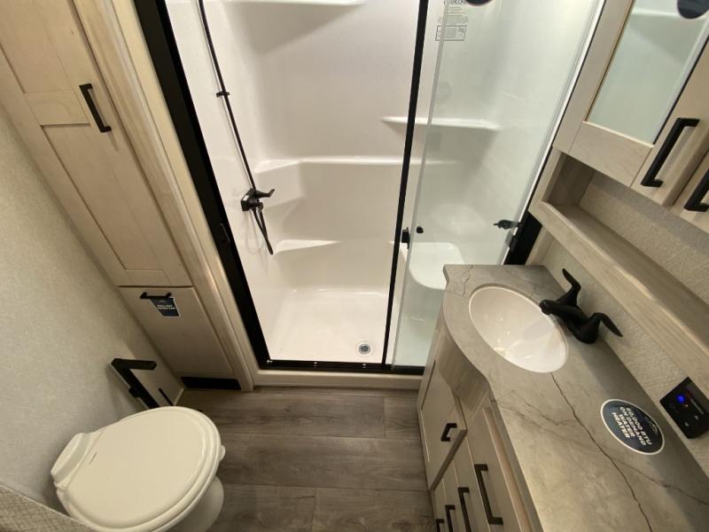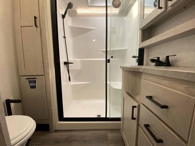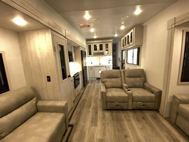 With any Blackthorn mid-profile fifth wheel by EAST TO WEST, you will find luxury amenities at every turn! There is Radiant Technology Composites insulation in the roof, front cap and underbelly, plus Azdel laminated sidewalls with block foam insulation for 4-seasons camping! You will love how easy it will be to tow your fifth wheel with Dexter axles and a MORryde CRE 3000 suspension, and the electric automatic leveling system means you can set up camp in no-time! The exterior also includes an adjustable power awning with LED lights, LED motion sensor lights in the pass-through storage, and a universal all-in-one docking station to easily manage your units tank levels and functions. Head inside to find vinyl flooring, solid wood shaker style cabinet doors with hidden hinges, a seamless fiberglass shower, and many more elegant features!