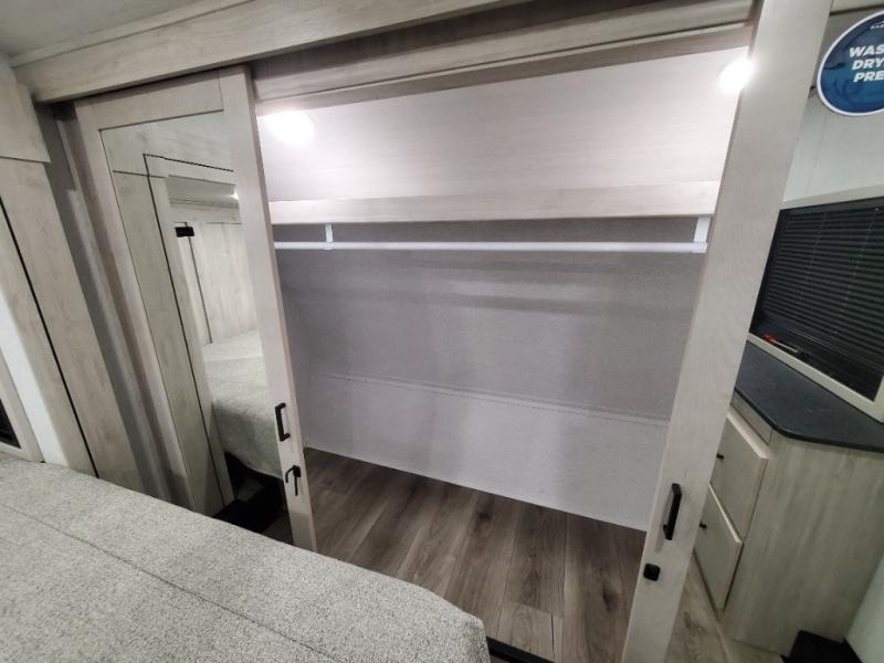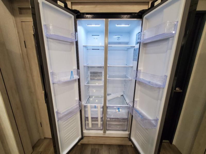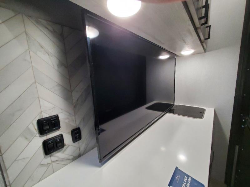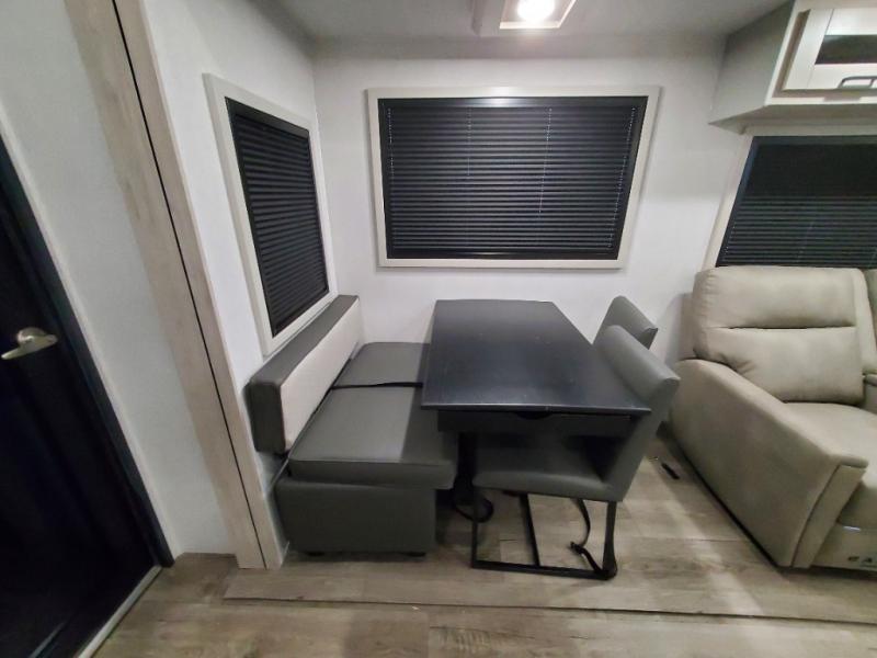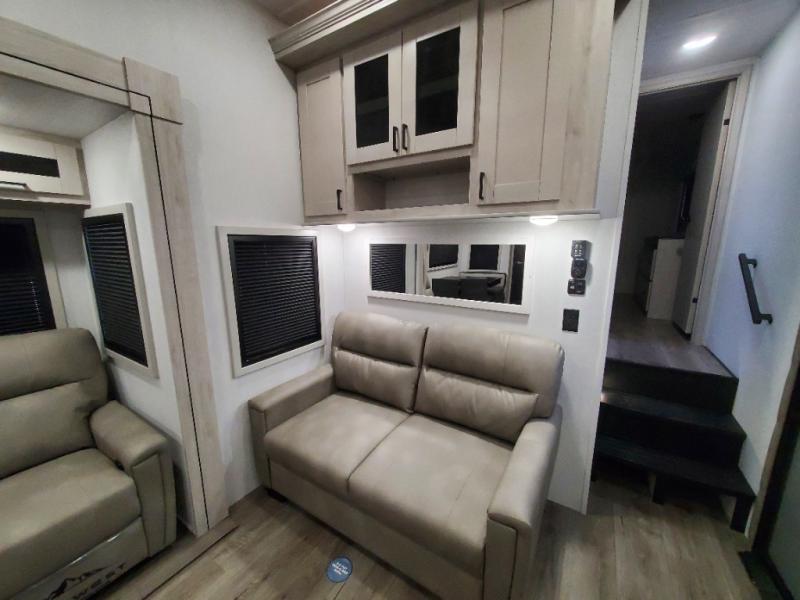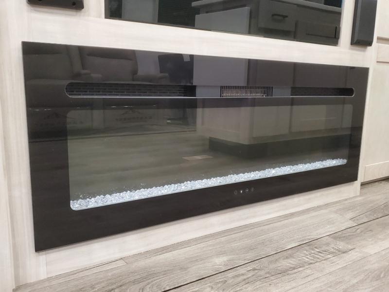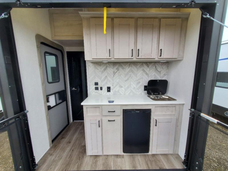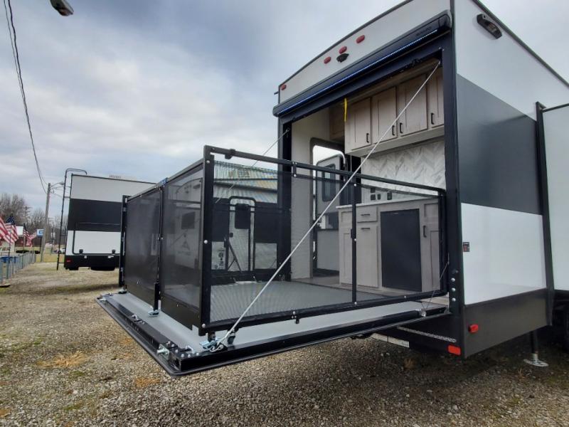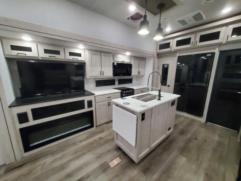 You won't believe all that this fifth wheel has to offer! As you step up into the rear patio, you will notice the outdoor kitchen which has a sink, countertop space, a mini fridge, and a 50" telescoping TV to watch the big game while you enjoy a cold beverage and fresh air. The interior kitchen has everything you need to prepare delicious home cooked meals including a large pantry to store all of your snacks and a kitchen island with countertop extensions for even more prepping space. Enjoy your meals at the free standing dinette with ottoman storage on one side and chairs on the other. The hide-a-bed sofa not only offers a comfortable place to sit in addition to the theater seating, but also a place to sleep once you are done watching a movie on the 50" telescoping TV with fireplace below it. Everyone can freshen up in the full bathroom with a 30" x 48" shower with skylight. The front private bedroom has a king bed slide with storage underneath, a dresser with TV prep, and a front closet that is prepped to add a washer and dryer!