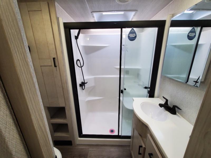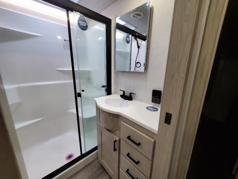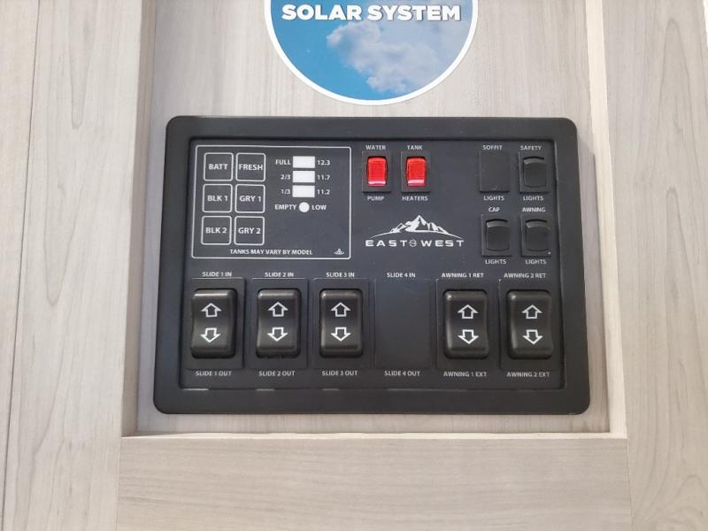 With any Blackthorn mid-profile fifth wheel by EAST TO WEST, you will find luxury amenities at every turn! There is Radiant Technology Composites insulation in the roof, front cap and underbelly, plus Azdel laminated sidewalls with block foam insulation for 4-seasons camping! You will love how easy it will be to tow your fifth wheel with Dexter axles and a MORryde CRE 3000 suspension, and the electric automatic leveling system means you can set up camp in no-time! The exterior also includes an adjustable power awning with LED lights, LED motion sensor lights in the pass-through storage, and a universal all-in-one docking station to easily manage your units tank levels and functions. Head inside to find vinyl flooring, solid wood shaker style cabinet doors with hidden hinges, a seamless fiberglass shower, and many more elegant features!