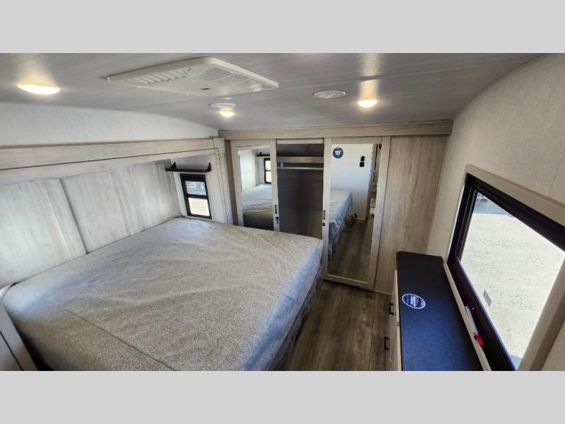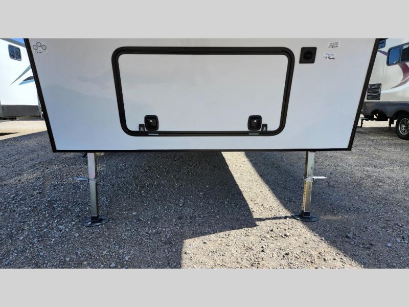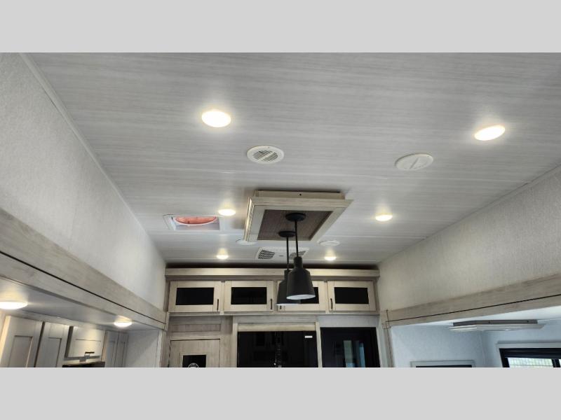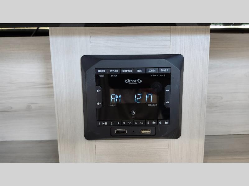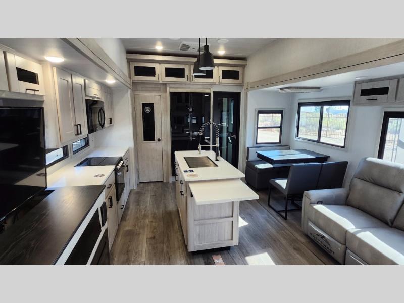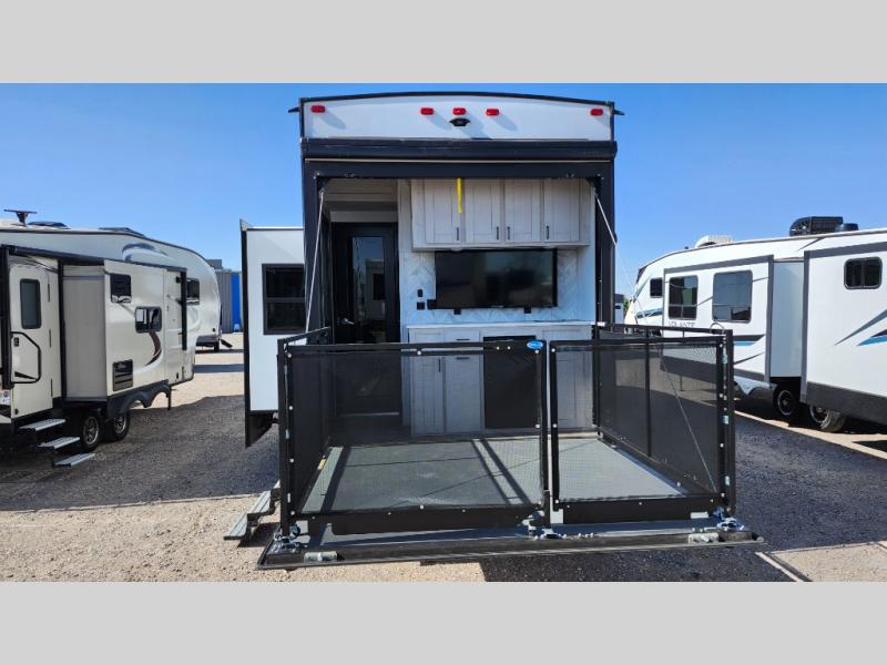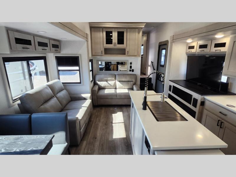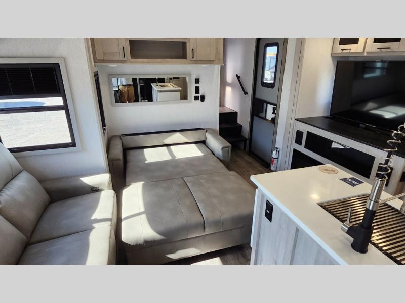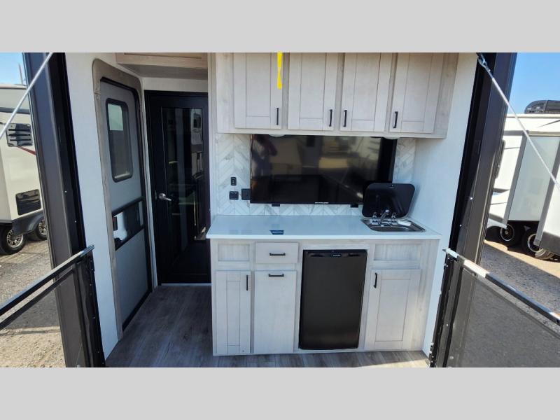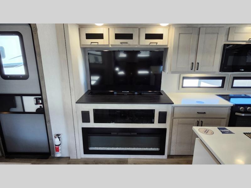 You won't believe all that this fifth wheel has to offer! As you step up into the rear patio, you will notice the outdoor kitchen which has a sink, countertop space, a mini fridge, and a 50" telescoping TV to watch the big game while you enjoy a cold beverage and fresh air. The interior kitchen has everything you need to prepare delicious home cooked meals including a large pantry to store all of your snacks and a kitchen island with countertop extensions for even more prepping space. Enjoy your meals at the free standing dinette with ottoman storage on one side and chairs on the other. The hide-a-bed sofa not only offers a comfortable place to sit in addition to the theater seating, but also a place to sleep once you are done watching a movie on the 50" telescoping TV with fireplace below it. Everyone can freshen up in the full bathroom with a 30" x 48" shower with skylight. The front private bedroom has a king bed slide with storage underneath, a dresser with TV prep, and a front closet that is prepped to add a washer and dryer!