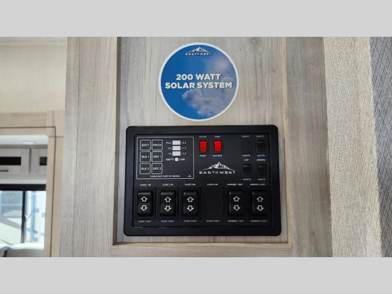 With any Blackthorn mid-profile fifth wheel by EAST TO WEST, you will find luxury amenities at every turn! There is Radiant Technology Composites insulation in the roof, front cap and underbelly, plus Azdel laminated sidewalls with block foam insulation for 4-seasons camping! You will love how easy it will be to tow your fifth wheel with Dexter axles and a MORryde CRE 3000 suspension, and the electric automatic leveling system means you can set up camp in no-time! The exterior also includes an adjustable power awning with LED lights, LED motion sensor lights in the pass-through storage, and a universal all-in-one docking station to easily manage your units tank levels and functions. Head inside to find vinyl flooring, solid wood shaker style cabinet doors with hidden hinges, a seamless fiberglass shower, and many more elegant features!