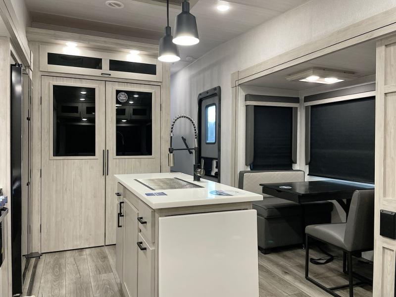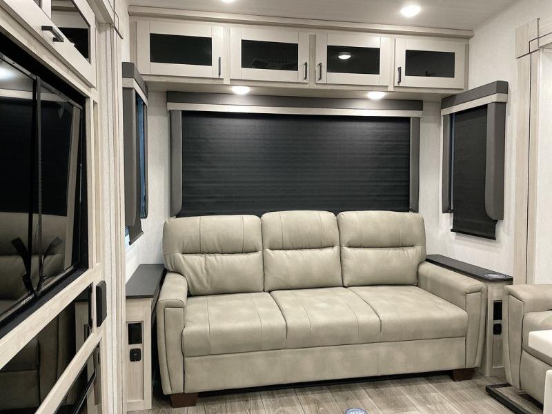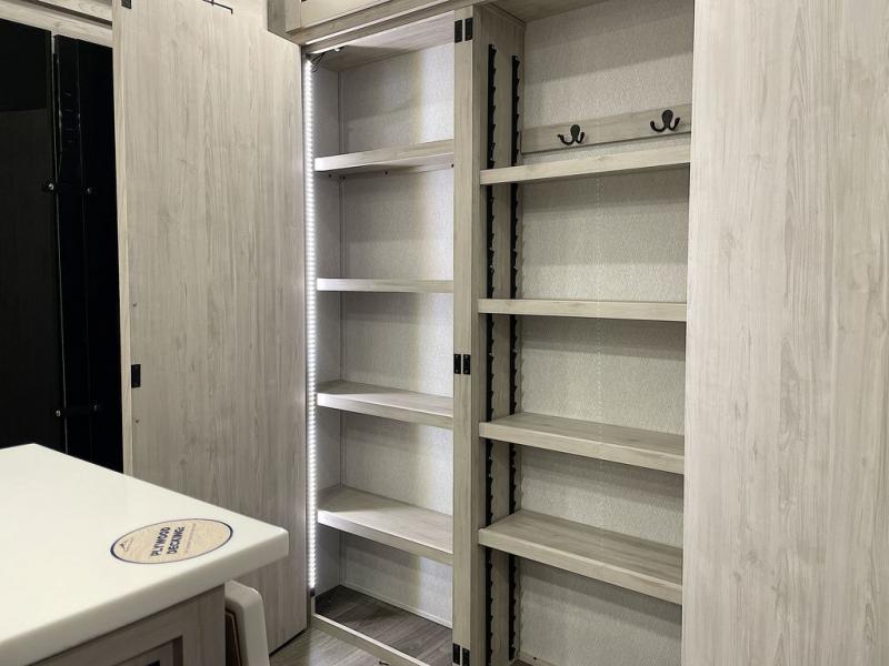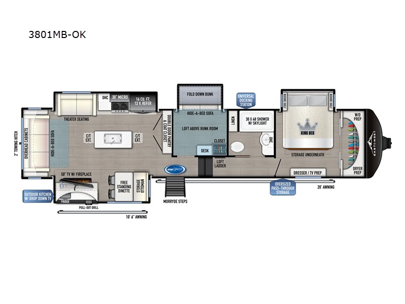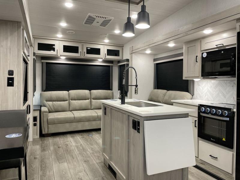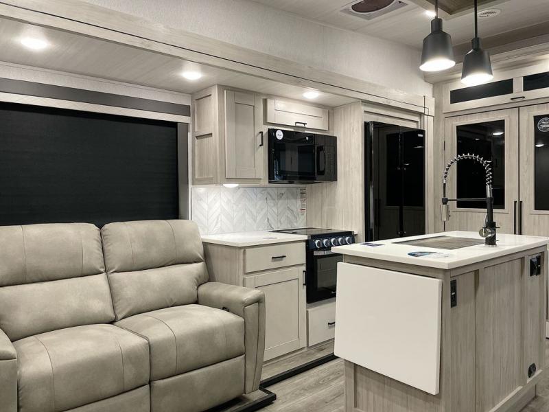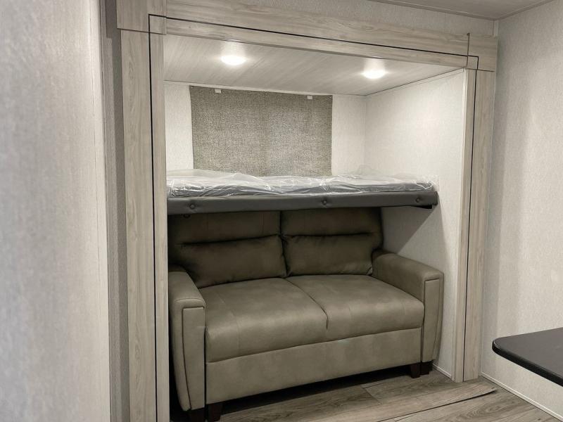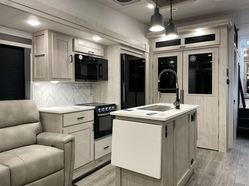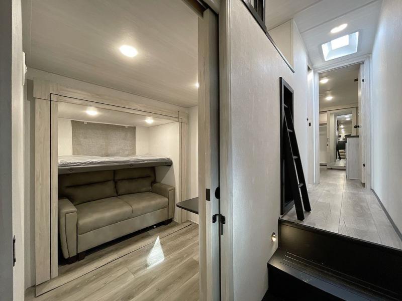 This is the ultimate fifth wheel for camping with extra friends and family! The layout is similar to model 3800MB, except the theater seating and entertainment center are on flipped slides of the unit, and this model includes an outdoor kitchen with a pull-out grill! You will have your own bedroom up front with a king bed slide out, a full-length wardrobe, and a dresser with TV prep if you like movies in bed. The middle bunk room includes a hide-a-bed sofa with a fold-down bunk above, a closet, and even a desk if you want to make this room into an office. And check out the loft above for more sleeping space or storage even! The main living area is made open with dual opposing slides, and your crew will find comfortable seating on the hide-a-bed sofa, theater seating, or free-standing dinette with a storage ottoman. This model also includes plenty of storage space, including a double door pantry with a coat closet, overhead cabinets, and an oversized pass-through storage for larger camp gear!