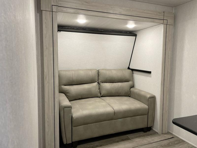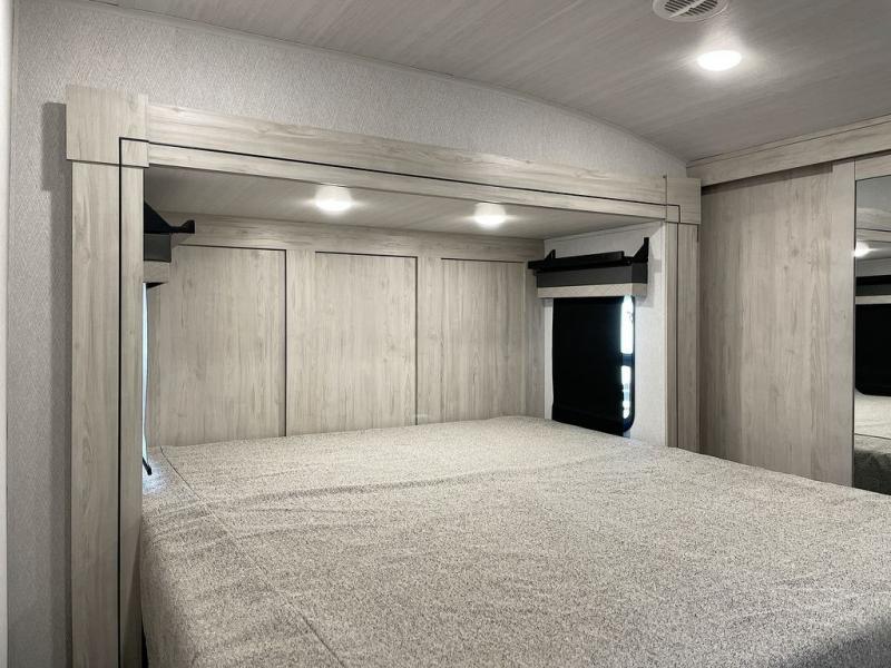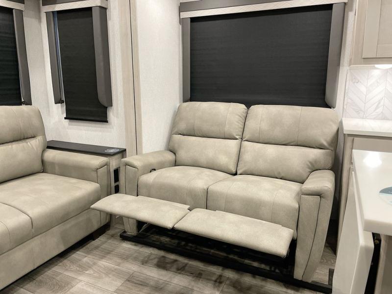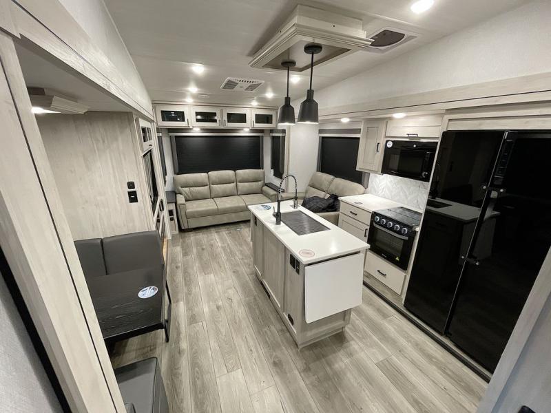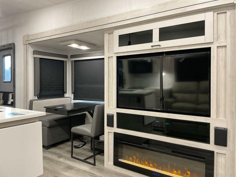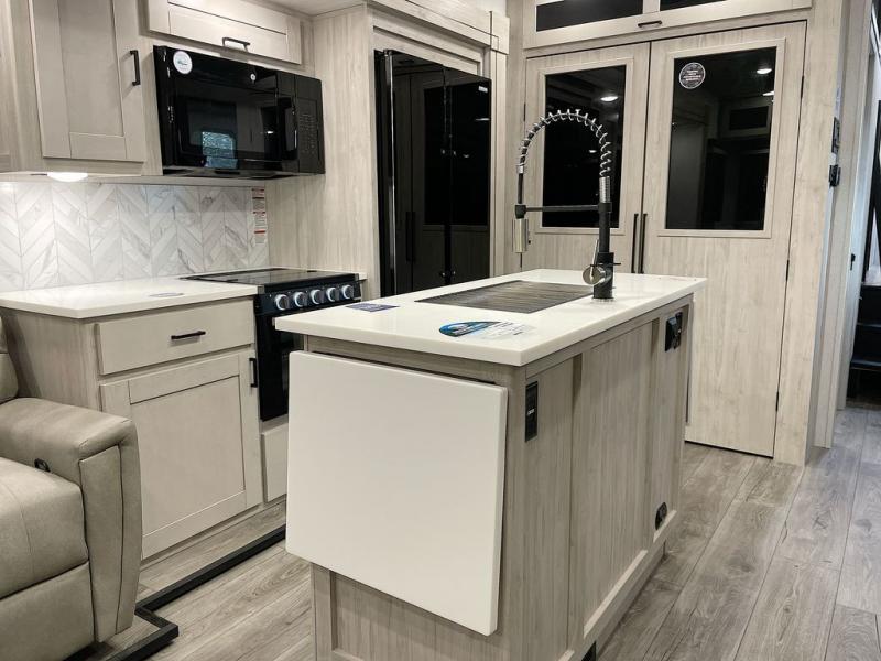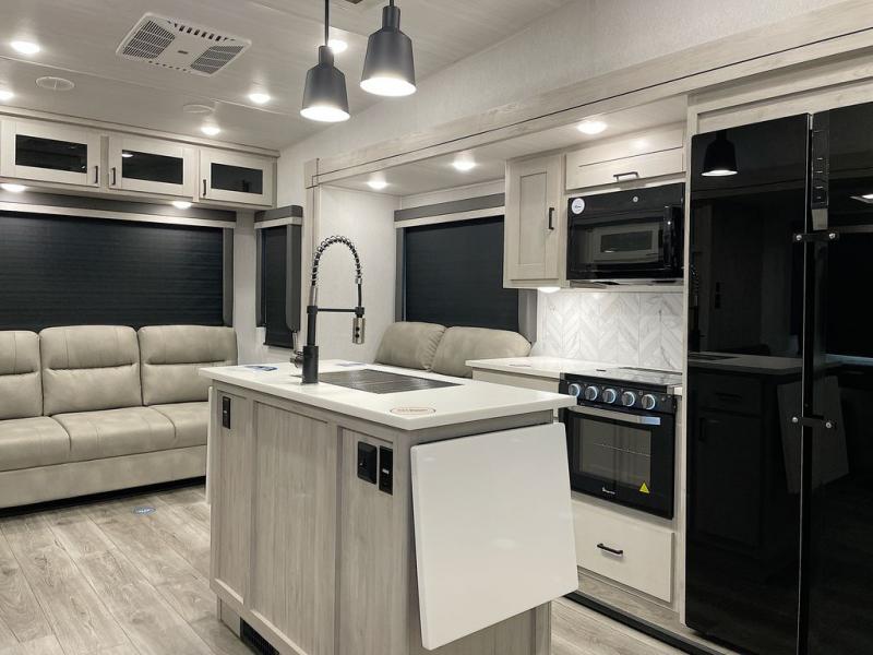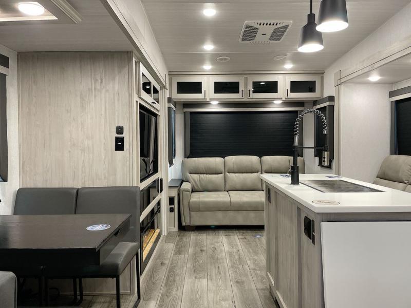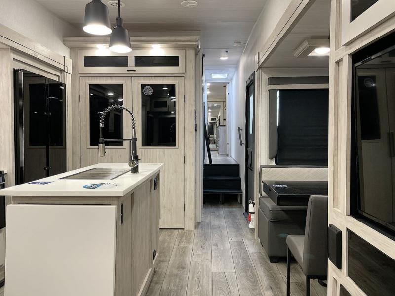 This is the ultimate fifth wheel for camping with extra friends and family! The layout is similar to model 3800MB, except the theater seating and entertainment center are on flipped slides of the unit, and this model includes an outdoor kitchen with a pull-out grill! You will have your own bedroom up front with a king bed slide out, a full-length wardrobe, and a dresser with TV prep if you like movies in bed. The middle bunk room includes a hide-a-bed sofa with a fold-down bunk above, a closet, and even a desk if you want to make this room into an office. And check out the loft above for more sleeping space or storage even! The main living area is made open with dual opposing slides, and your crew will find comfortable seating on the hide-a-bed sofa, theater seating, or free-standing dinette with a storage ottoman. This model also includes plenty of storage space, including a double door pantry with a coat closet, overhead cabinets, and an oversized pass-through storage for larger camp gear!
