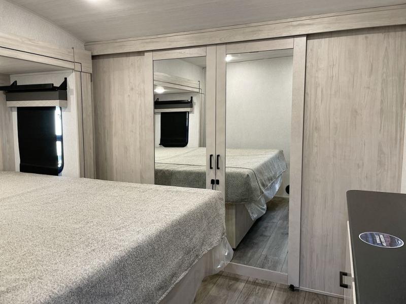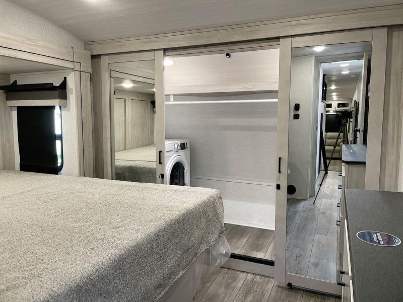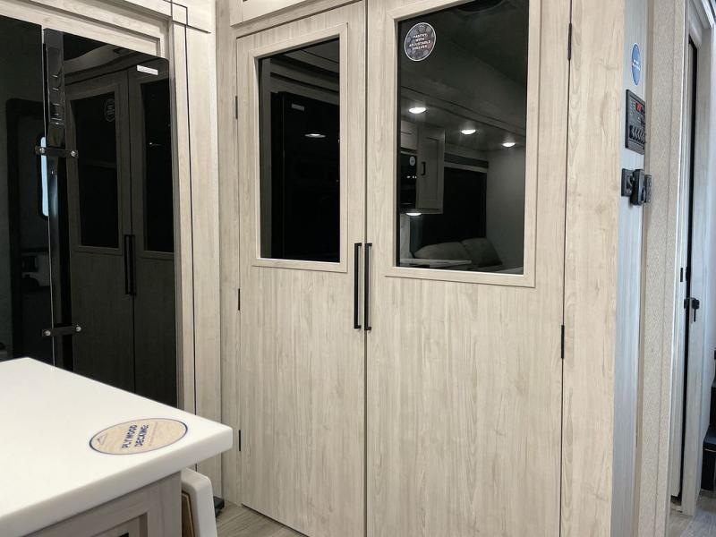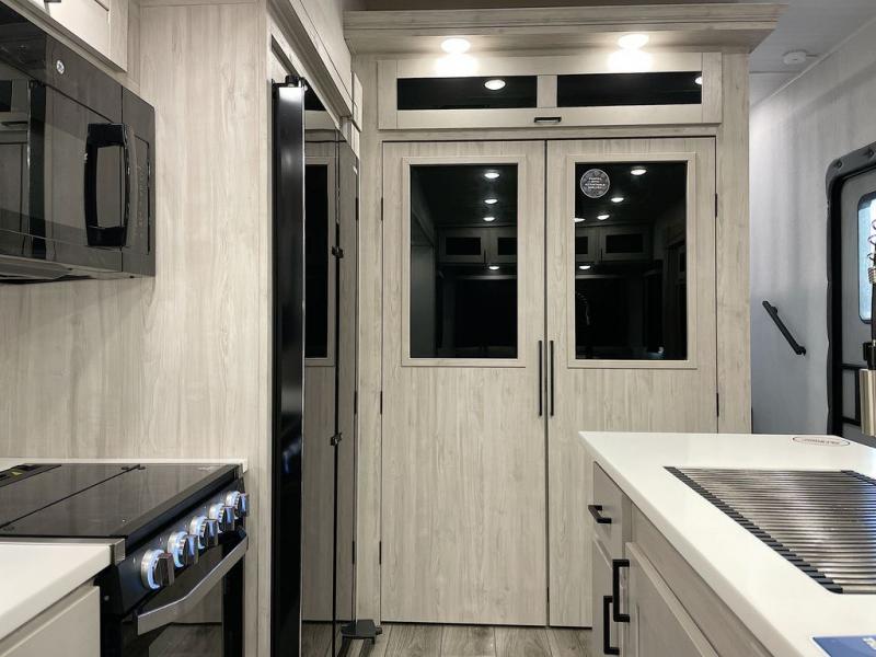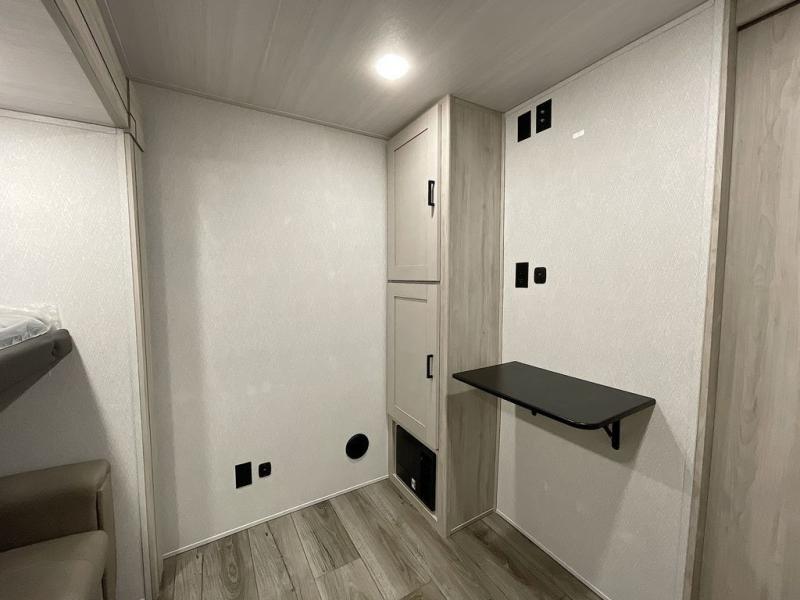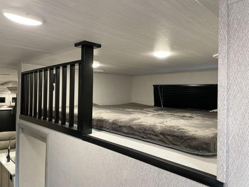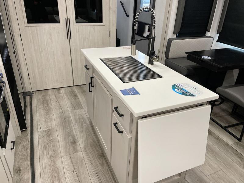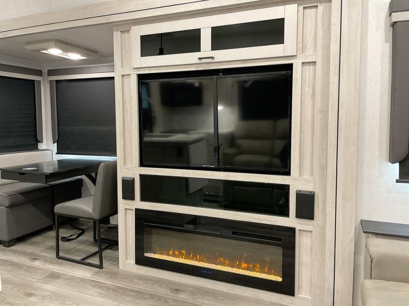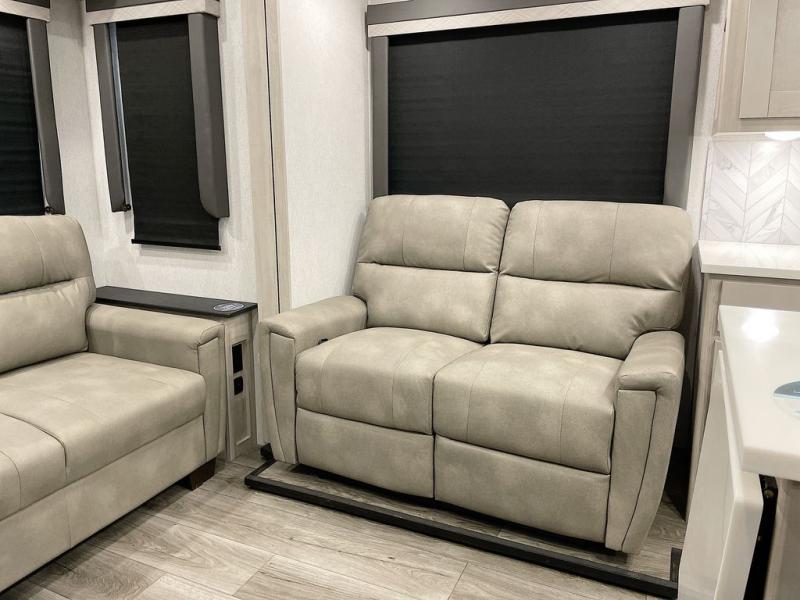 This is the ultimate fifth wheel for camping with extra friends and family! The layout is similar to model 3800MB, except the theater seating and entertainment center are on flipped slides of the unit, and this model includes an outdoor kitchen with a pull-out grill! You will have your own bedroom up front with a king bed slide out, a full-length wardrobe, and a dresser with TV prep if you like movies in bed. The middle bunk room includes a hide-a-bed sofa with a fold-down bunk above, a closet, and even a desk if you want to make this room into an office. And check out the loft above for more sleeping space or storage even! The main living area is made open with dual opposing slides, and your crew will find comfortable seating on the hide-a-bed sofa, theater seating, or free-standing dinette with a storage ottoman. This model also includes plenty of storage space, including a double door pantry with a coat closet, overhead cabinets, and an oversized pass-through storage for larger camp gear!